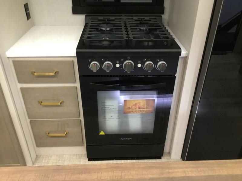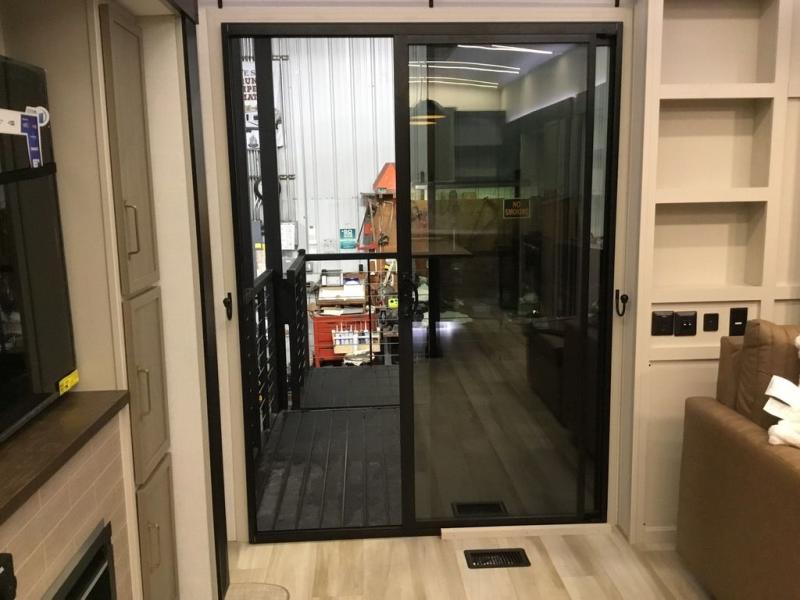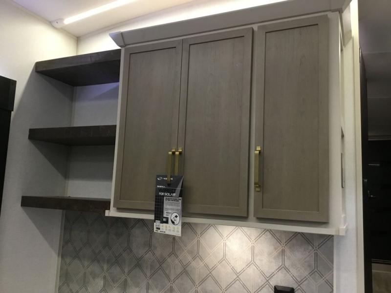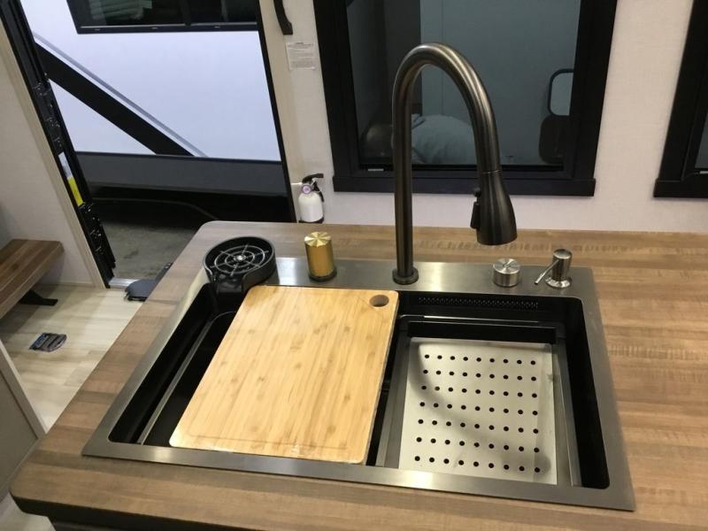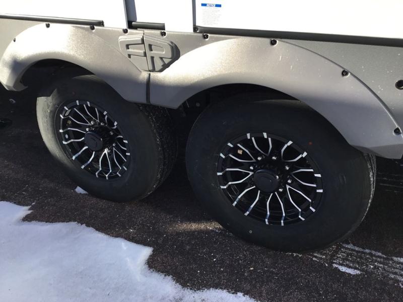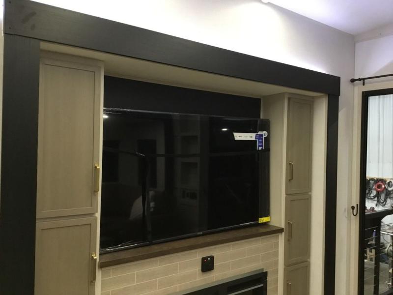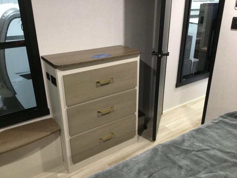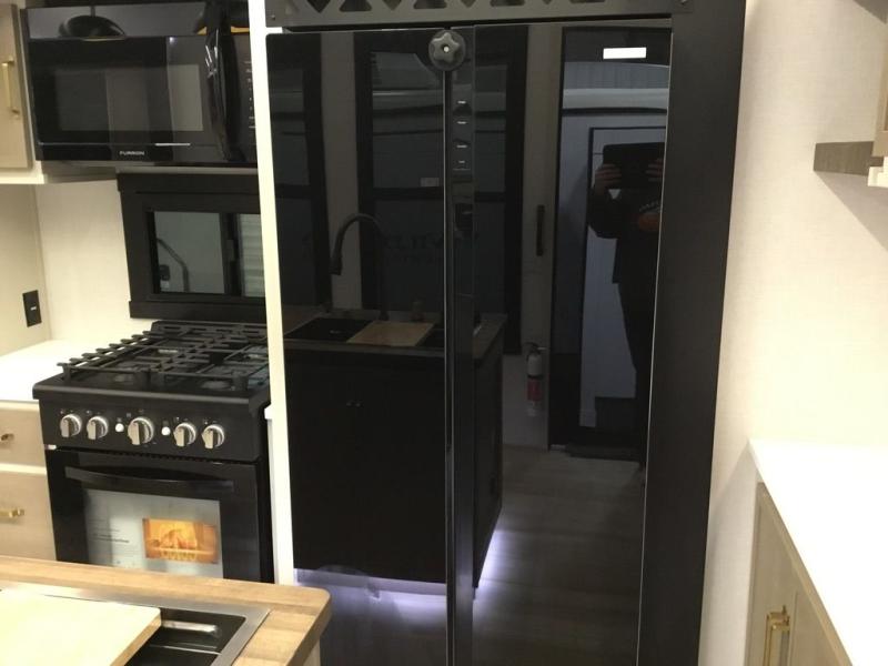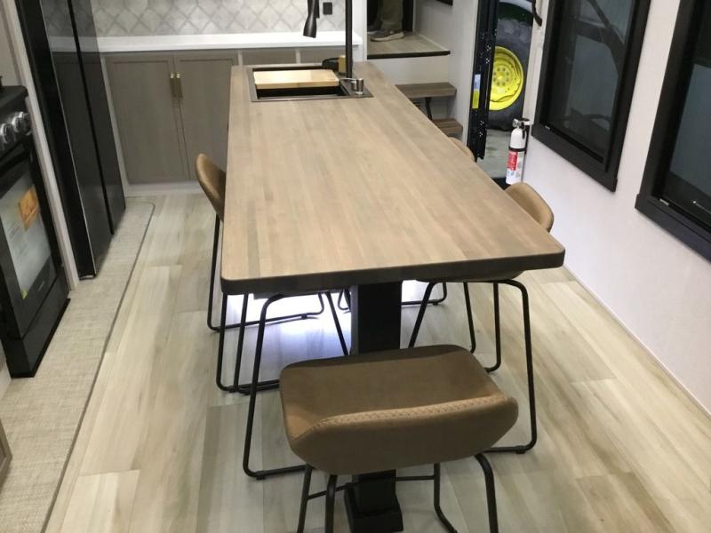 Camping trips and extended stays just got sweeter in this spacious fifth wheel! The rear veranda/porch with a kitchen lets you grill up some burgers as you visit in your camp chairs with friends. Once you head inside, you can make it a movie night since there is a sectional sofa with an ottoman across from the 65" TV and fireplace. A kitchen island with four chairs provides a place to dine together, and there is plenty of food storage between the pantry and 16 cu. ft. 12V refrigerator. You'll love having a custom king bed slide in the front bedroom, along with a dresser and a bench, a wardrobe, plus washer and dryer prep!