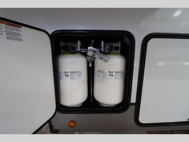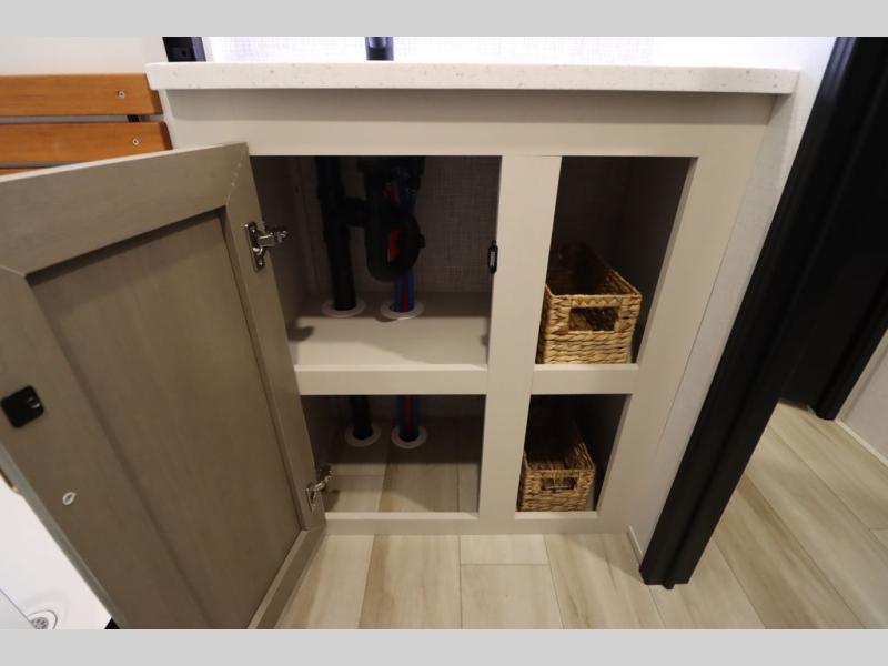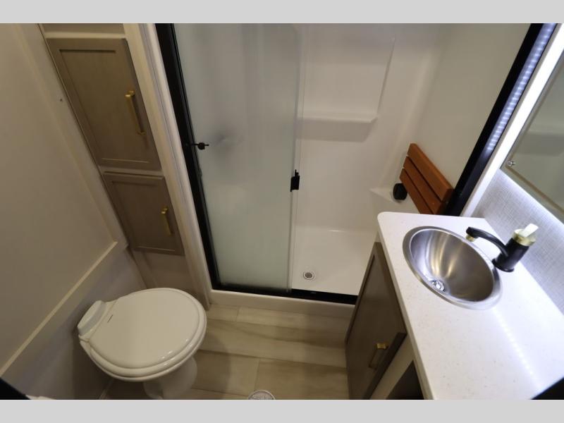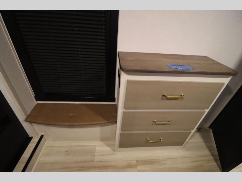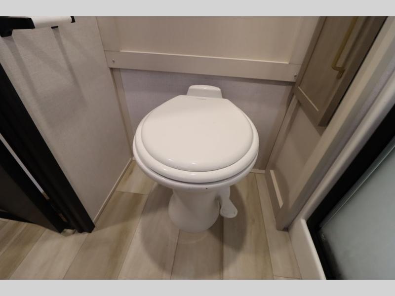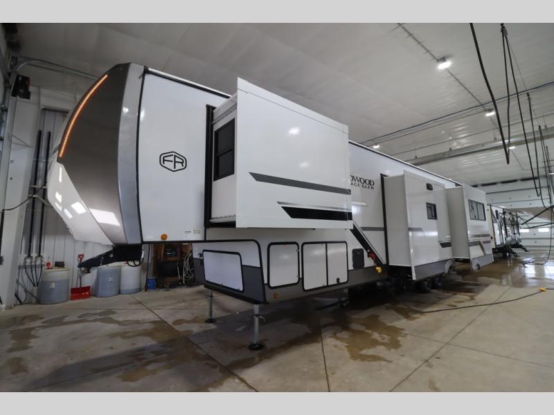 With any Wildwood Heritage Glen fifth wheel by Forest River, the quality construction, attention to detail and design along with a bright and welcoming interior allows you to relax in comfort with conveniences while exploring outdoors. The Summer Wind colored horizontal plank linoleum flooring is unique, beautiful and durable, and there are gold-accented faucets with stainless steel sinks in the bathrooms for added luxury. The Accessibelly underbelly with 12V tank heaters will help protect your unit from the elements, and the power stabilizer jacks and landing gear will make set-up a breeze. More features that provide convenience include the high-end solid surface countertops, an RV Airflow System that provides at least 25% better airflow, and solar prep for off-grid capabilities.