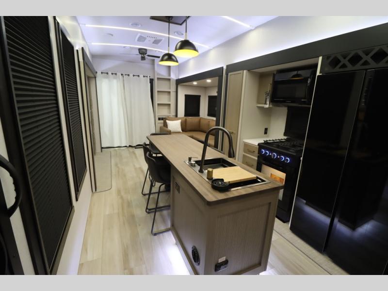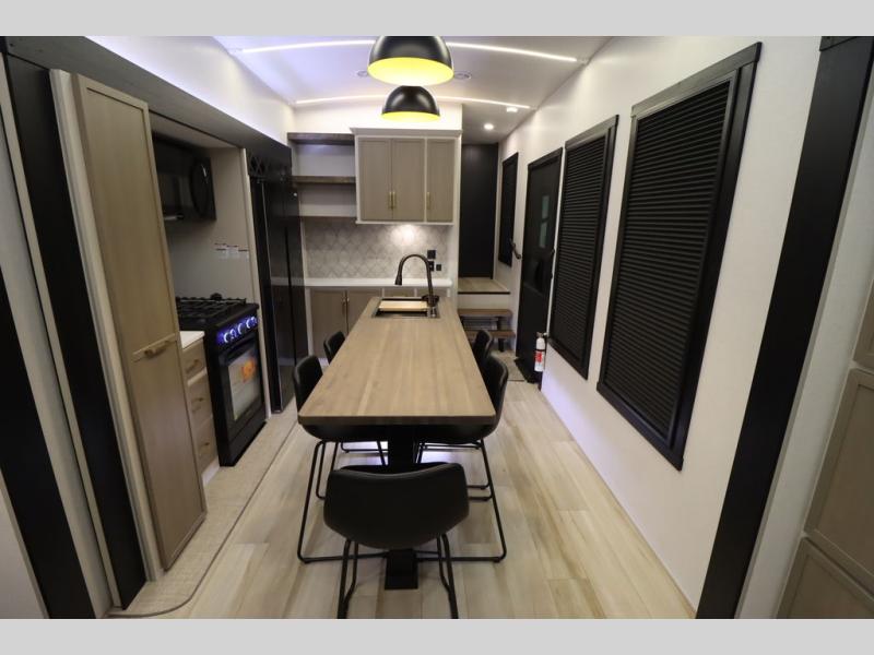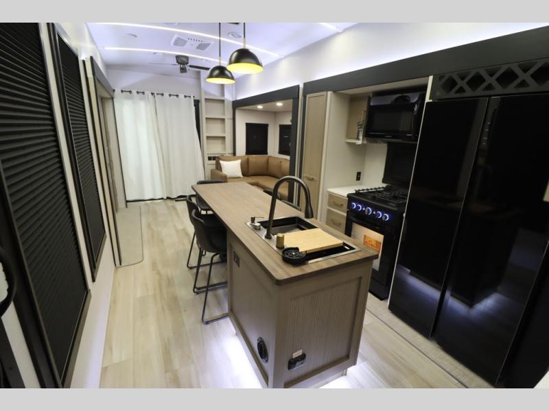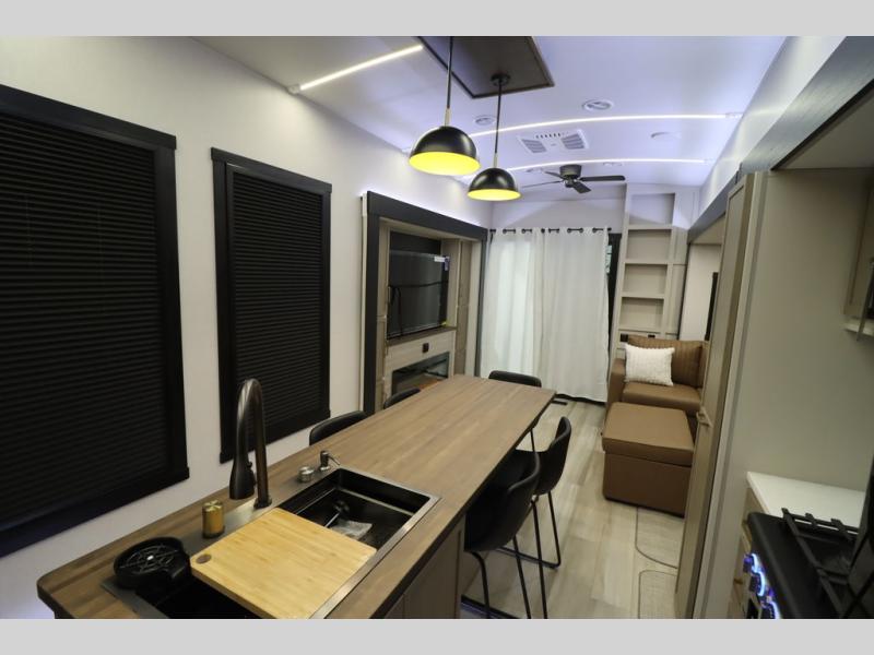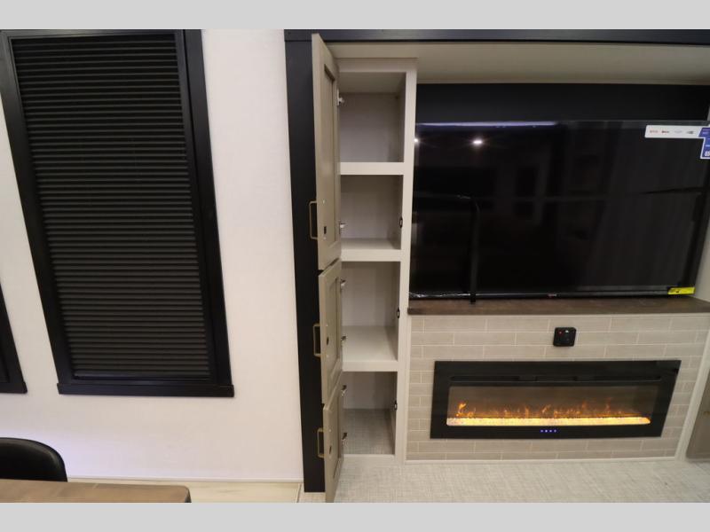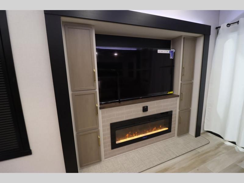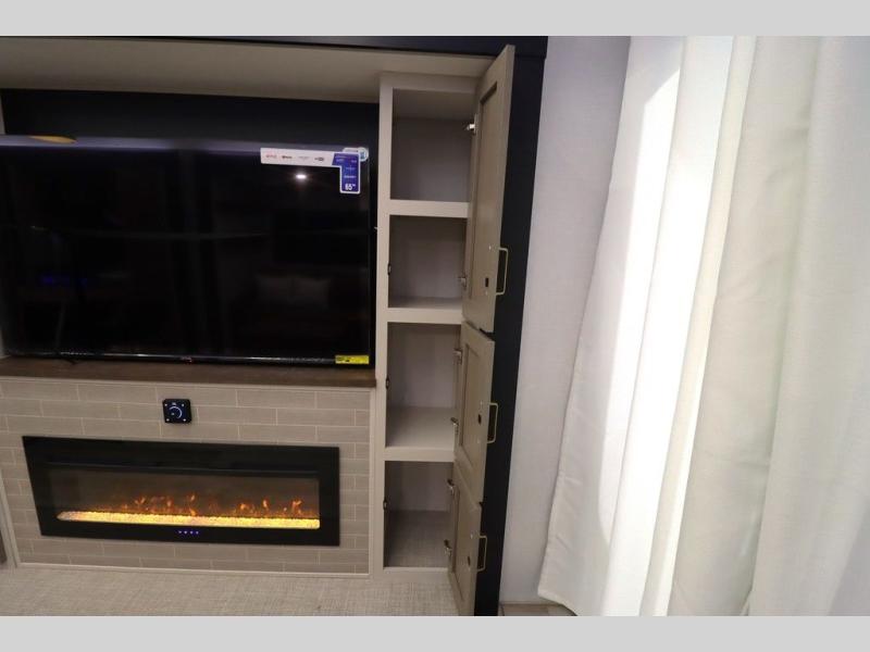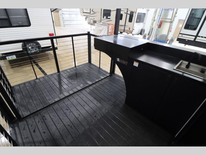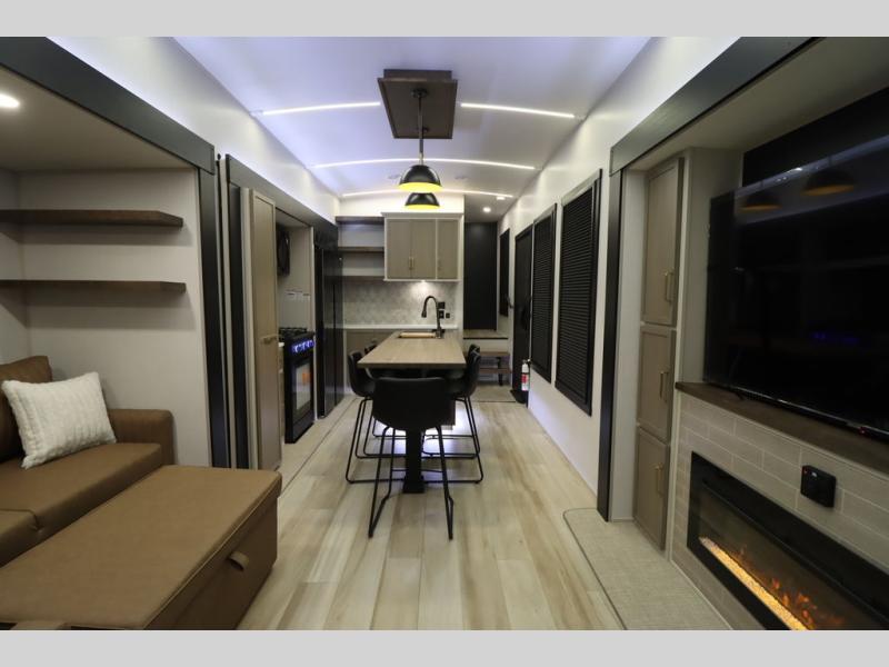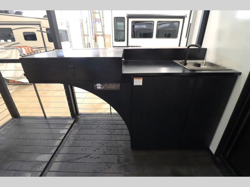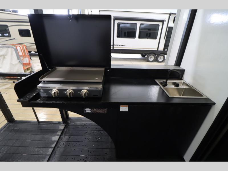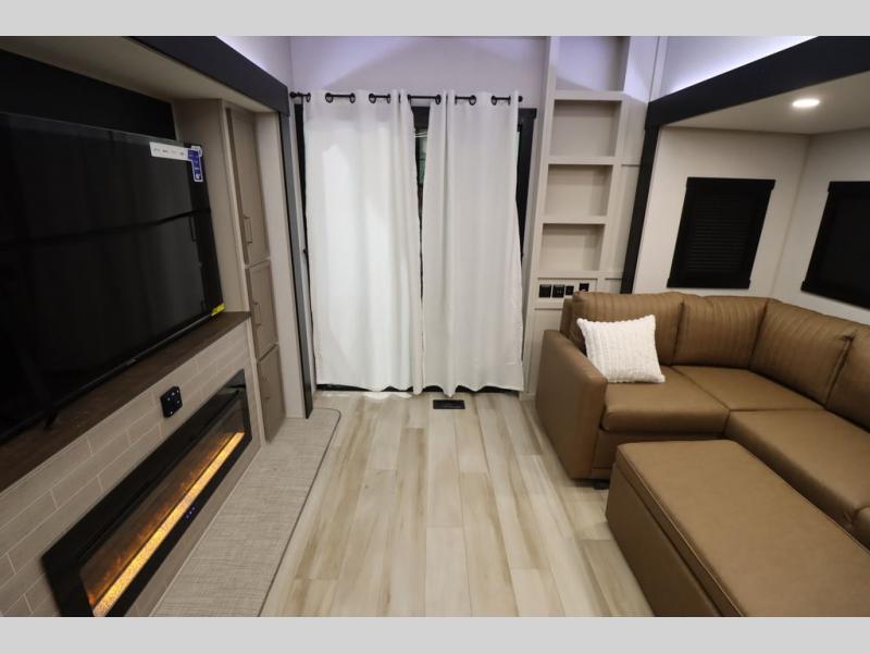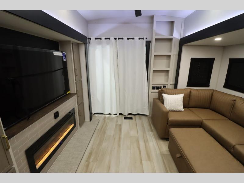 Camping trips and extended stays just got sweeter in this spacious fifth wheel! The rear veranda/porch with a kitchen lets you grill up some burgers as you visit in your camp chairs with friends. Once you head inside, you can make it a movie night since there is a sectional sofa with an ottoman across from the 65" TV and fireplace. A kitchen island with four chairs provides a place to dine together, and there is plenty of food storage between the pantry and 16 cu. ft. 12V refrigerator. You'll love having a custom king bed slide in the front bedroom, along with a dresser and a bench, a wardrobe, plus washer and dryer prep!