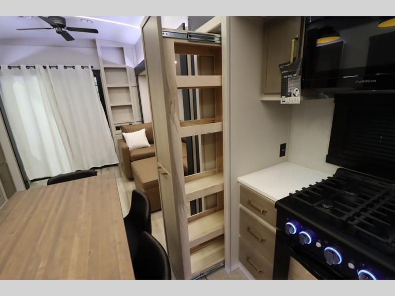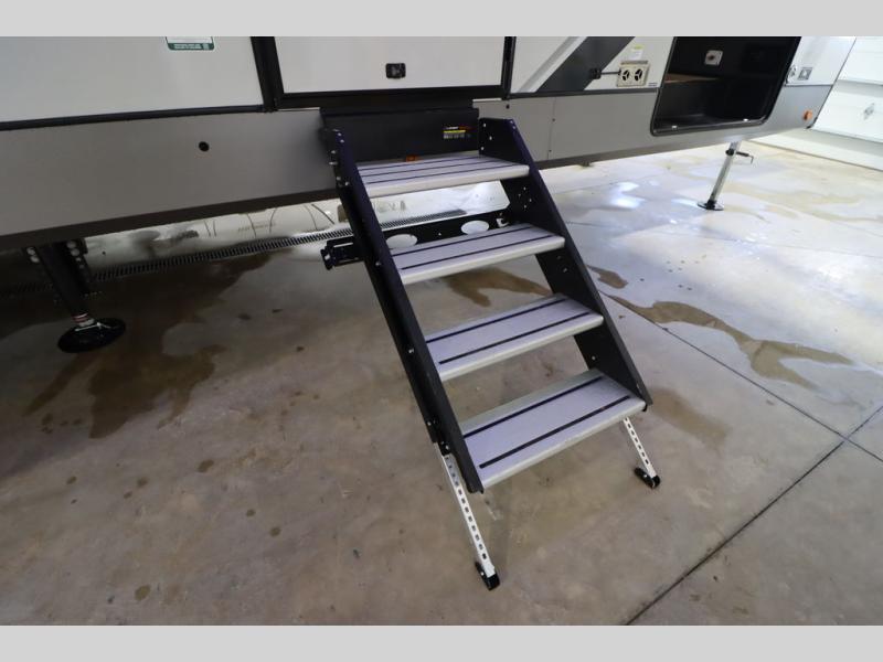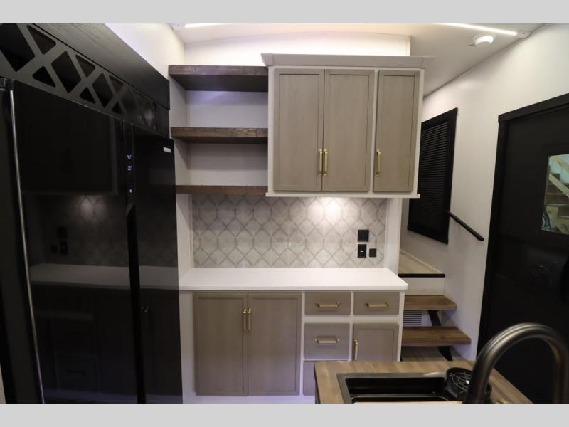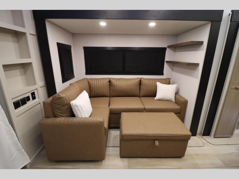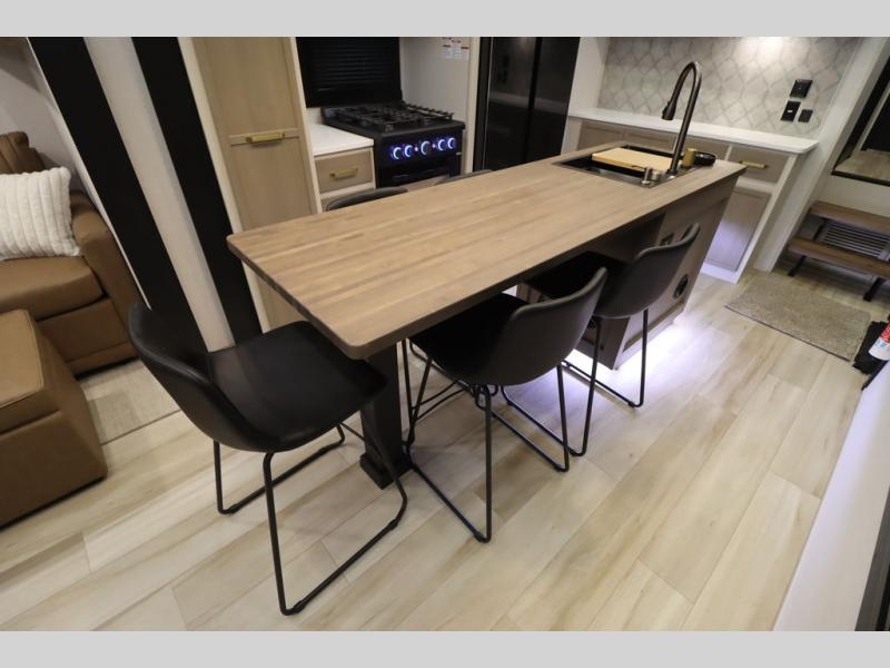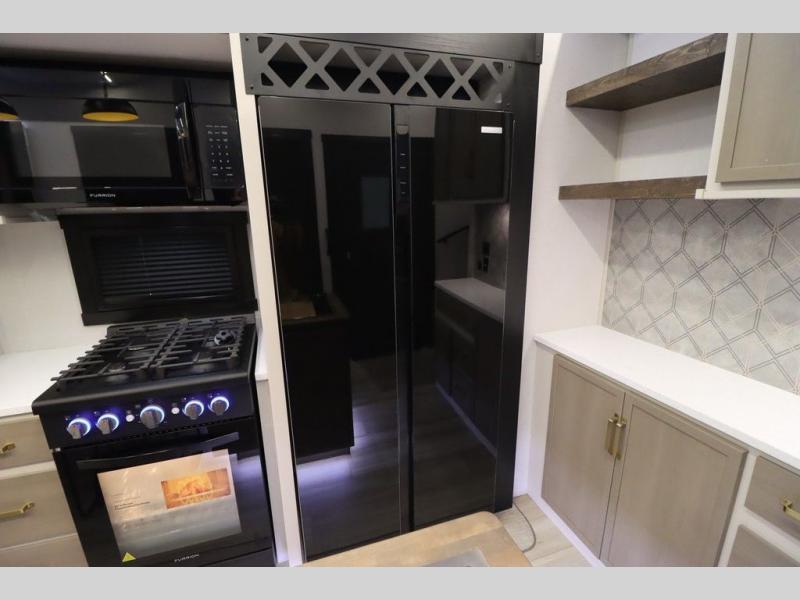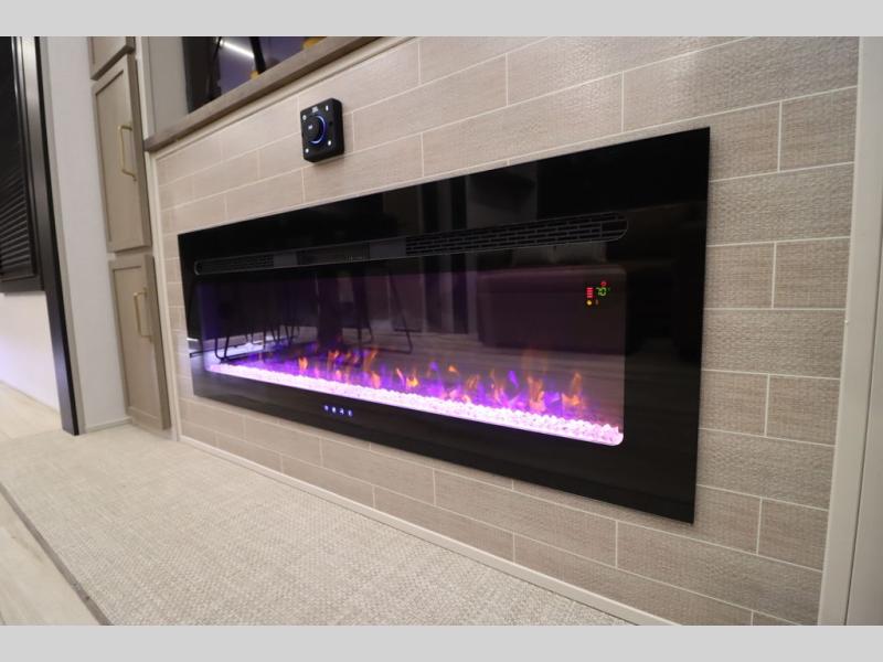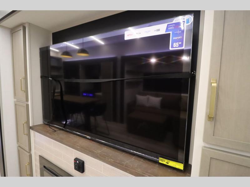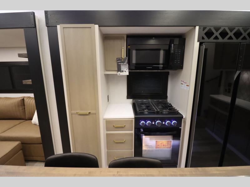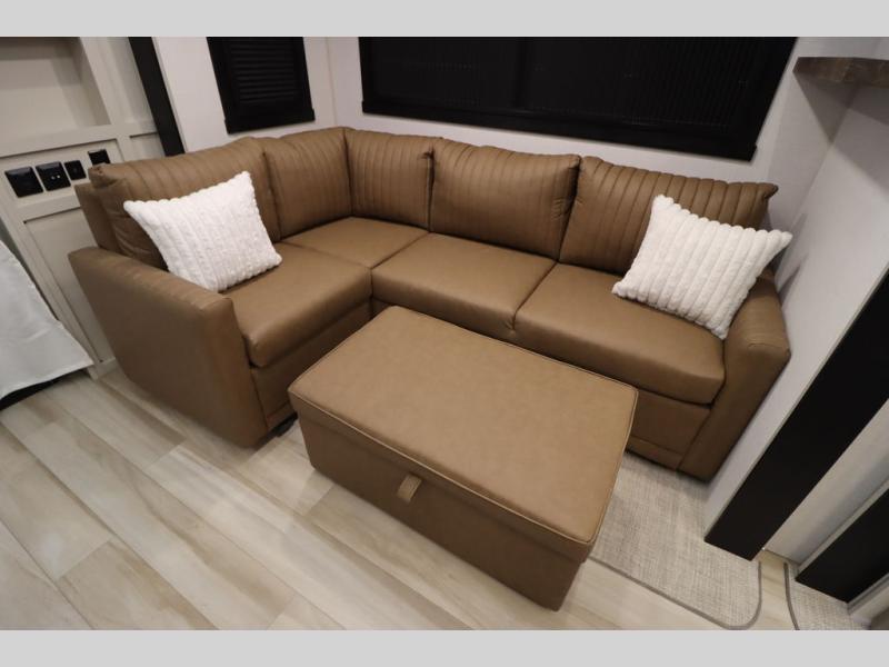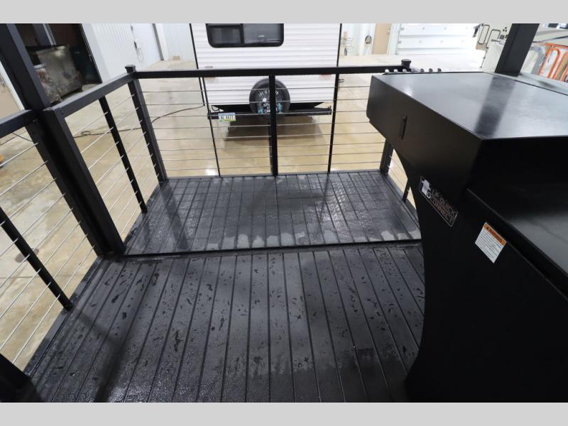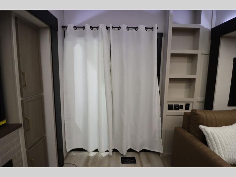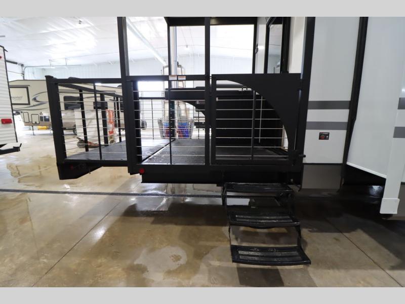 Camping trips and extended stays just got sweeter in this spacious fifth wheel! The rear veranda/porch with a kitchen lets you grill up some burgers as you visit in your camp chairs with friends. Once you head inside, you can make it a movie night since there is a sectional sofa with an ottoman across from the 65" TV and fireplace. A kitchen island with four chairs provides a place to dine together, and there is plenty of food storage between the pantry and 16 cu. ft. 12V refrigerator. You'll love having a custom king bed slide in the front bedroom, along with a dresser and a bench, a wardrobe, plus washer and dryer prep!