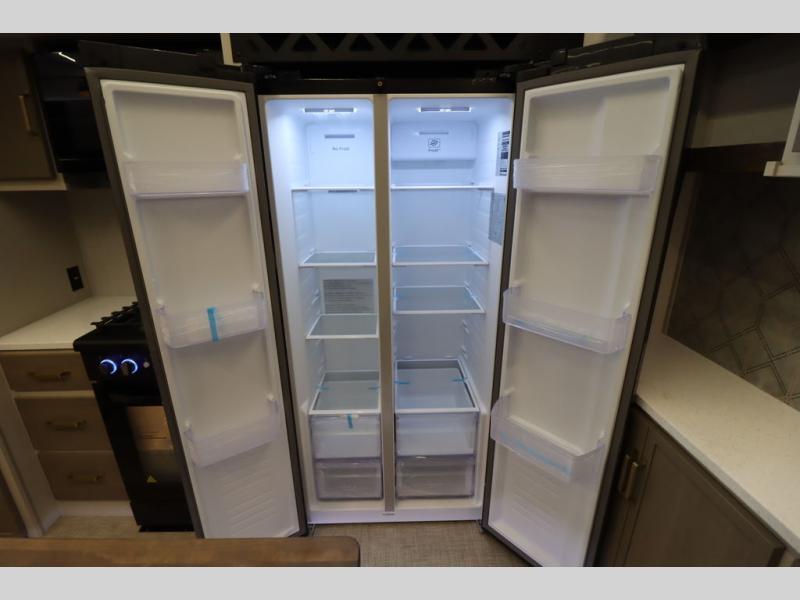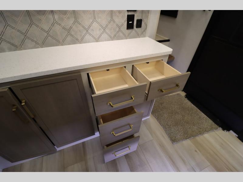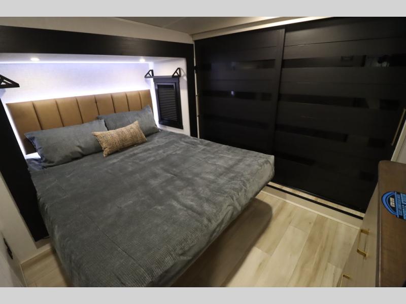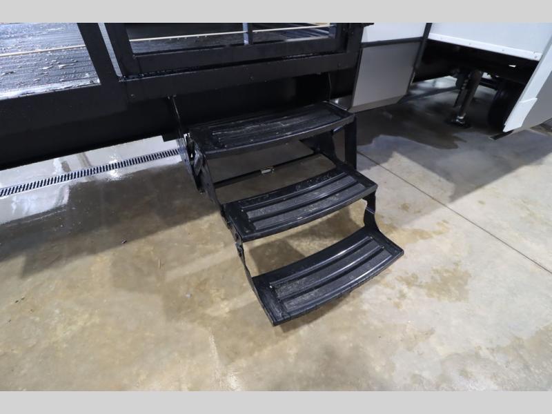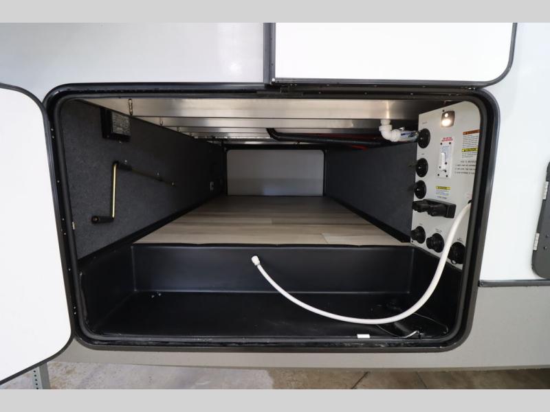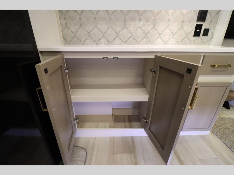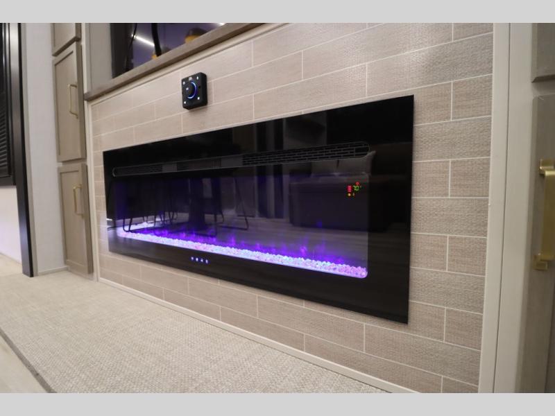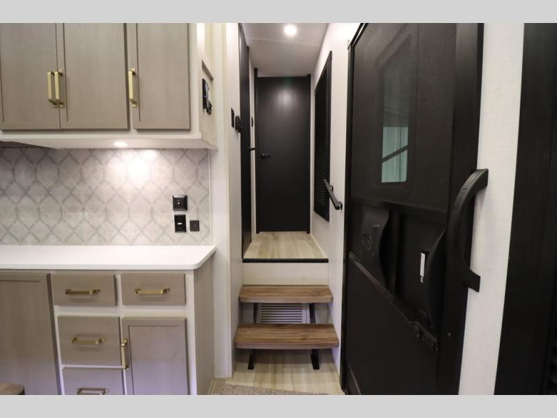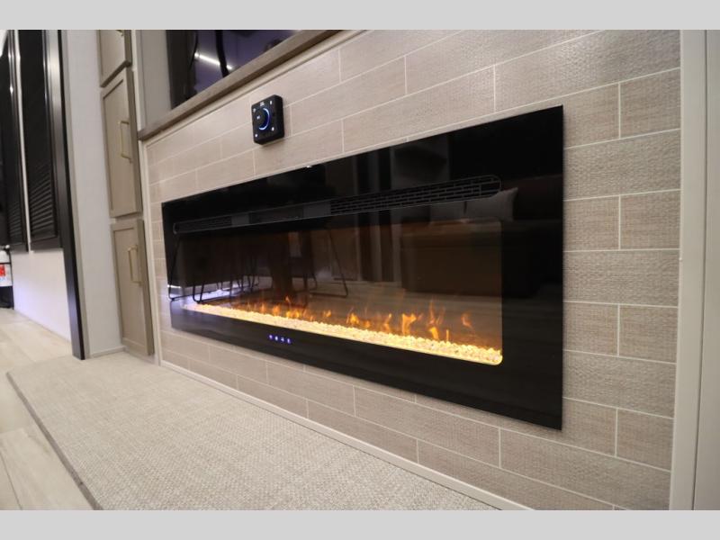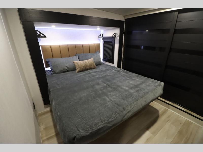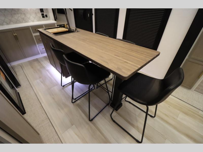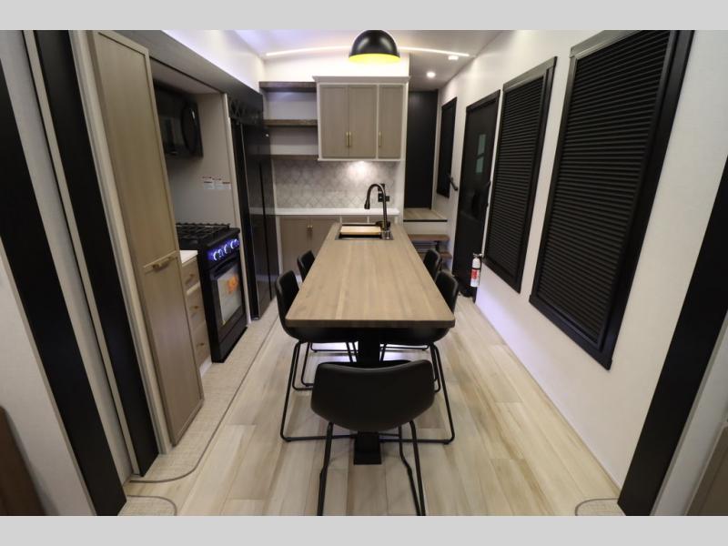 Camping trips and extended stays just got sweeter in this spacious fifth wheel! The rear veranda/porch with a kitchen lets you grill up some burgers as you visit in your camp chairs with friends. Once you head inside, you can make it a movie night since there is a sectional sofa with an ottoman across from the 65" TV and fireplace. A kitchen island with four chairs provides a place to dine together, and there is plenty of food storage between the pantry and 16 cu. ft. 12V refrigerator. You'll love having a custom king bed slide in the front bedroom, along with a dresser and a bench, a wardrobe, plus washer and dryer prep!