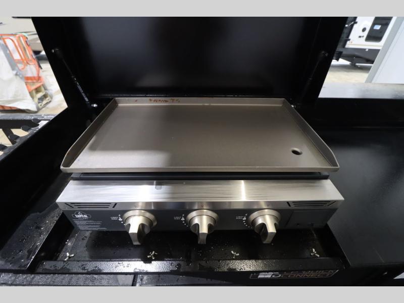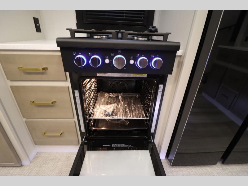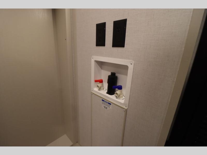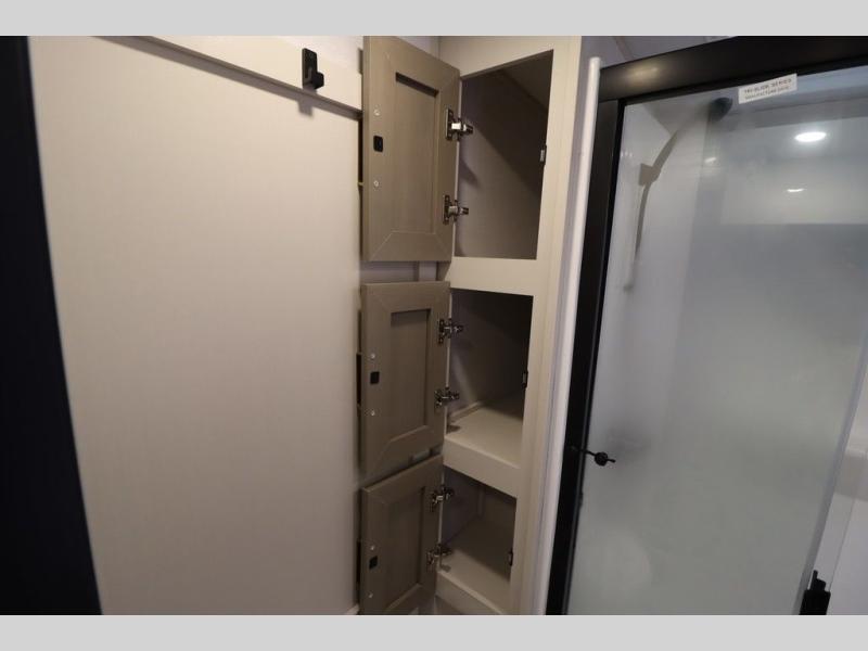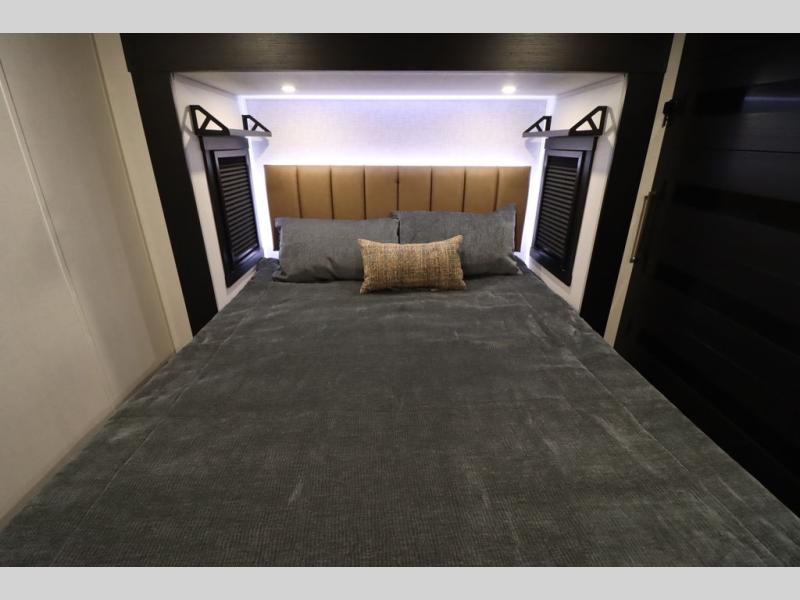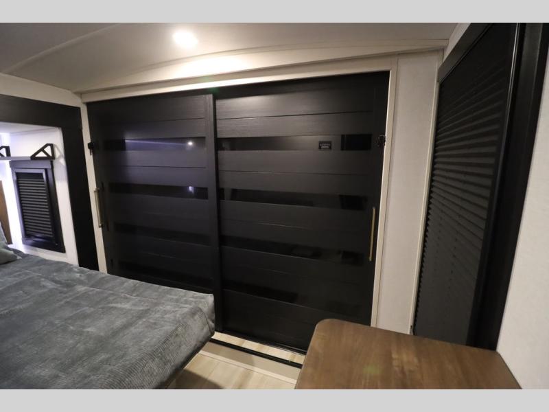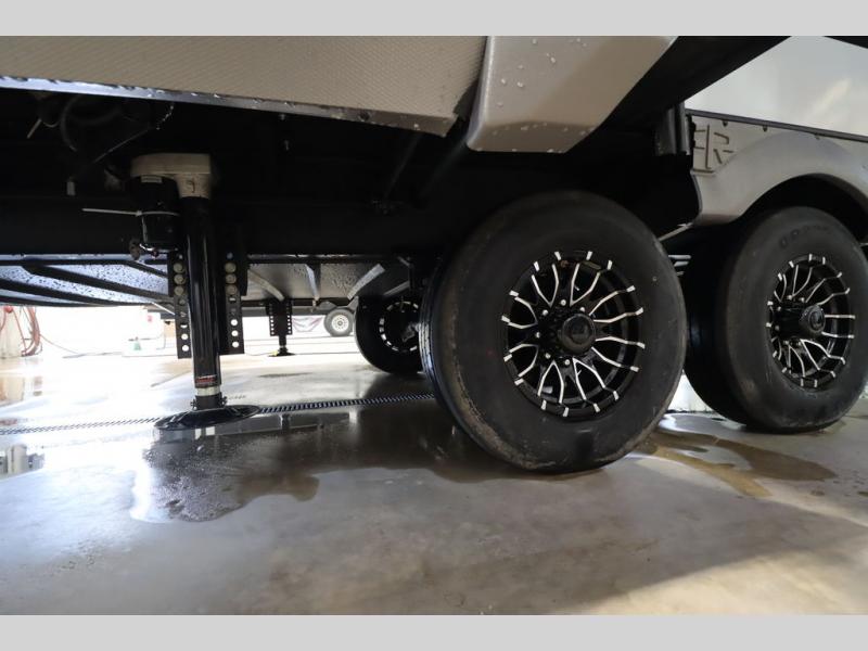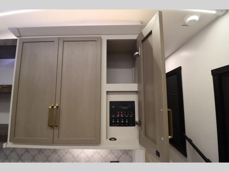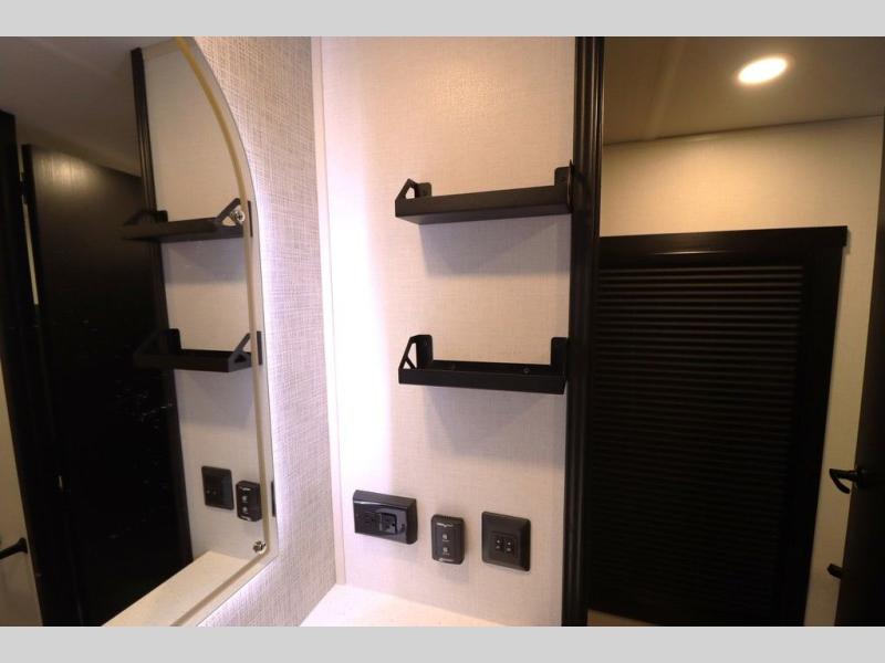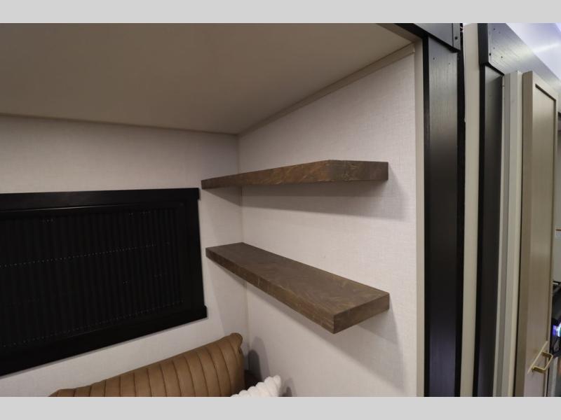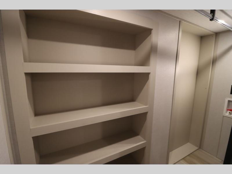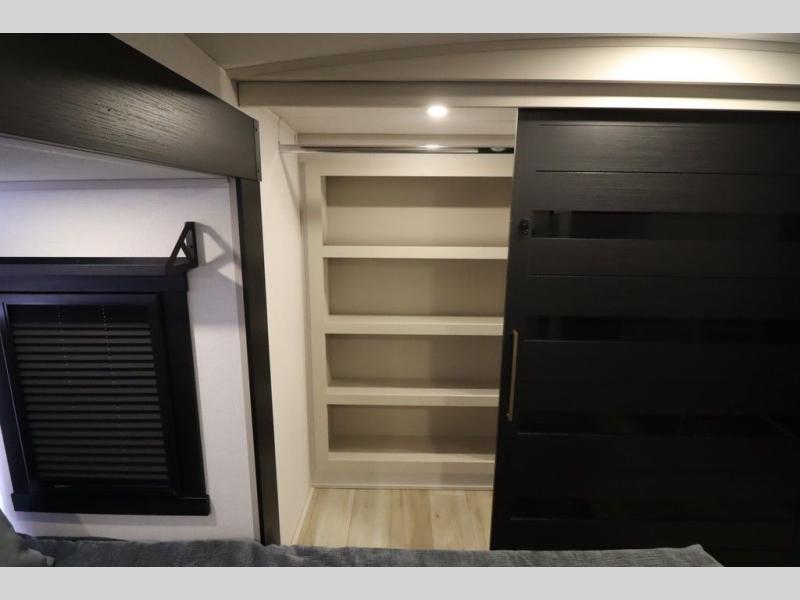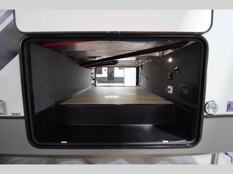 Camping trips and extended stays just got sweeter in this spacious fifth wheel! The rear veranda/porch with a kitchen lets you grill up some burgers as you visit in your camp chairs with friends. Once you head inside, you can make it a movie night since there is a sectional sofa with an ottoman across from the 65" TV and fireplace. A kitchen island with four chairs provides a place to dine together, and there is plenty of food storage between the pantry and 16 cu. ft. 12V refrigerator. You'll love having a custom king bed slide in the front bedroom, along with a dresser and a bench, a wardrobe, plus washer and dryer prep!