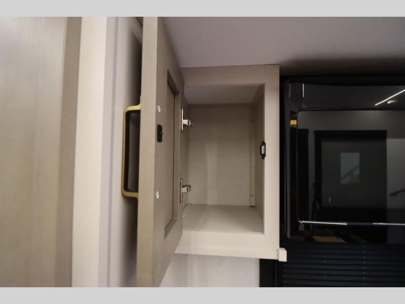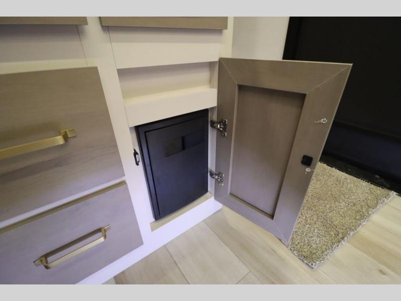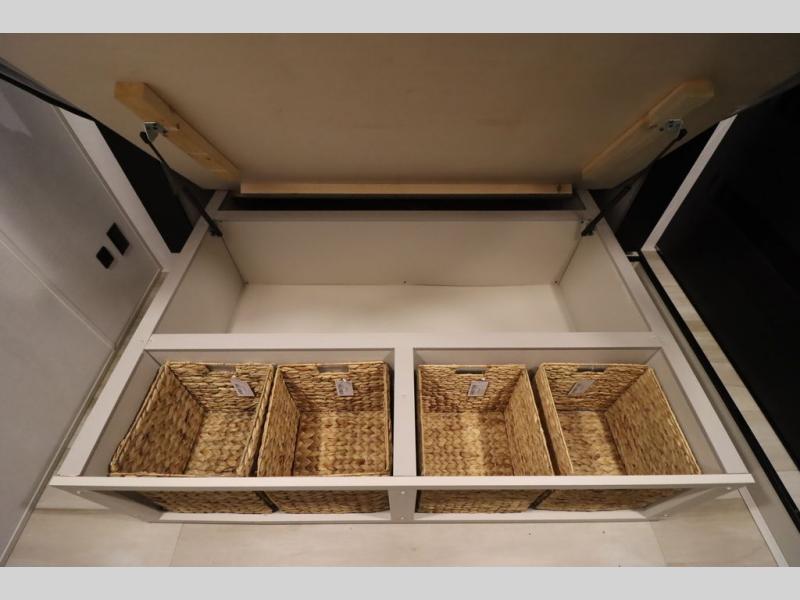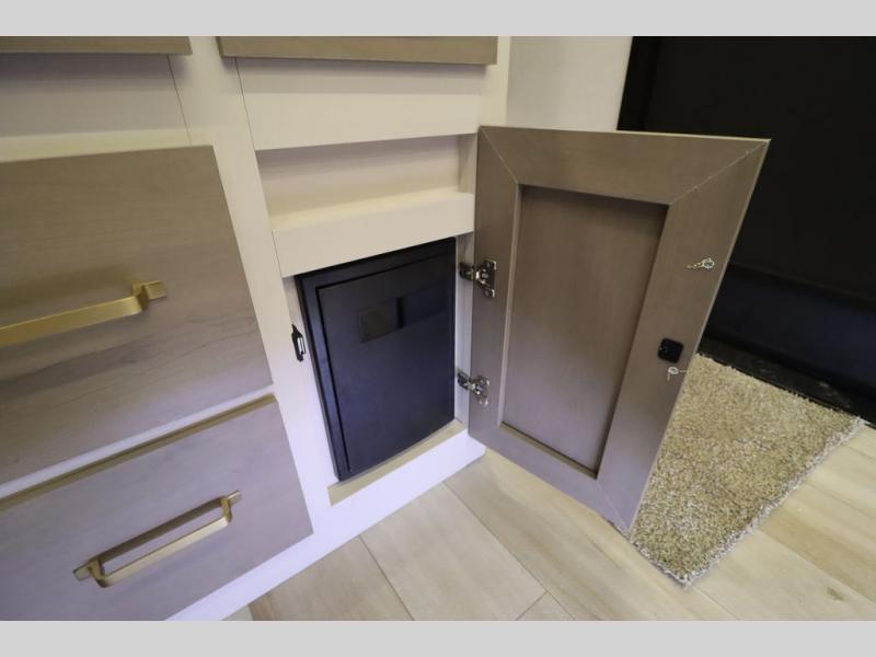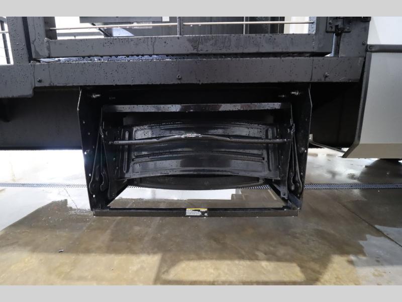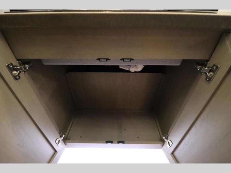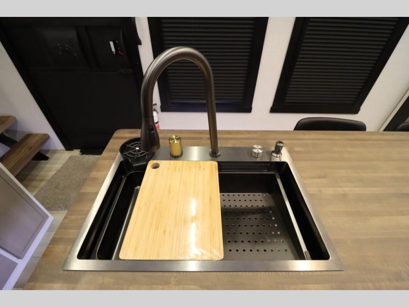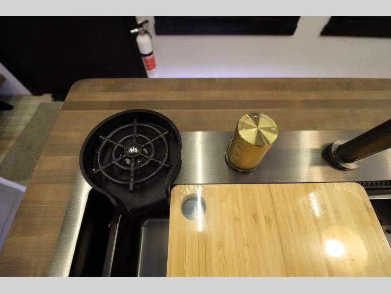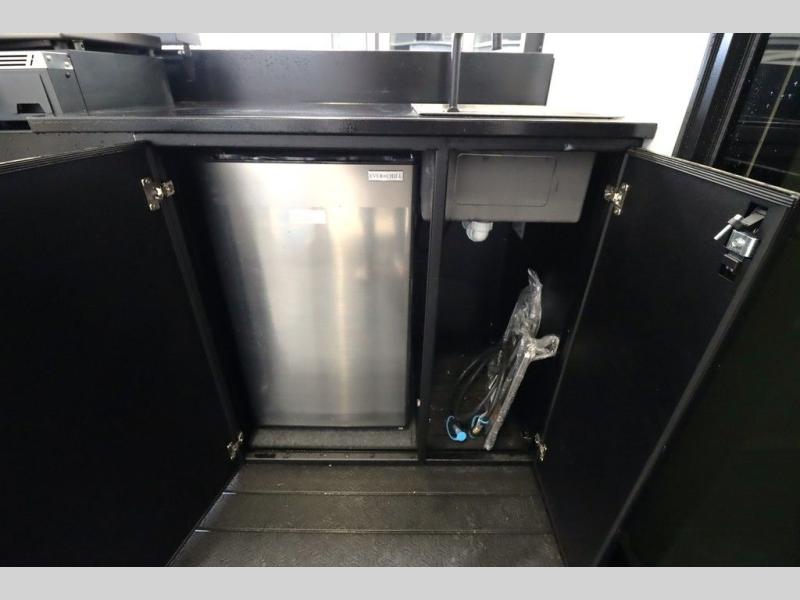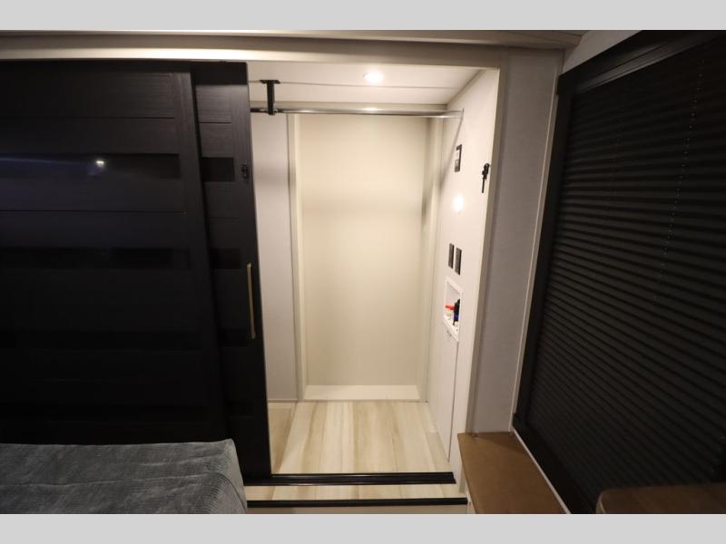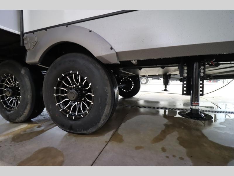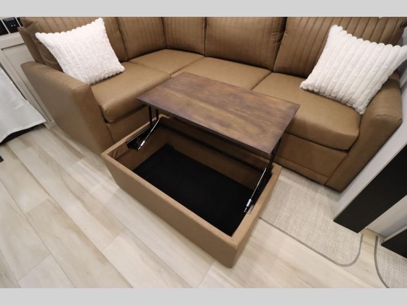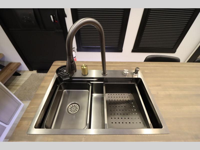 Camping trips and extended stays just got sweeter in this spacious fifth wheel! The rear veranda/porch with a kitchen lets you grill up some burgers as you visit in your camp chairs with friends. Once you head inside, you can make it a movie night since there is a sectional sofa with an ottoman across from the 65" TV and fireplace. A kitchen island with four chairs provides a place to dine together, and there is plenty of food storage between the pantry and 16 cu. ft. 12V refrigerator. You'll love having a custom king bed slide in the front bedroom, along with a dresser and a bench, a wardrobe, plus washer and dryer prep!