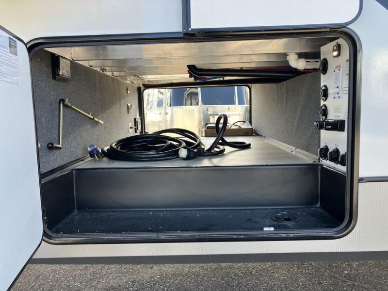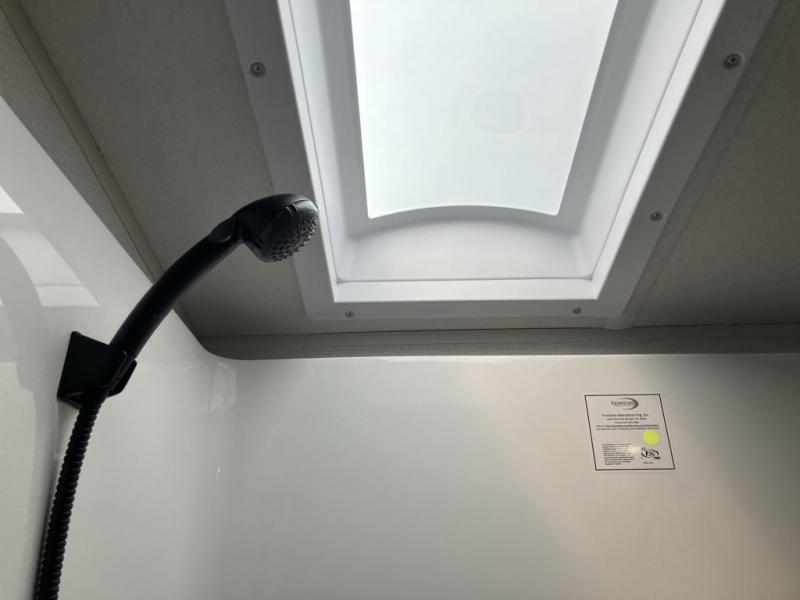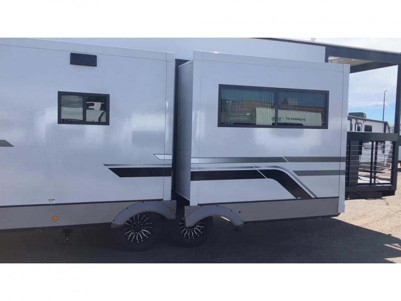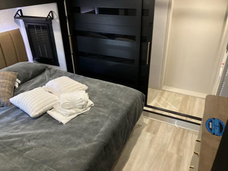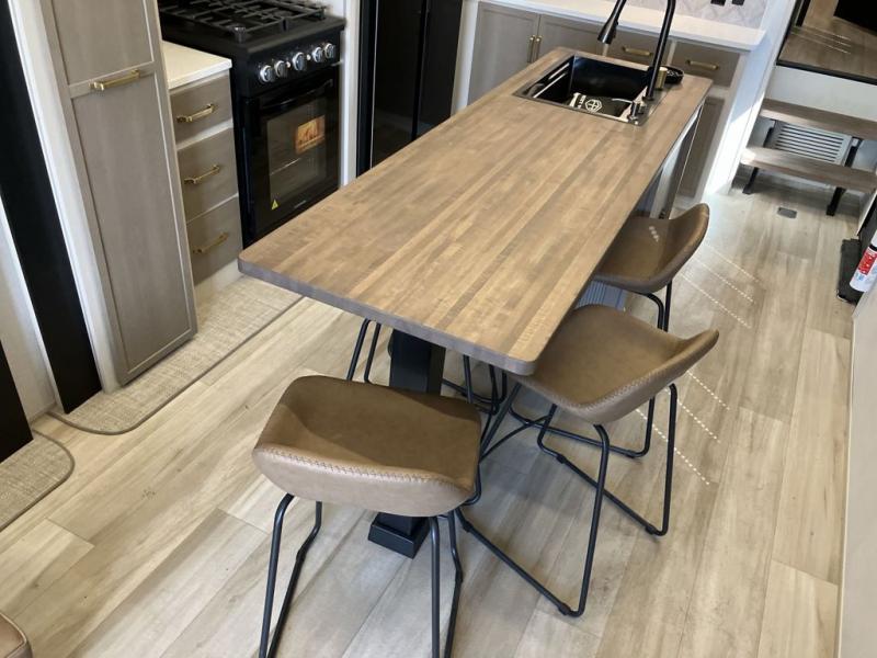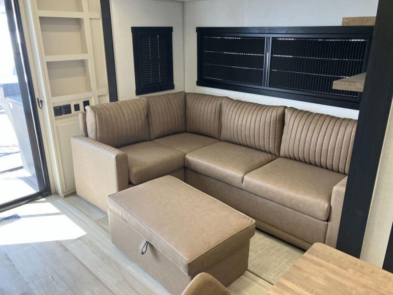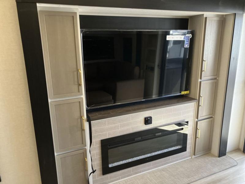 Camping trips and extended stays just got sweeter in this spacious fifth wheel! The rear veranda/porch with a kitchen lets you grill up some burgers as you visit in your camp chairs with friends. Once you head inside, you can make it a movie night since there is a sectional sofa with an ottoman across from the 65" TV and fireplace. A kitchen island with four chairs provides a place to dine together, and there is plenty of food storage between the pantry and 16 cu. ft. 12V refrigerator. You'll love having a custom king bed slide in the front bedroom, along with a dresser and a bench, a wardrobe, plus washer and dryer prep!