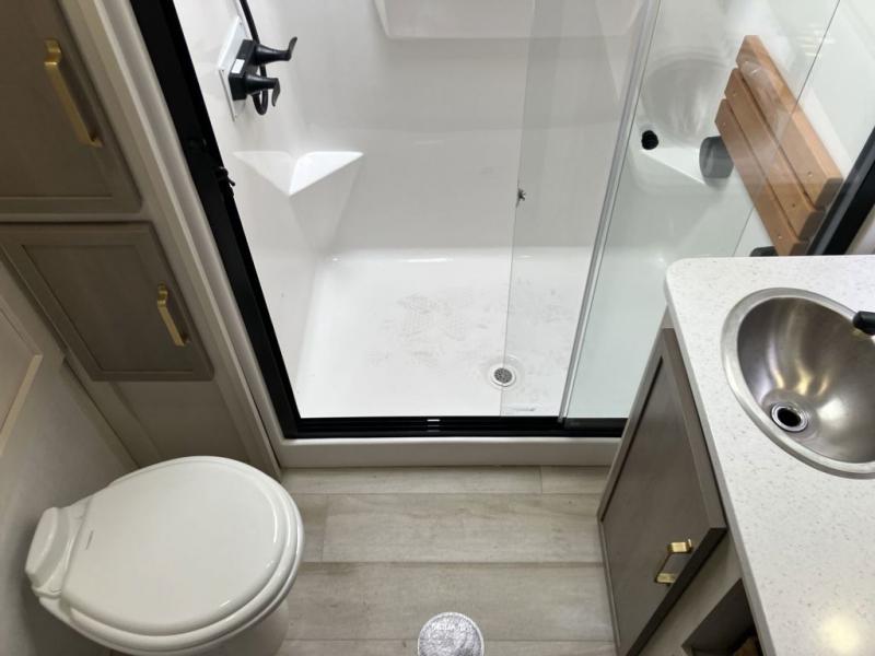 With any Wildwood Heritage Glen fifth wheel by Forest River, the quality construction, attention to detail and design along with a bright and welcoming interior allows you to relax in comfort with conveniences while exploring outdoors. The Summer Wind colored horizontal plank linoleum flooring is unique, beautiful and durable, and there are gold-accented faucets with stainless steel sinks in the bathrooms for added luxury. The Accessibelly underbelly with 12V tank heaters will help protect your unit from the elements, and the power stabilizer jacks and landing gear will make set-up a breeze. More features that provide convenience include the high-end solid surface countertops, an RV Airflow System that provides at least 25% better airflow, and solar prep for off-grid capabilities.
