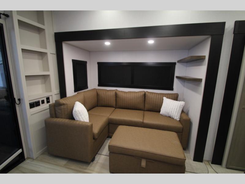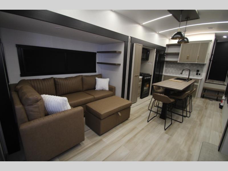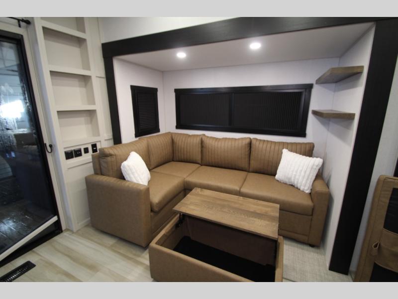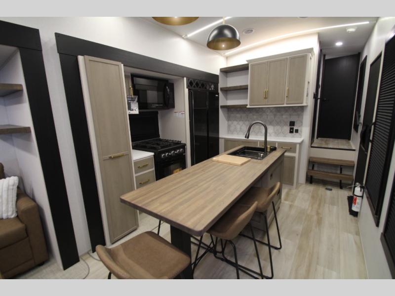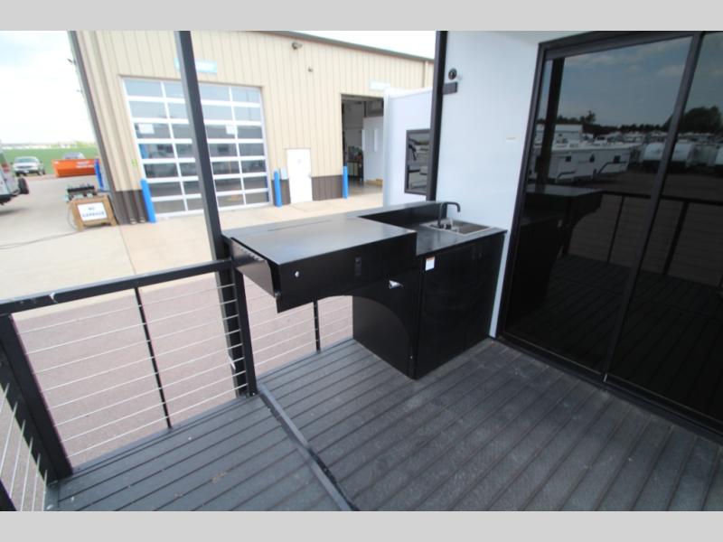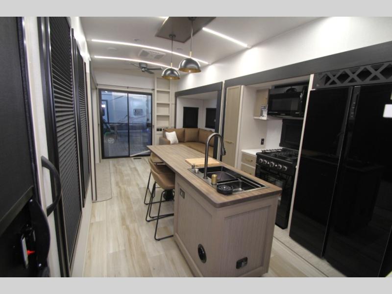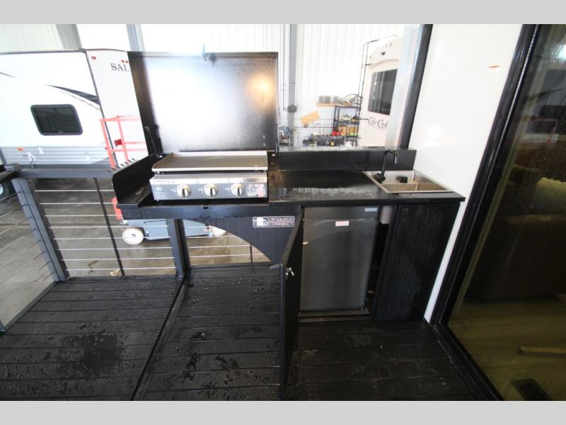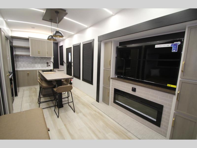 Camping trips and extended stays just got sweeter in this spacious fifth wheel! The rear veranda/porch with a kitchen lets you grill up some burgers as you visit in your camp chairs with friends. Once you head inside, you can make it a movie night since there is a sectional sofa with an ottoman across from the 65" TV and fireplace. A kitchen island with four chairs provides a place to dine together, and there is plenty of food storage between the pantry and 16 cu. ft. 12V refrigerator. You'll love having a custom king bed slide in the front bedroom, along with a dresser and a bench, a wardrobe, plus washer and dryer prep!