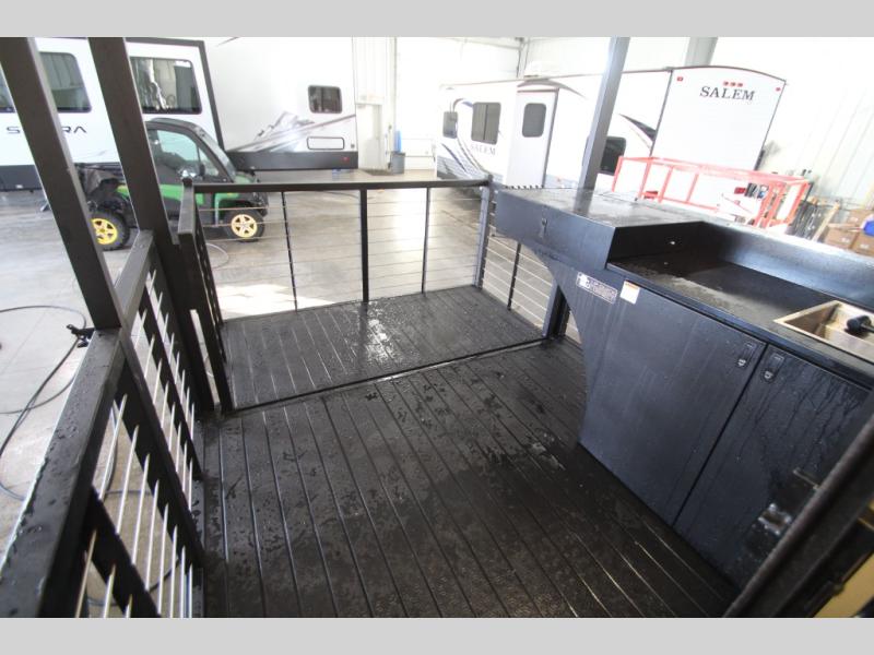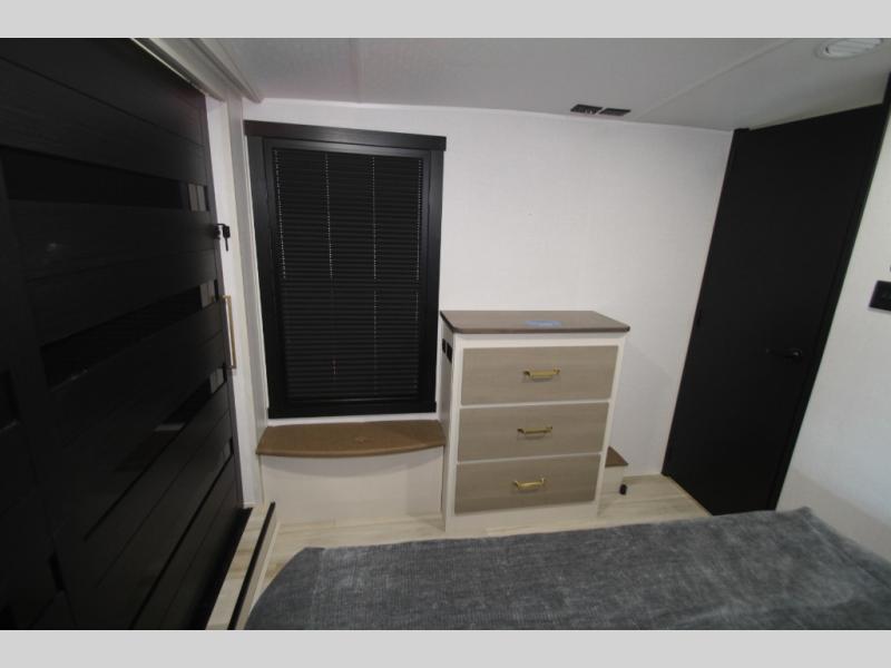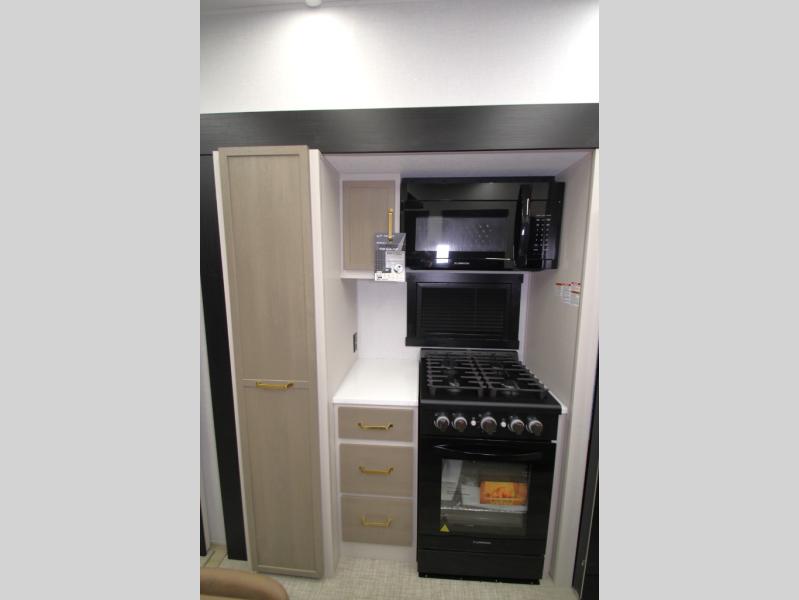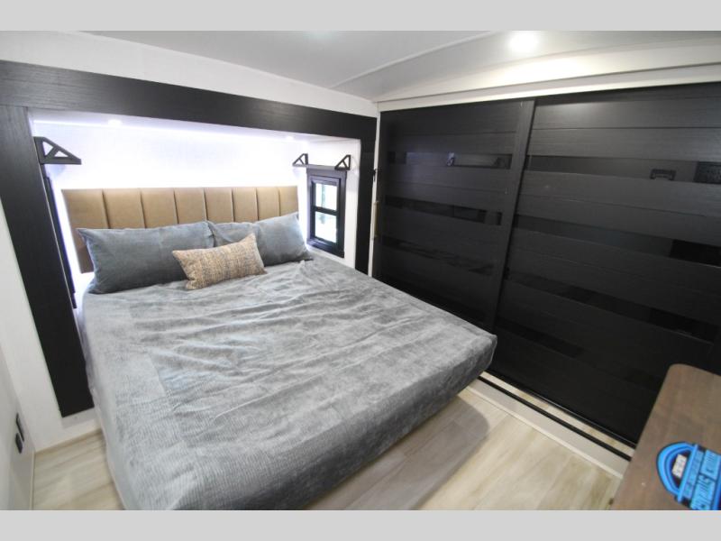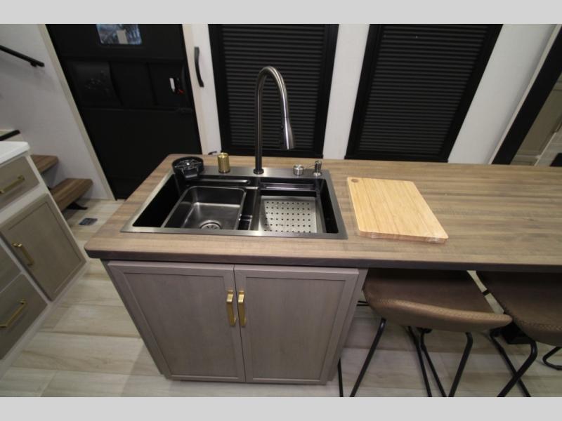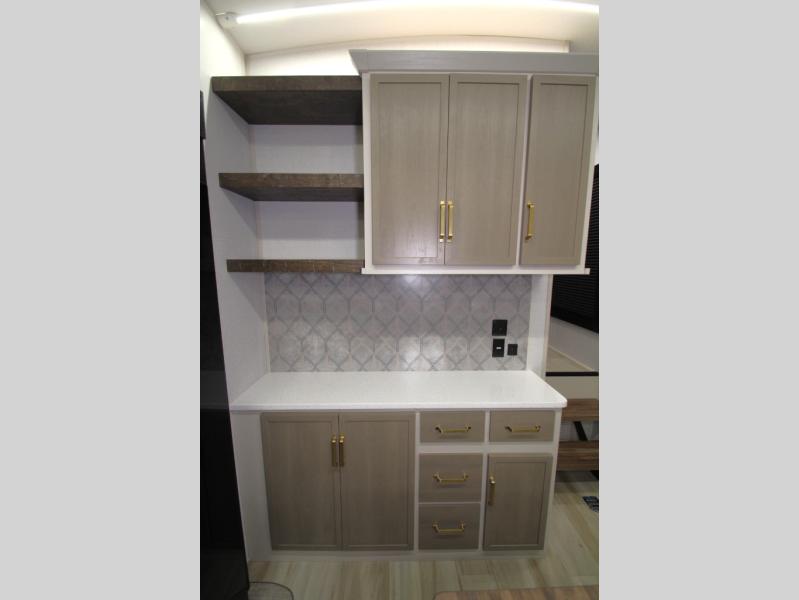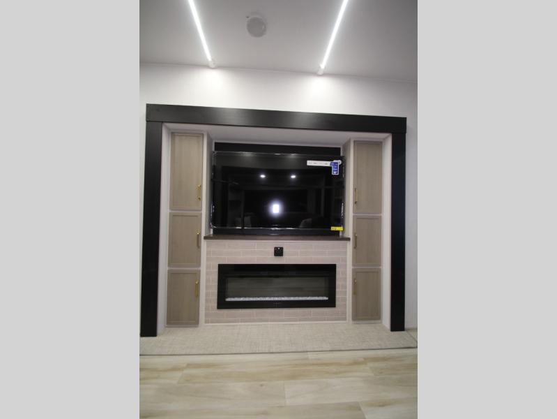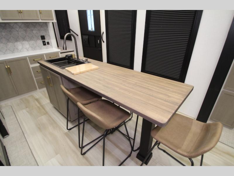 Camping trips and extended stays just got sweeter in this spacious fifth wheel! The rear veranda/porch with a kitchen lets you grill up some burgers as you visit in your camp chairs with friends. Once you head inside, you can make it a movie night since there is a sectional sofa with an ottoman across from the 65" TV and fireplace. A kitchen island with four chairs provides a place to dine together, and there is plenty of food storage between the pantry and 16 cu. ft. 12V refrigerator. You'll love having a custom king bed slide in the front bedroom, along with a dresser and a bench, a wardrobe, plus washer and dryer prep!