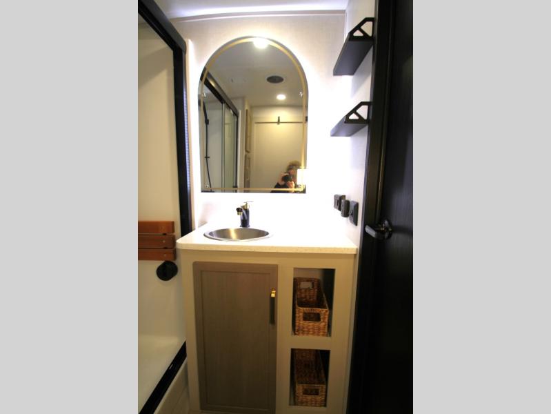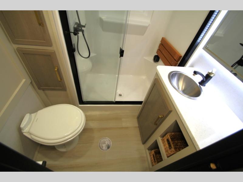 With any Wildwood Heritage Glen fifth wheel by Forest River, the quality construction, attention to detail and design along with a bright and welcoming interior allows you to relax in comfort with conveniences while exploring outdoors. The Summer Wind colored horizontal plank linoleum flooring is unique, beautiful and durable, and there are gold-accented faucets with stainless steel sinks in the bathrooms for added luxury. The Accessibelly underbelly with 12V tank heaters will help protect your unit from the elements, and the power stabilizer jacks and landing gear will make set-up a breeze. More features that provide convenience include the high-end solid surface countertops, an RV Airflow System that provides at least 25% better airflow, and solar prep for off-grid capabilities.