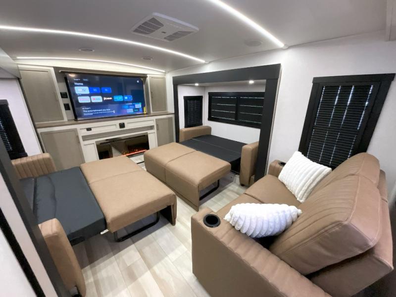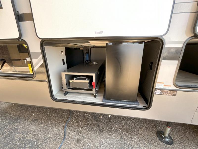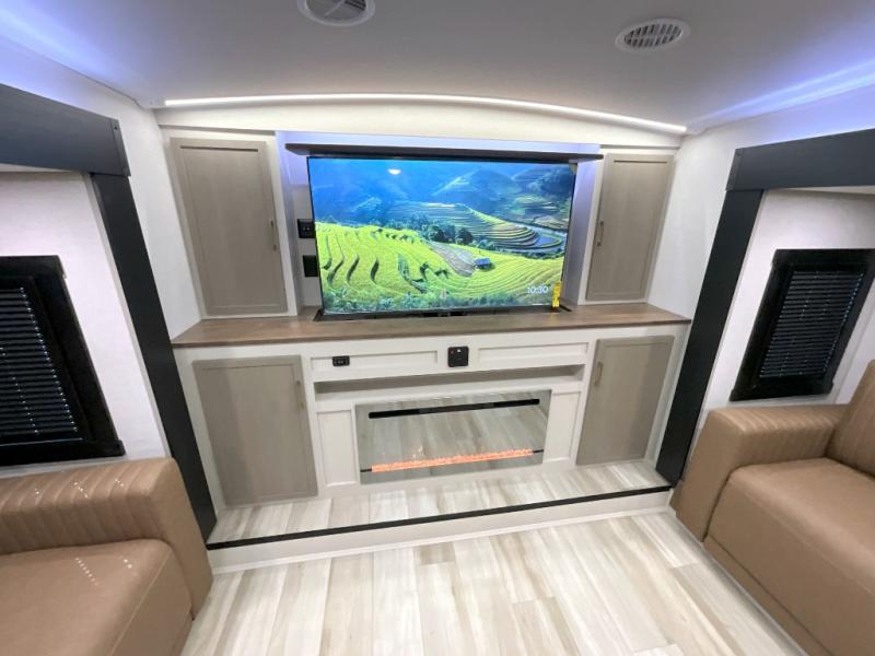 Invite the grandkids or your neighbor friends for your next camping trip in this Wildwood Heritage Glen Elite fifth wheel that features a front entertainment center and living area. Your guests will love the two tri-fold sofas within dual opposing slides to make the room their own. You'll also enjoy theatre seats and a fireplace for an even more at-home feel. The large pantry in the kitchen is very handy as well as the breakfast bar with swivel bar stools. This unit also includes a full and half bath for your convenience, and a king bed with Versa-Tilt on an Elite extra-wide bed slide in the private bedroom. There is abundant storage with multiple pass-through compartments included, so you don't have to leave any of your larger gear behind. Outdoors, you can also enjoy the 20' awning, the strut-assisted steps when entering and exiting, and the Elite outdoor bar and entertainment center which includes a 32" TV, a griddle, and a refrigerator.