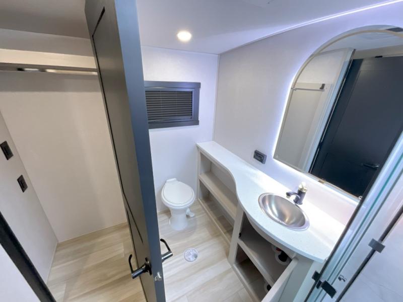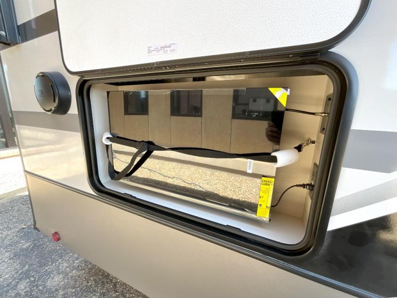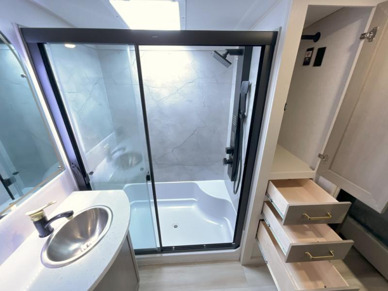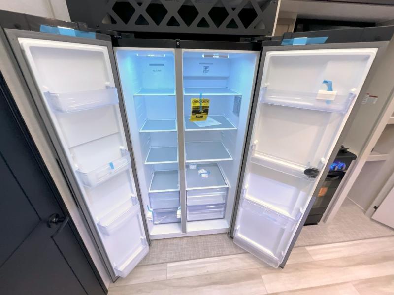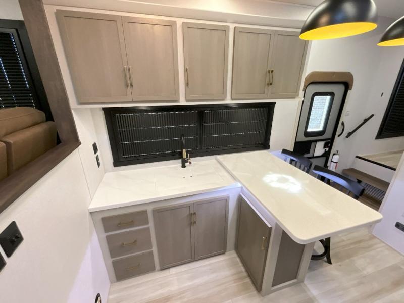 Each Wildwood Heritage Glen Elite Series fifth wheel by Forest River is constructed with vacuum bonded "Aluma Frame" sidewalls and floor, block foam insulation, and an AccessiBelly underbelly with 12V tank heaters on all holding tanks to help extend your camping season. There is an exterior docking station with hot and cold water, along with power stabilizer jacks and landing gear, and Goodyear radial tires with black accented rims. There is also an in-line water filtration system, an RV Airflow system, and an extra large pass-through storage with Slam Latch baggage doors and magnetic catches for hassle-free packing. You will love the high-end solid surface countertops inside, along with gold-accented faucets with stainless steel sinks in all bathrooms, and European oak colored horizontal plank linoleum flooring that is both stylish and easy to keep clean!