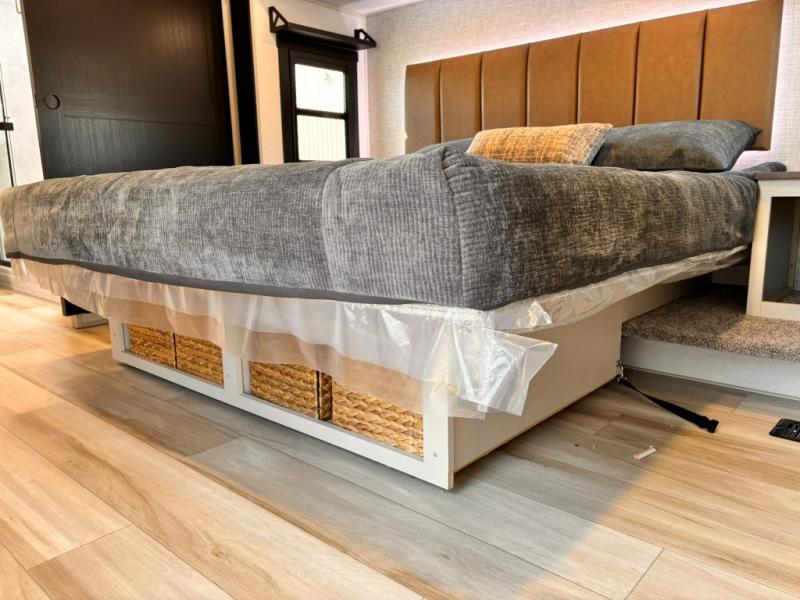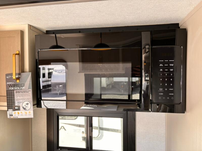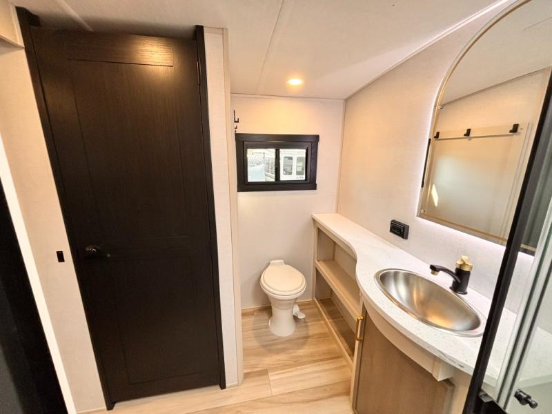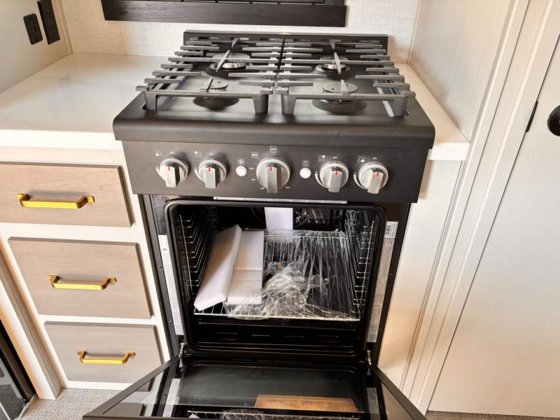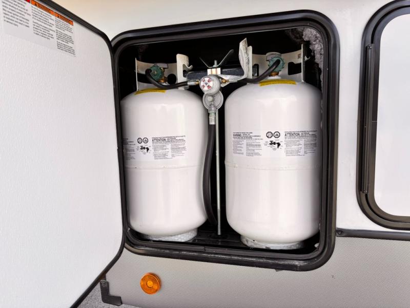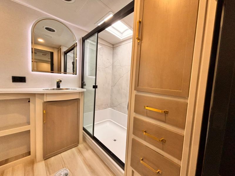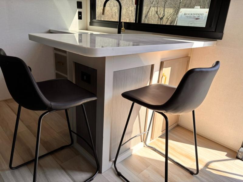 Each Wildwood Heritage Glen Elite Series fifth wheel by Forest River is constructed with vacuum bonded "Aluma Frame" sidewalls and floor, block foam insulation, and an AccessiBelly underbelly with 12V tank heaters on all holding tanks to help extend your camping season. There is an exterior docking station with hot and cold water, along with power stabilizer jacks and landing gear, and Goodyear radial tires with black accented rims. There is also an in-line water filtration system, an RV Airflow system, and an extra large pass-through storage with Slam Latch baggage doors and magnetic catches for hassle-free packing. You will love the high-end solid surface countertops inside, along with gold-accented faucets with stainless steel sinks in all bathrooms, and European oak colored horizontal plank linoleum flooring that is both stylish and easy to keep clean!