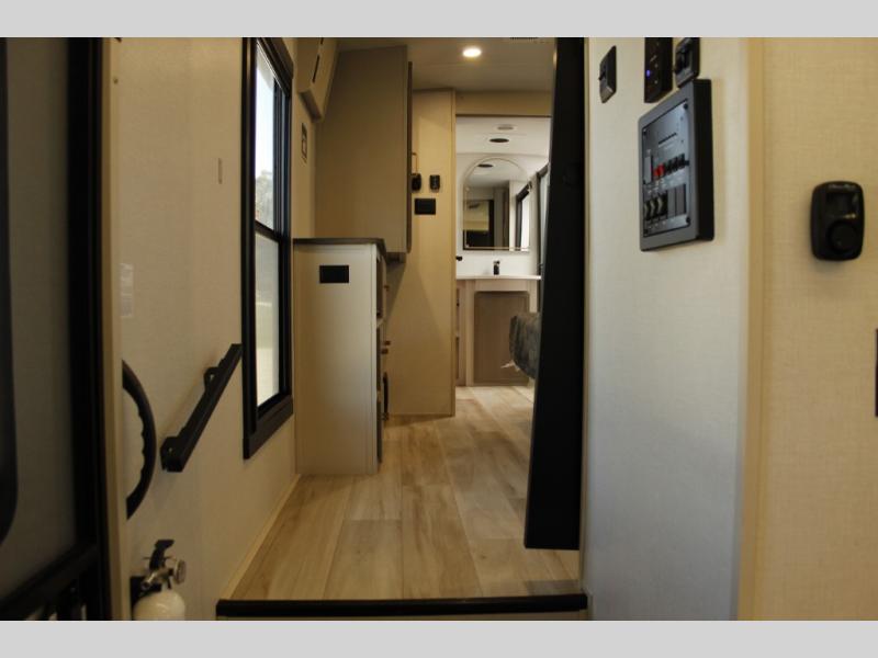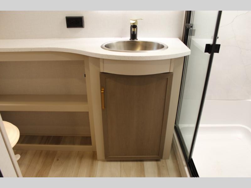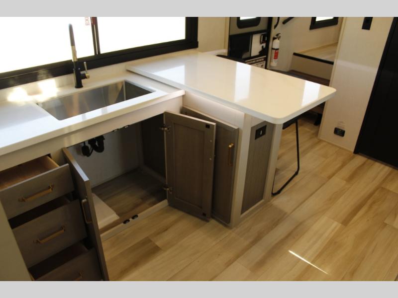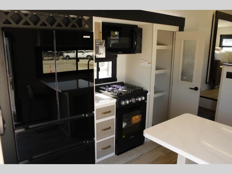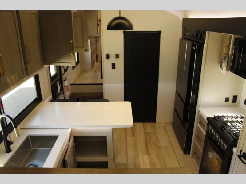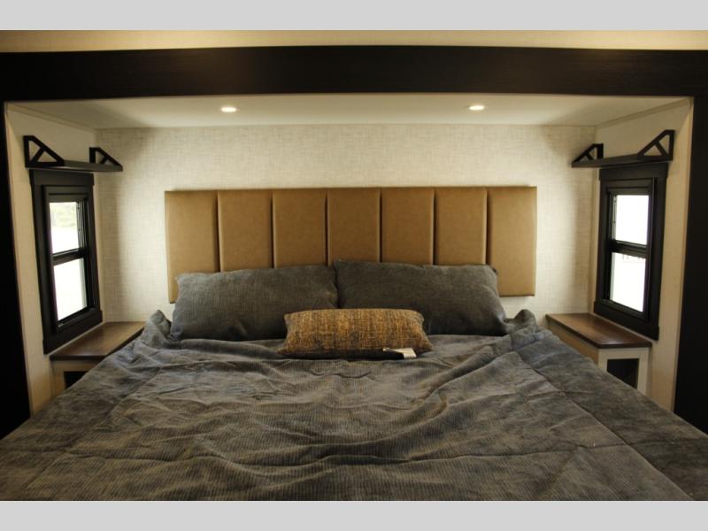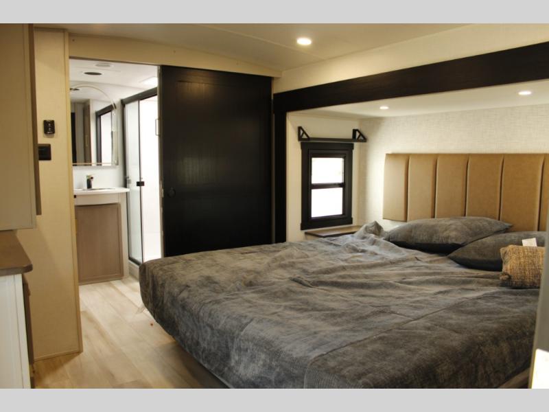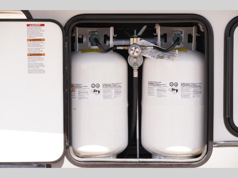 Each Wildwood Heritage Glen Elite Series fifth wheel by Forest River is constructed with vacuum bonded "Aluma Frame" sidewalls and floor, block foam insulation, and an AccessiBelly underbelly with 12V tank heaters on all holding tanks to help extend your camping season. There is an exterior docking station with hot and cold water, along with power stabilizer jacks and landing gear, and Goodyear radial tires with black accented rims. There is also an in-line water filtration system, an RV Airflow system, and an extra large pass-through storage with Slam Latch baggage doors and magnetic catches for hassle-free packing. You will love the high-end solid surface countertops inside, along with gold-accented faucets with stainless steel sinks in all bathrooms, and European oak colored horizontal plank linoleum flooring that is both stylish and easy to keep clean!
