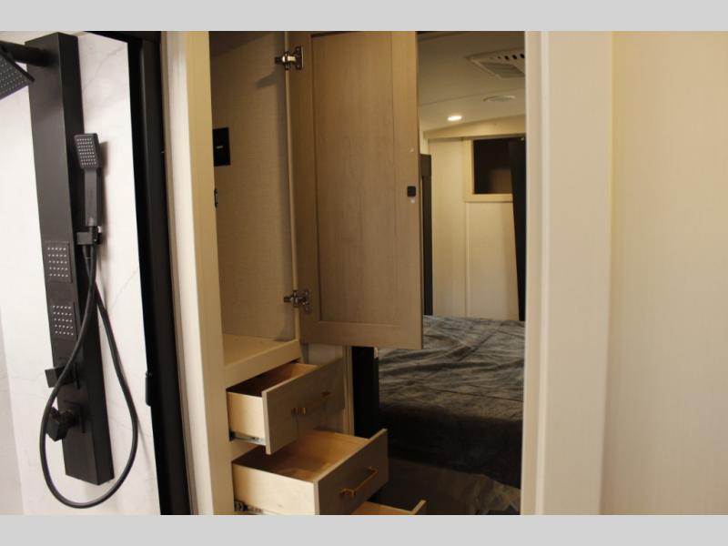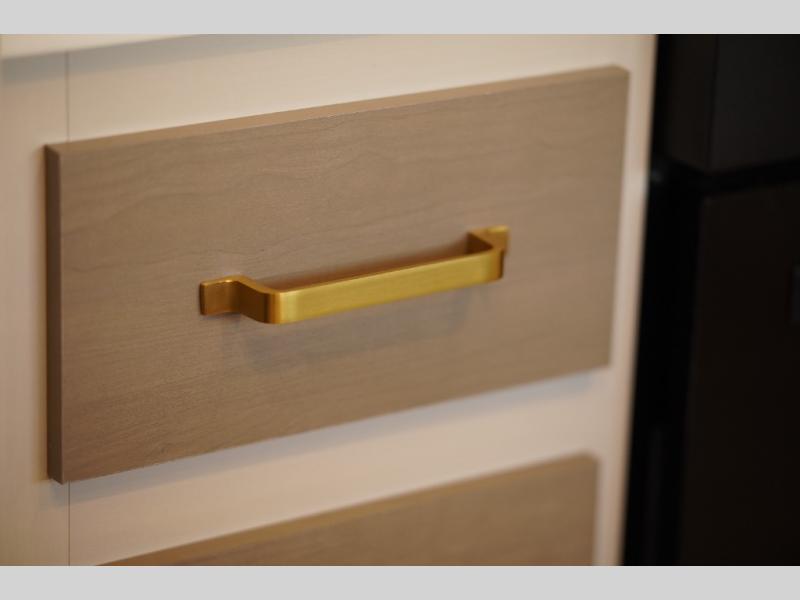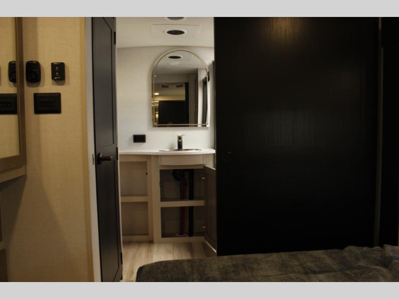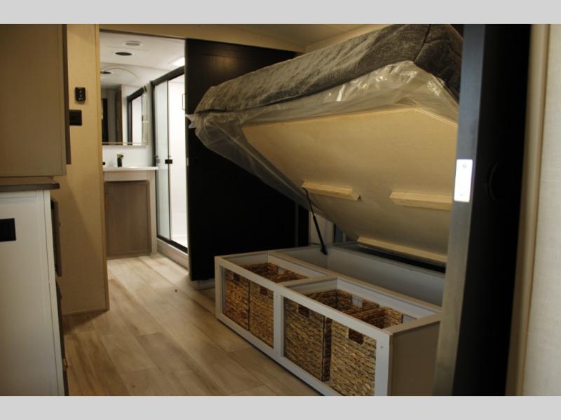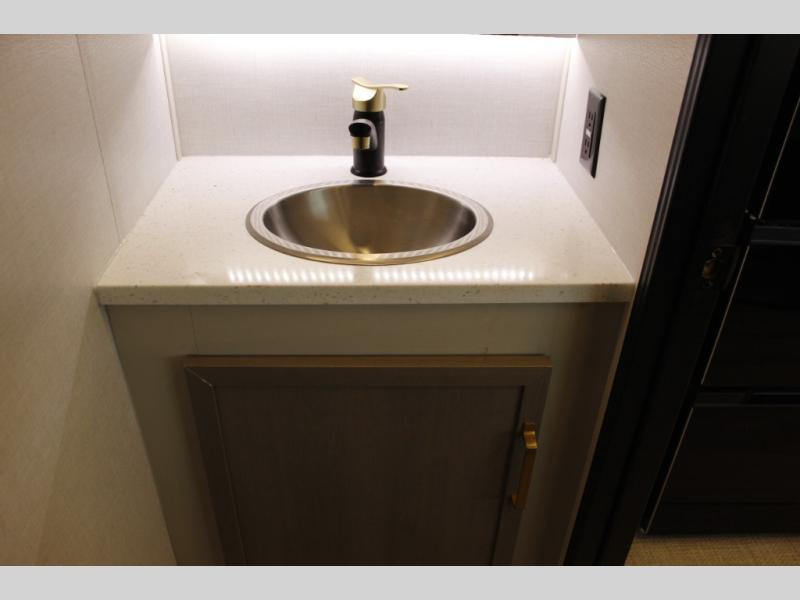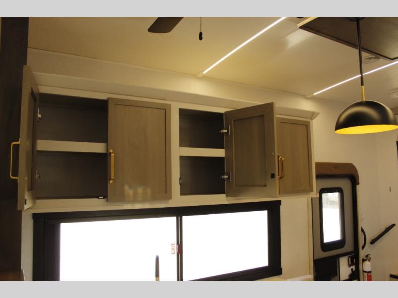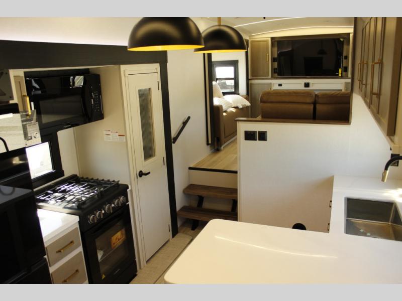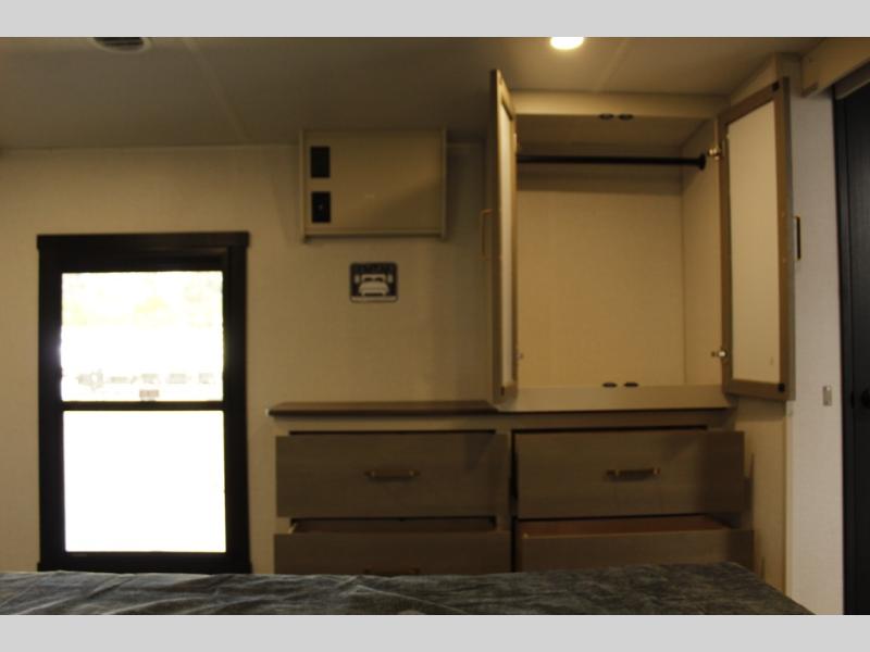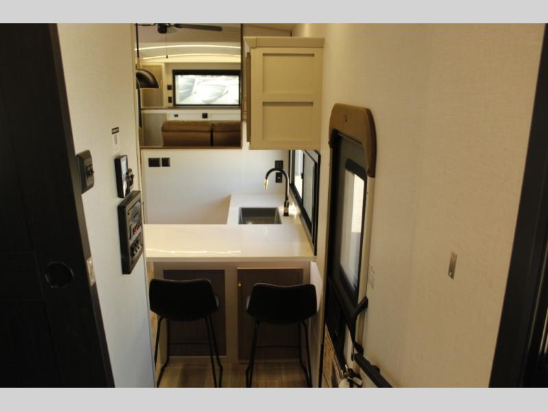 Each Wildwood Heritage Glen Elite Series fifth wheel by Forest River is constructed with vacuum bonded "Aluma Frame" sidewalls and floor, block foam insulation, and an AccessiBelly underbelly with 12V tank heaters on all holding tanks to help extend your camping season. There is an exterior docking station with hot and cold water, along with power stabilizer jacks and landing gear, and Goodyear radial tires with black accented rims. There is also an in-line water filtration system, an RV Airflow system, and an extra large pass-through storage with Slam Latch baggage doors and magnetic catches for hassle-free packing. You will love the high-end solid surface countertops inside, along with gold-accented faucets with stainless steel sinks in all bathrooms, and European oak colored horizontal plank linoleum flooring that is both stylish and easy to keep clean!