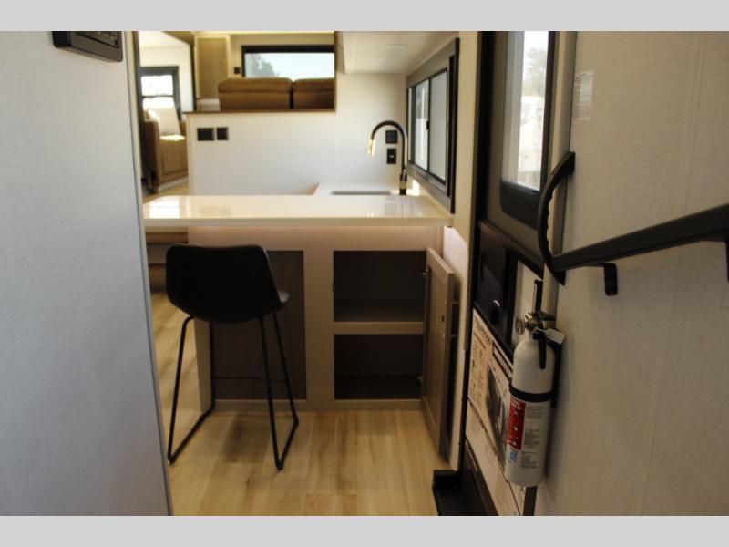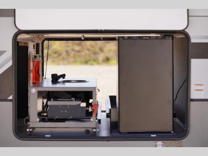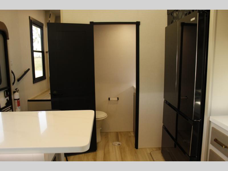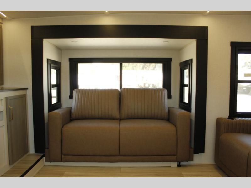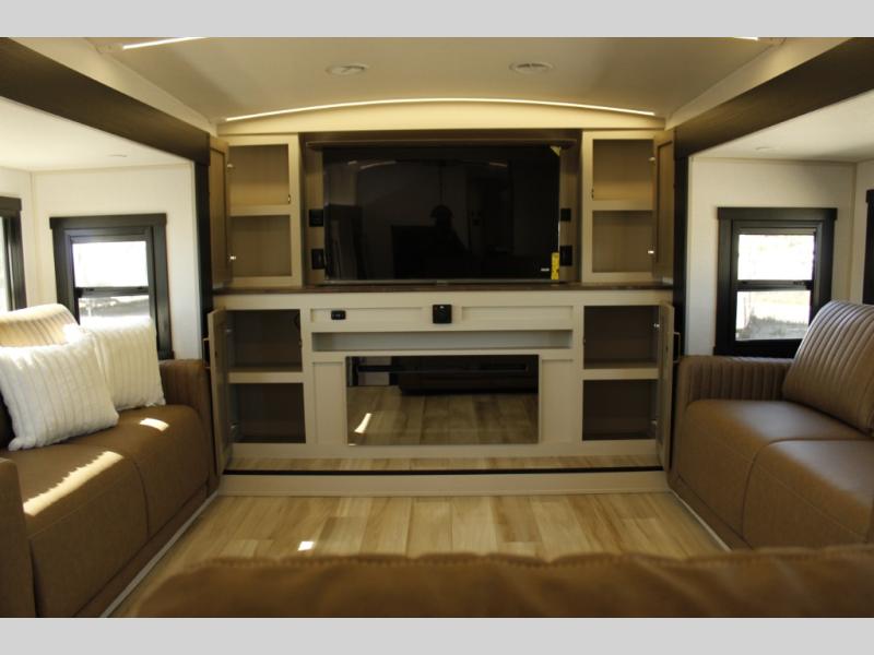 Invite the grandkids or your neighbor friends for your next camping trip in this Wildwood Heritage Glen Elite fifth wheel that features a front entertainment center and living area. Your guests will love the two tri-fold sofas within dual opposing slides to make the room their own. You'll also enjoy theatre seats and a fireplace for an even more at-home feel. The large pantry in the kitchen is very handy as well as the breakfast bar with swivel bar stools. This unit also includes a full and half bath for your convenience, and a king bed with Versa-Tilt on an Elite extra-wide bed slide in the private bedroom. There is abundant storage with multiple pass-through compartments included, so you don't have to leave any of your larger gear behind. Outdoors, you can also enjoy the 20' awning, the strut-assisted steps when entering and exiting, and the Elite outdoor bar and entertainment center which includes a 32" TV, a griddle, and a refrigerator.