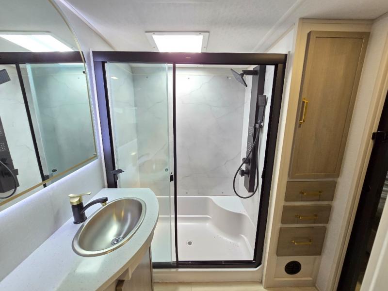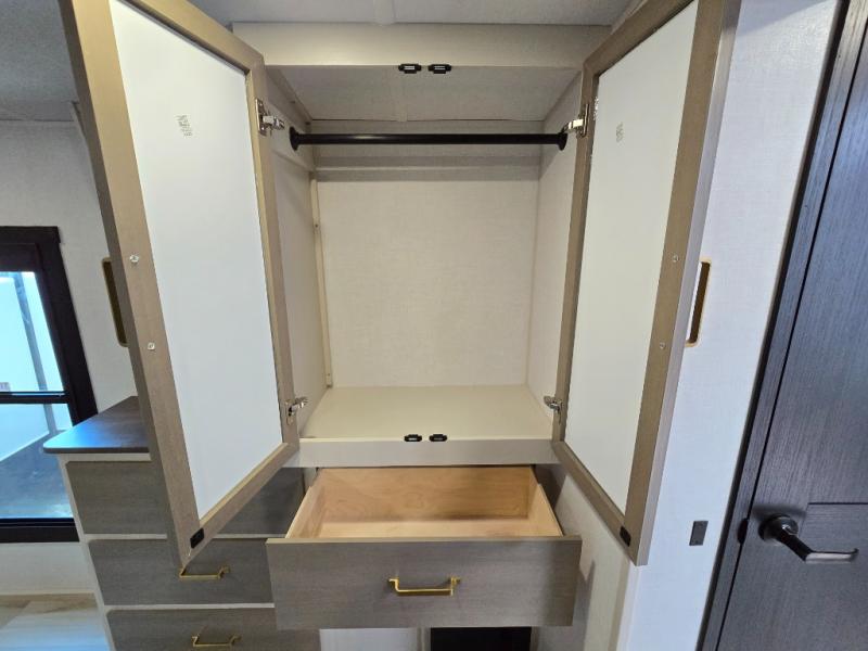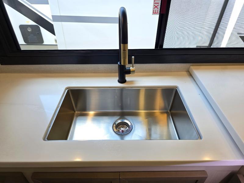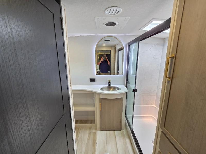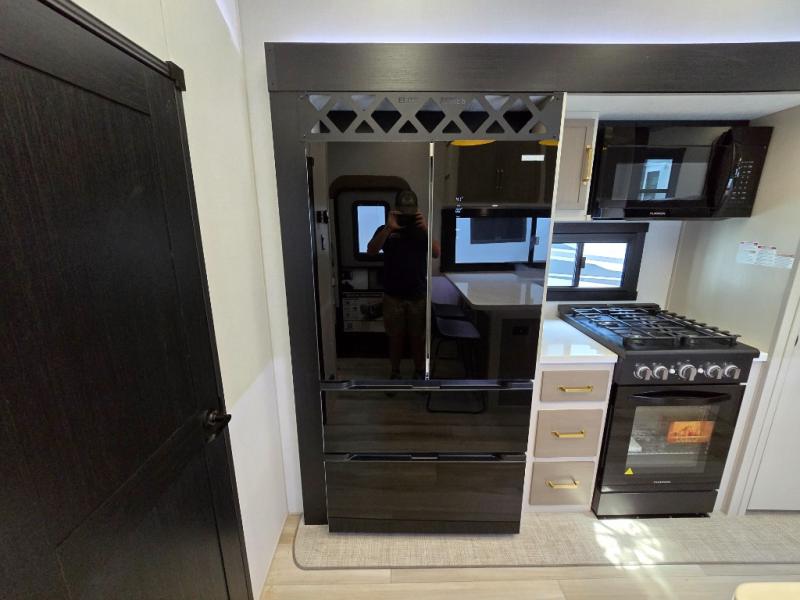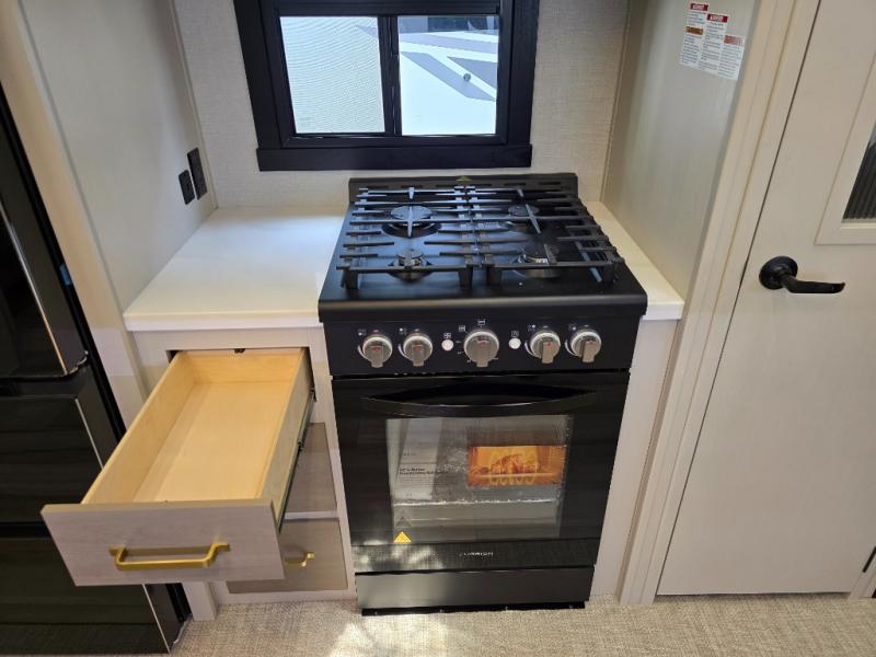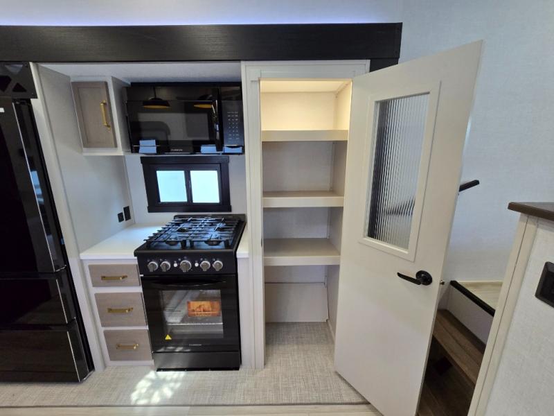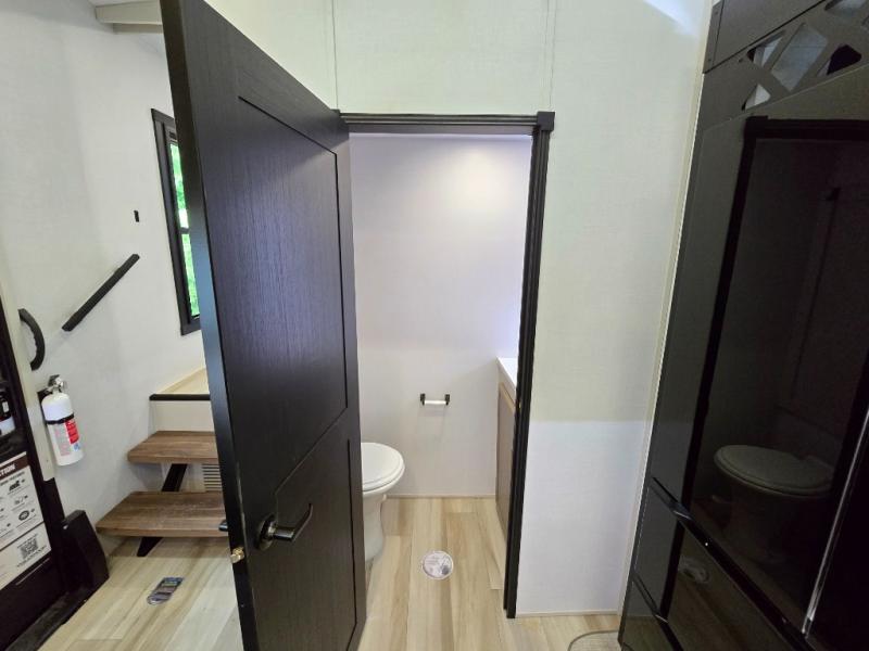 Each Wildwood Heritage Glen Elite Series fifth wheel by Forest River is constructed with vacuum bonded "Aluma Frame" sidewalls and floor, block foam insulation, and an AccessiBelly underbelly with 12V tank heaters on all holding tanks to help extend your camping season. There is an exterior docking station with hot and cold water, along with power stabilizer jacks and landing gear, and Goodyear radial tires with black accented rims. There is also an in-line water filtration system, an RV Airflow system, and an extra large pass-through storage with Slam Latch baggage doors and magnetic catches for hassle-free packing. You will love the high-end solid surface countertops inside, along with gold-accented faucets with stainless steel sinks in all bathrooms, and European oak colored horizontal plank linoleum flooring that is both stylish and easy to keep clean!