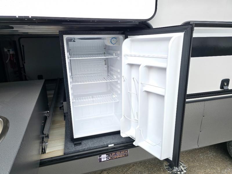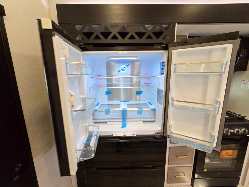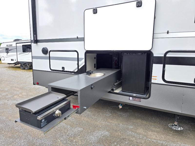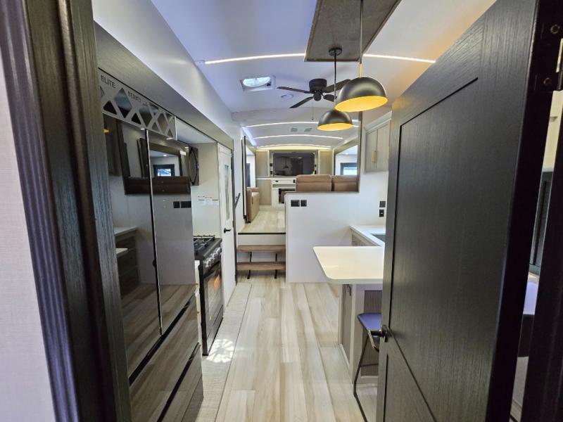 Invite the grandkids or your neighbor friends for your next camping trip in this Wildwood Heritage Glen Elite fifth wheel that features a front entertainment center and living area. Your guests will love the two tri-fold sofas within dual opposing slides to make the room their own. You'll also enjoy theatre seats and a fireplace for an even more at-home feel. The large pantry in the kitchen is very handy as well as the breakfast bar with swivel bar stools. This unit also includes a full and half bath for your convenience, and a king bed with Versa-Tilt on an Elite extra-wide bed slide in the private bedroom. There is abundant storage with multiple pass-through compartments included, so you don't have to leave any of your larger gear behind. Outdoors, you can also enjoy the 20' awning, the strut-assisted steps when entering and exiting, and the Elite outdoor bar and entertainment center which includes a 32" TV, a griddle, and a refrigerator.