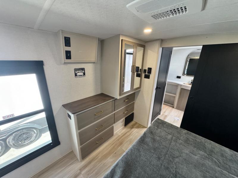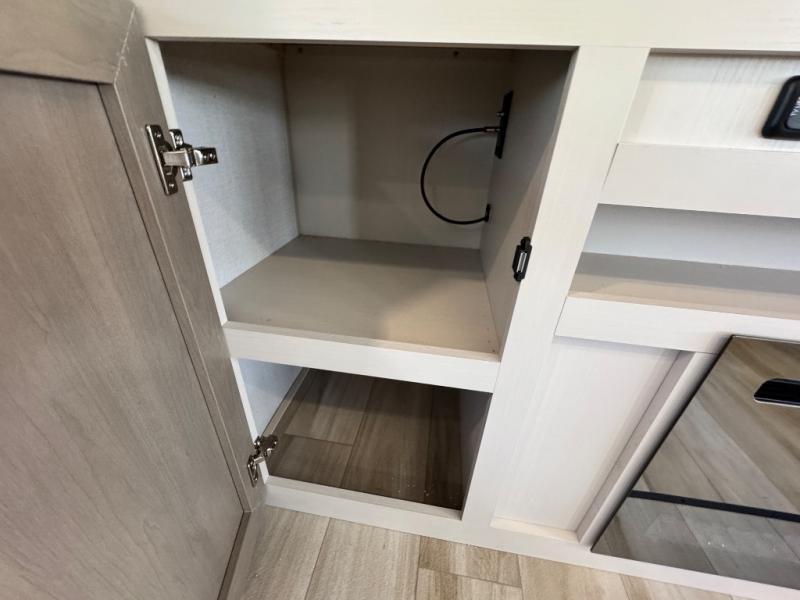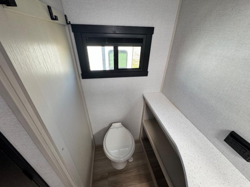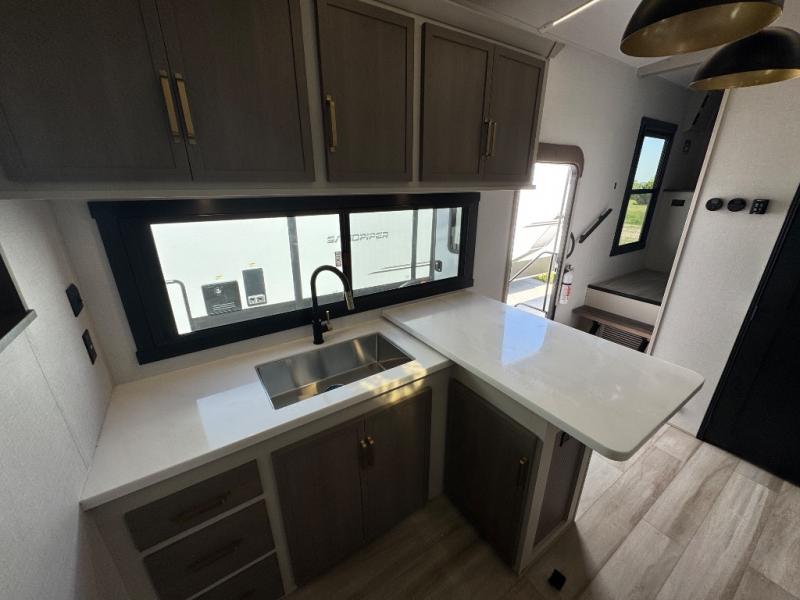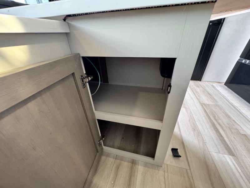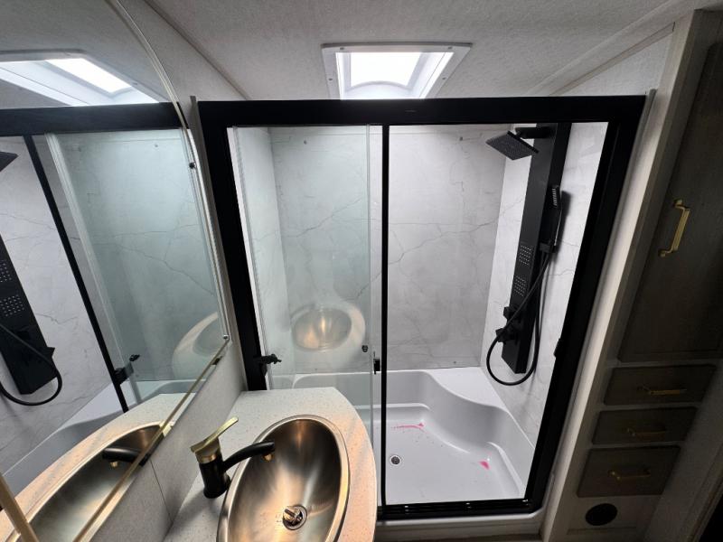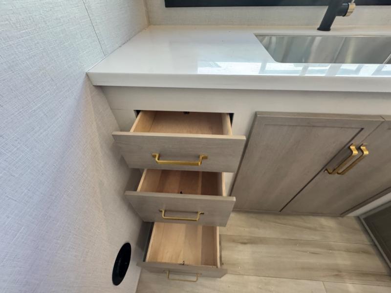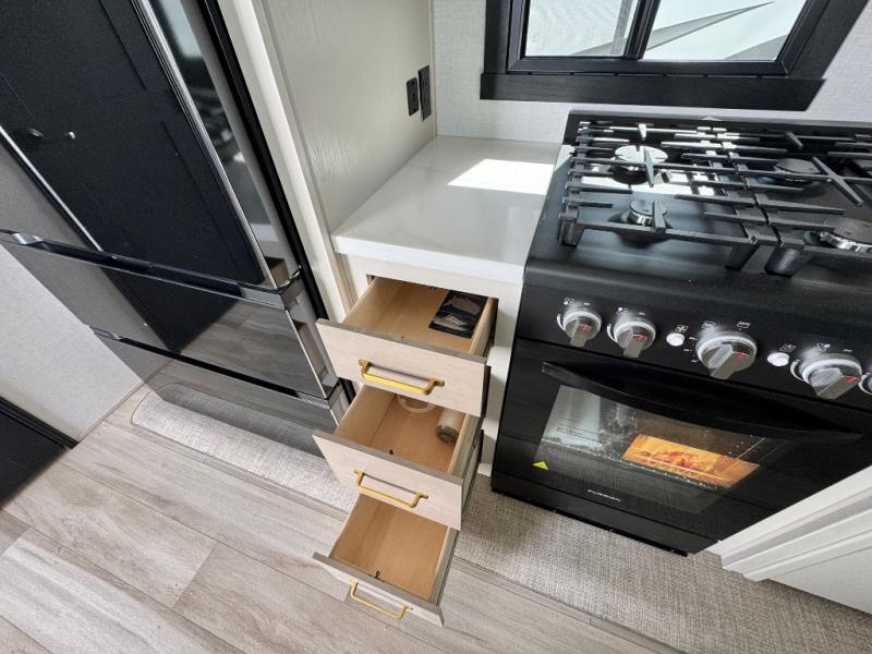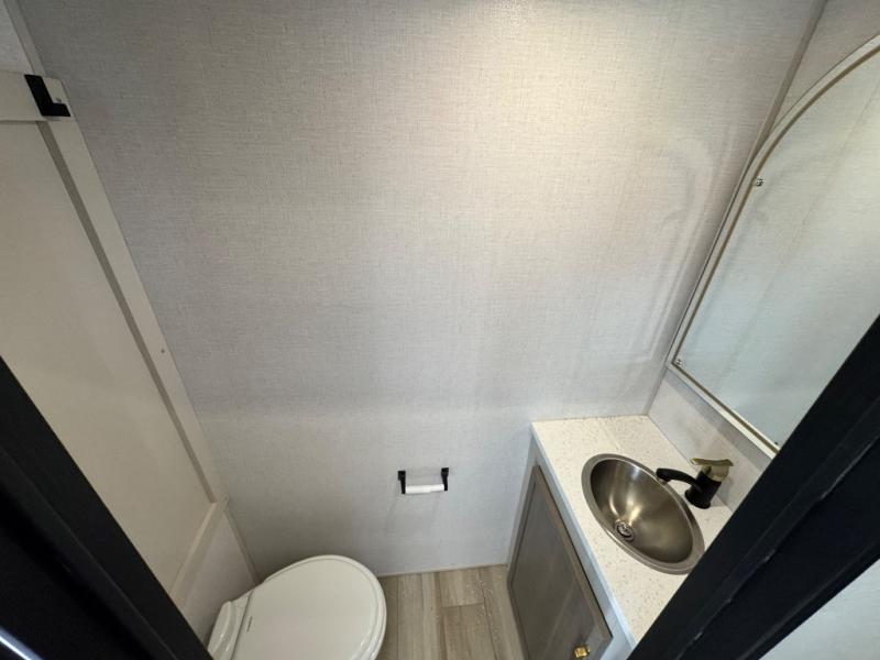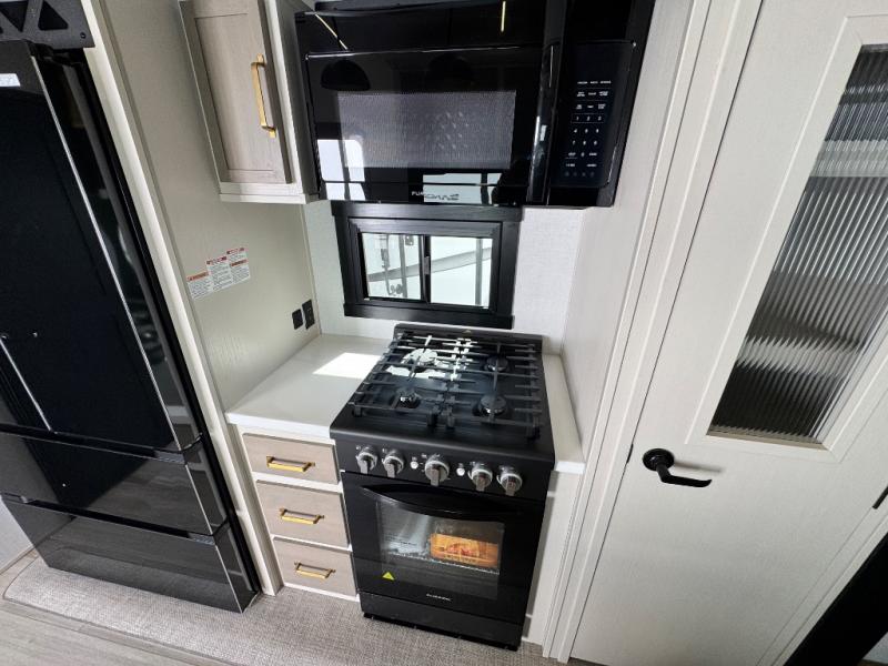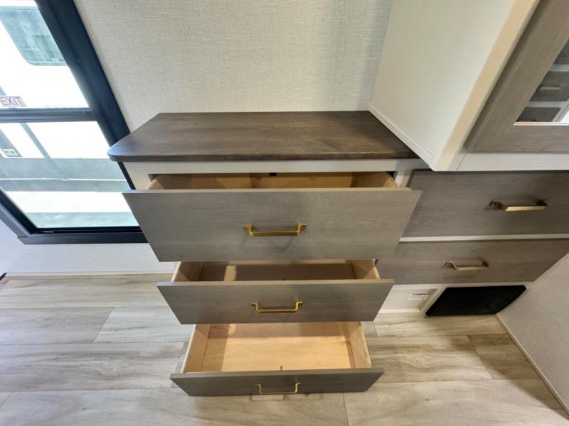 Each Wildwood Heritage Glen Elite Series fifth wheel by Forest River is constructed with vacuum bonded "Aluma Frame" sidewalls and floor, block foam insulation, and an AccessiBelly underbelly with 12V tank heaters on all holding tanks to help extend your camping season. There is an exterior docking station with hot and cold water, along with power stabilizer jacks and landing gear, and Goodyear radial tires with black accented rims. There is also an in-line water filtration system, an RV Airflow system, and an extra large pass-through storage with Slam Latch baggage doors and magnetic catches for hassle-free packing. You will love the high-end solid surface countertops inside, along with gold-accented faucets with stainless steel sinks in all bathrooms, and European oak colored horizontal plank linoleum flooring that is both stylish and easy to keep clean!