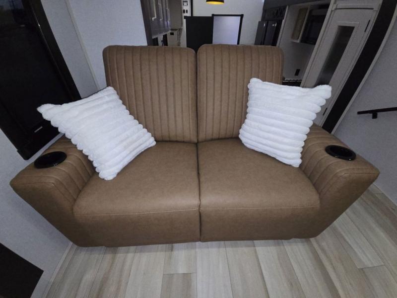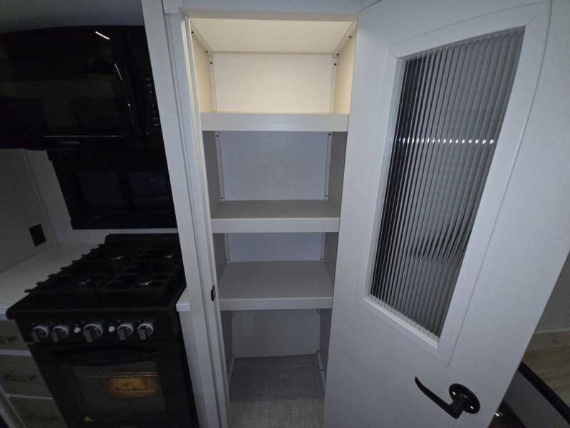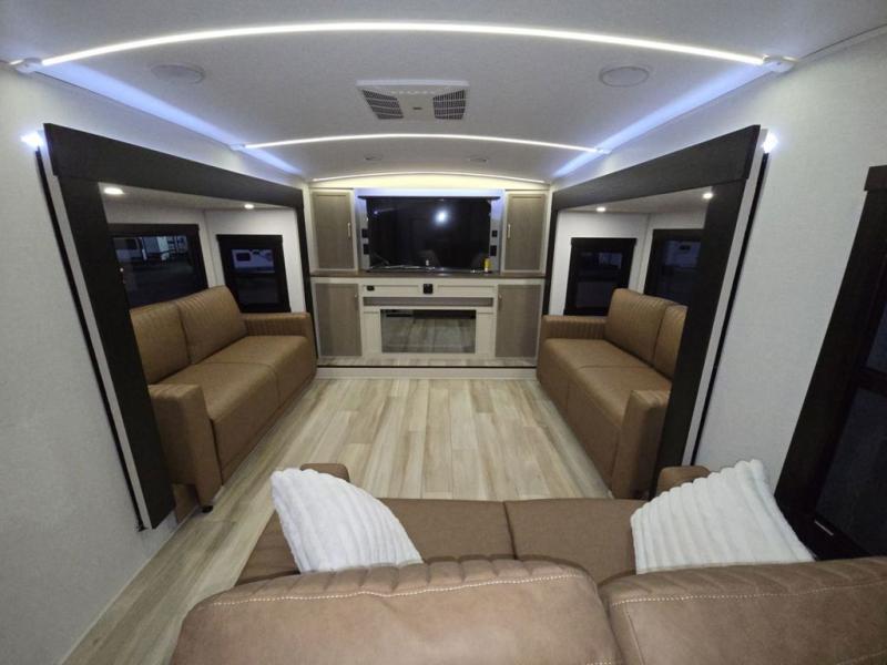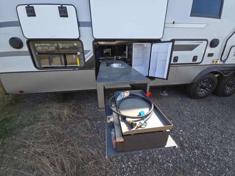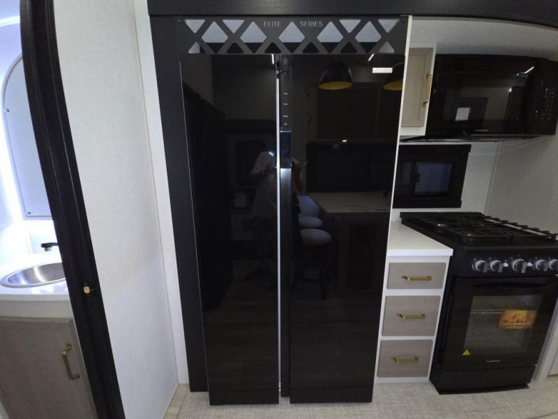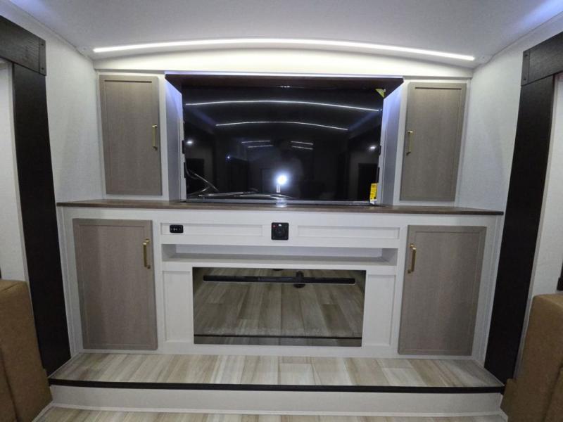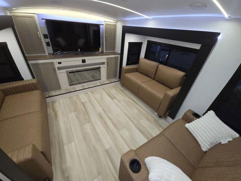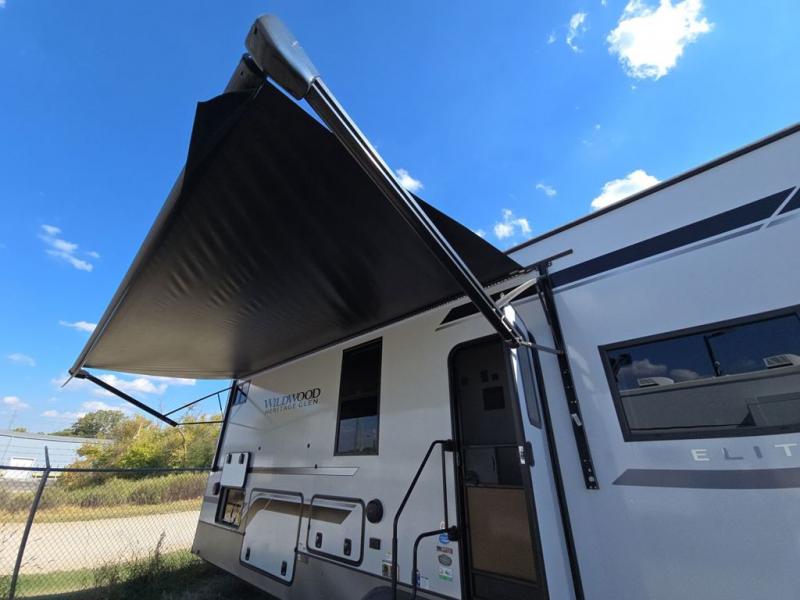 Invite the grandkids or your neighbor friends for your next camping trip in this Wildwood Heritage Glen Elite fifth wheel that features a front entertainment center and living area. Your guests will love the two tri-fold sofas within dual opposing slides to make the room their own. You'll also enjoy theatre seats and a fireplace for an even more at-home feel. The large pantry in the kitchen is very handy as well as the breakfast bar with swivel bar stools. This unit also includes a full and half bath for your convenience, and a king bed with Versa-Tilt on an Elite extra-wide bed slide in the private bedroom. There is abundant storage with multiple pass-through compartments included, so you don't have to leave any of your larger gear behind. Outdoors, you can also enjoy the 20' awning, the strut-assisted steps when entering and exiting, and the Elite outdoor bar and entertainment center which includes a 32" TV, a griddle, and a refrigerator.