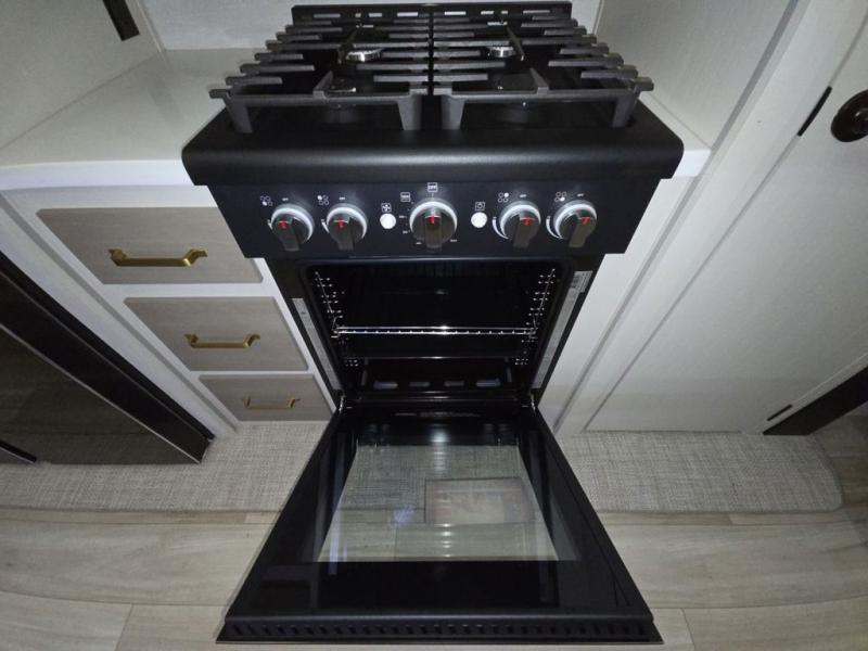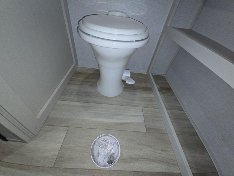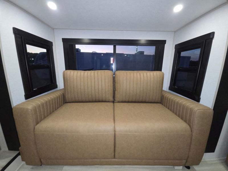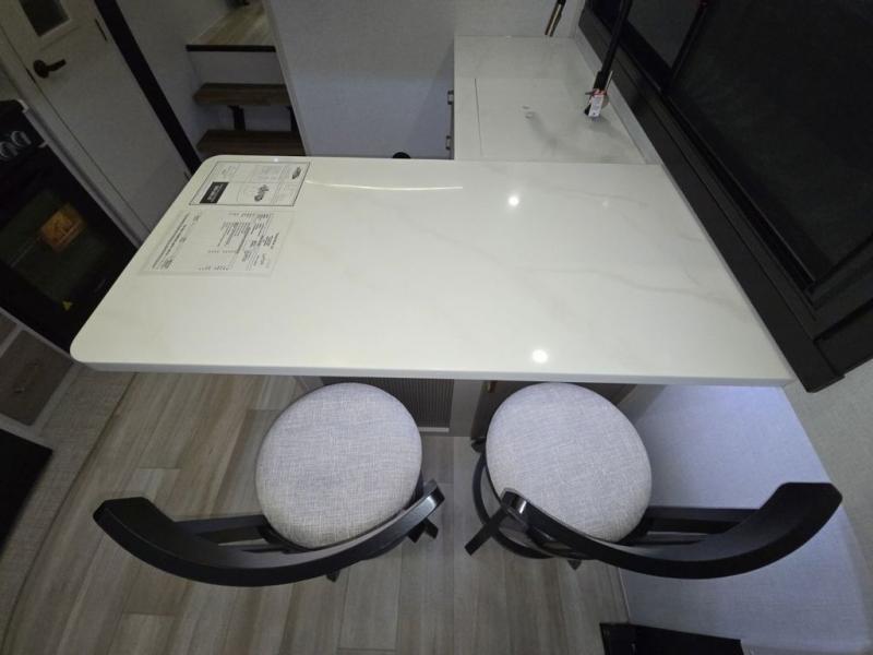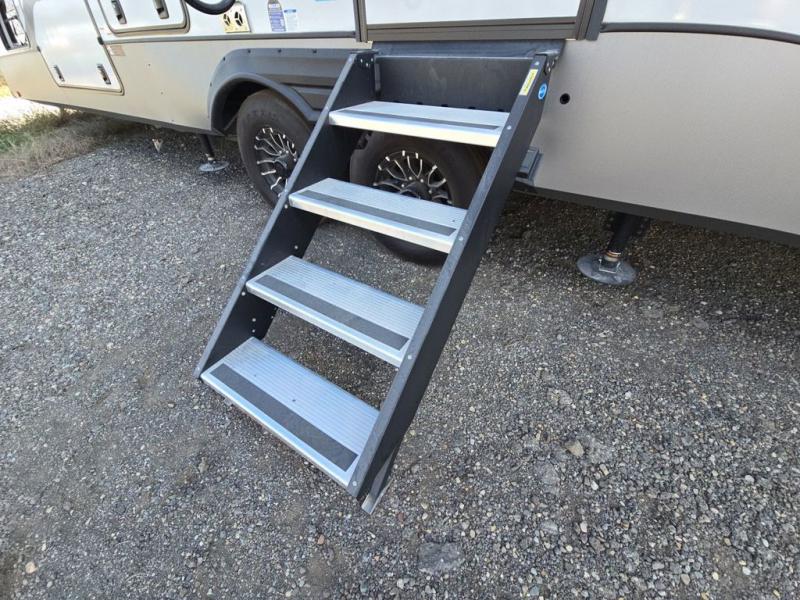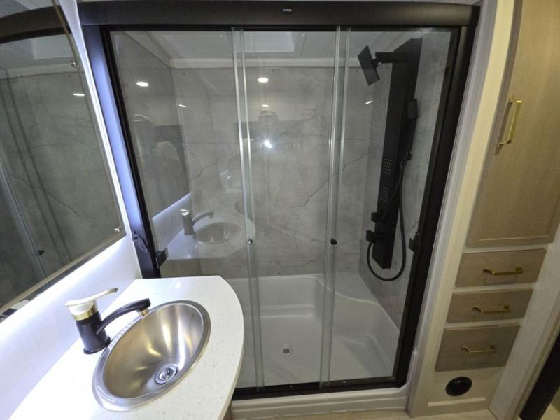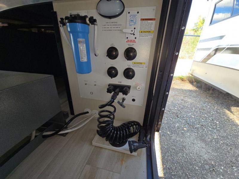 Each Wildwood Heritage Glen Elite Series fifth wheel by Forest River is constructed with vacuum bonded "Aluma Frame" sidewalls and floor, block foam insulation, and an AccessiBelly underbelly with 12V tank heaters on all holding tanks to help extend your camping season. There is an exterior docking station with hot and cold water, along with power stabilizer jacks and landing gear, and Goodyear radial tires with black accented rims. There is also an in-line water filtration system, an RV Airflow system, and an extra large pass-through storage with Slam Latch baggage doors and magnetic catches for hassle-free packing. You will love the high-end solid surface countertops inside, along with gold-accented faucets with stainless steel sinks in all bathrooms, and European oak colored horizontal plank linoleum flooring that is both stylish and easy to keep clean!