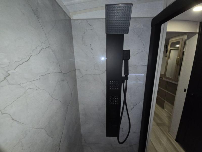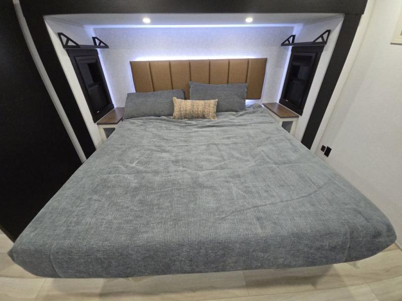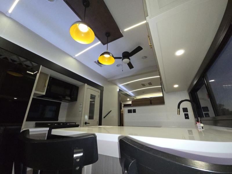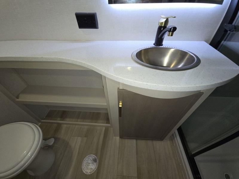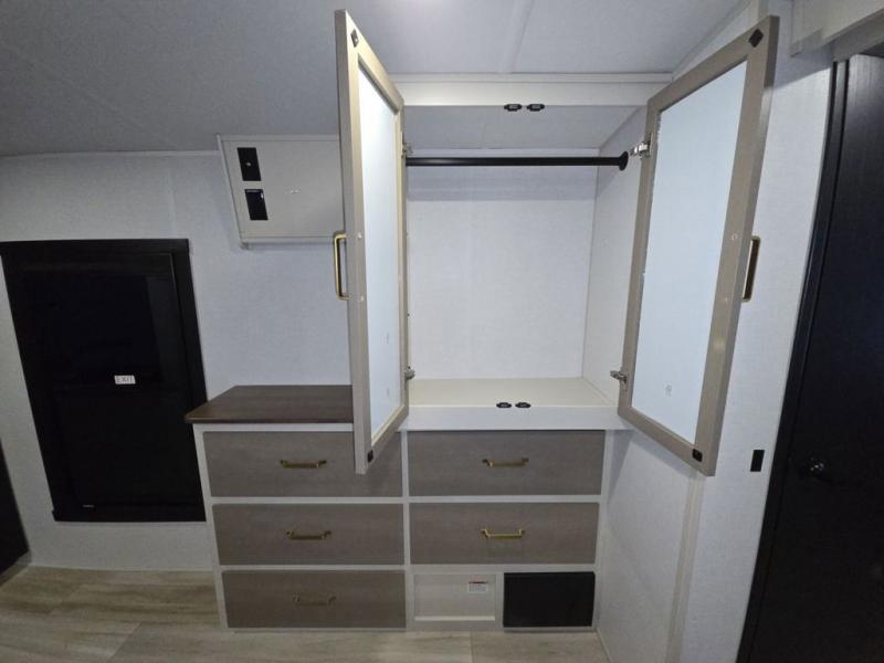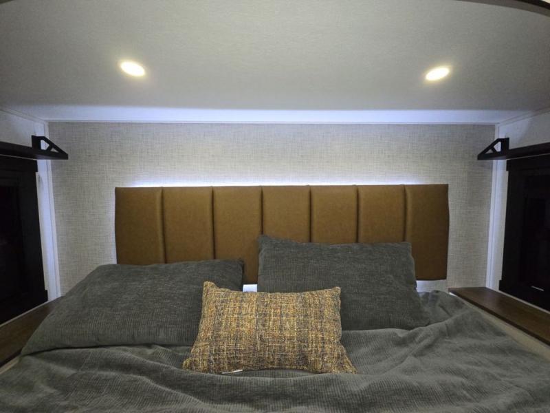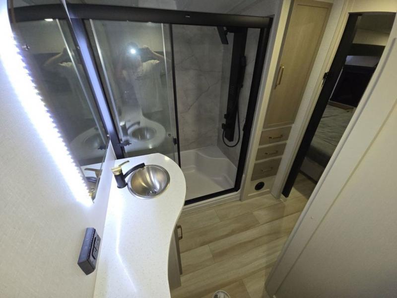 Each Wildwood Heritage Glen Elite Series fifth wheel by Forest River is constructed with vacuum bonded "Aluma Frame" sidewalls and floor, block foam insulation, and an AccessiBelly underbelly with 12V tank heaters on all holding tanks to help extend your camping season. There is an exterior docking station with hot and cold water, along with power stabilizer jacks and landing gear, and Goodyear radial tires with black accented rims. There is also an in-line water filtration system, an RV Airflow system, and an extra large pass-through storage with Slam Latch baggage doors and magnetic catches for hassle-free packing. You will love the high-end solid surface countertops inside, along with gold-accented faucets with stainless steel sinks in all bathrooms, and European oak colored horizontal plank linoleum flooring that is both stylish and easy to keep clean!