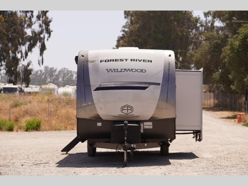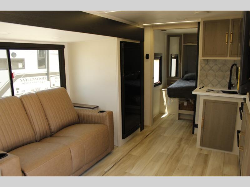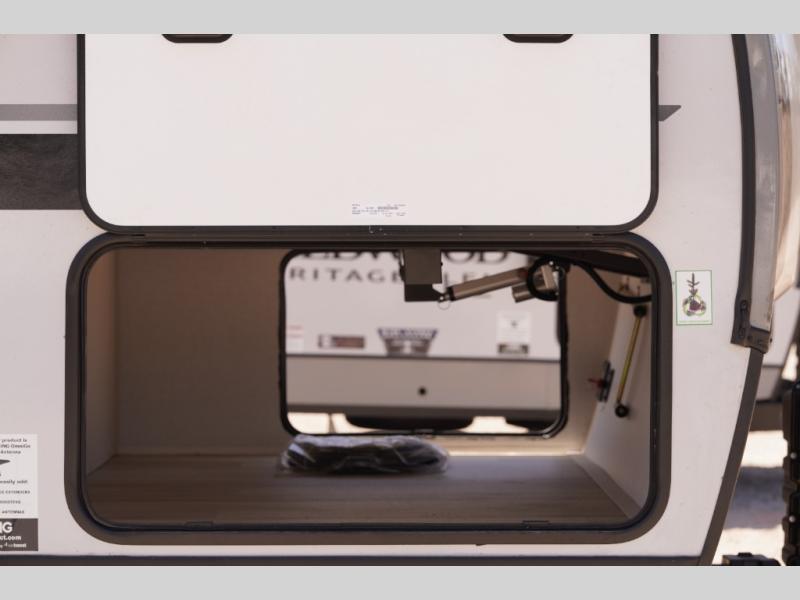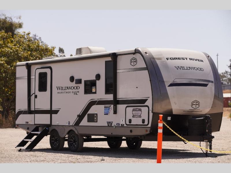 The Wildwood Heritage Glen Hyper-Lyte travel trailer by Forest River offers stability with a wide stance axle system, easy setup with a power tongue jack with an LED docking light, and safe entry with the Step Above aluminum entry steps. The interior includes Temple Cherry cabinetry with matte gold hardware, hidden hinges on the cabinet doors, and a residential single bowl undermount sink. You will also find a back-up camera prep and solar prep, an outdoor shower, Maxxis radial tires, and many more exterior conveniences.