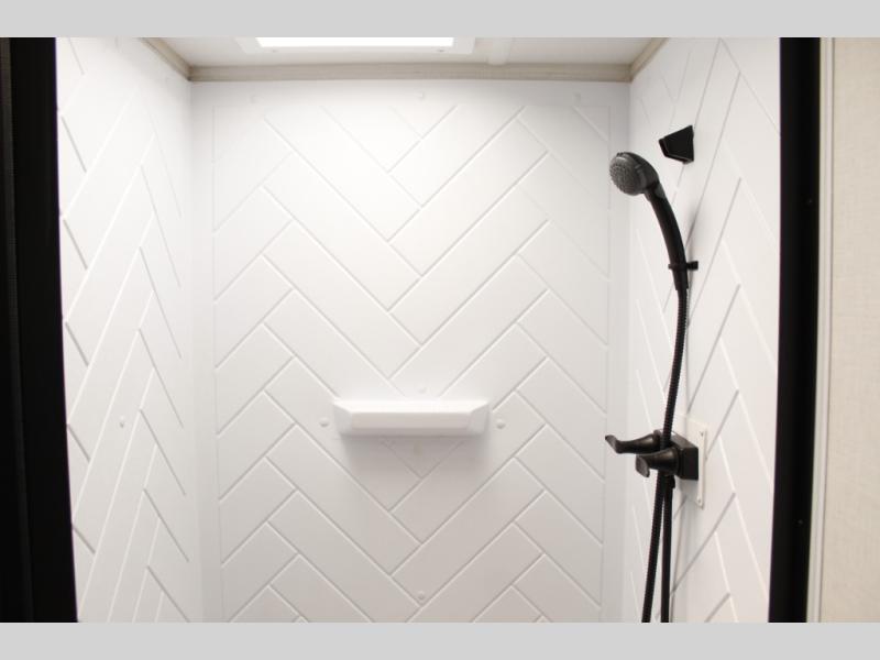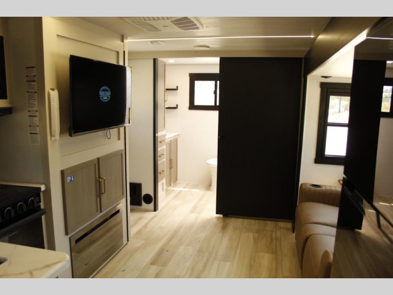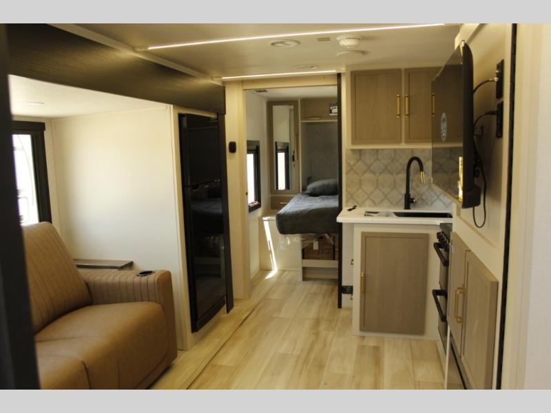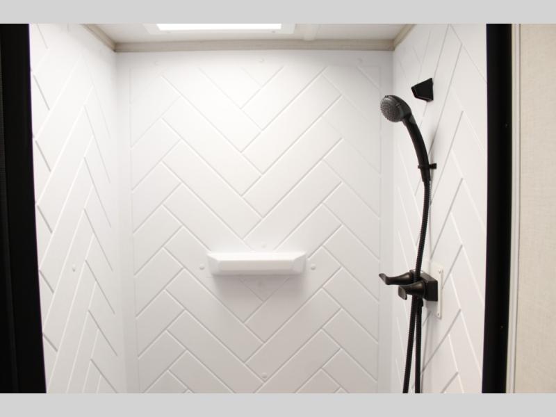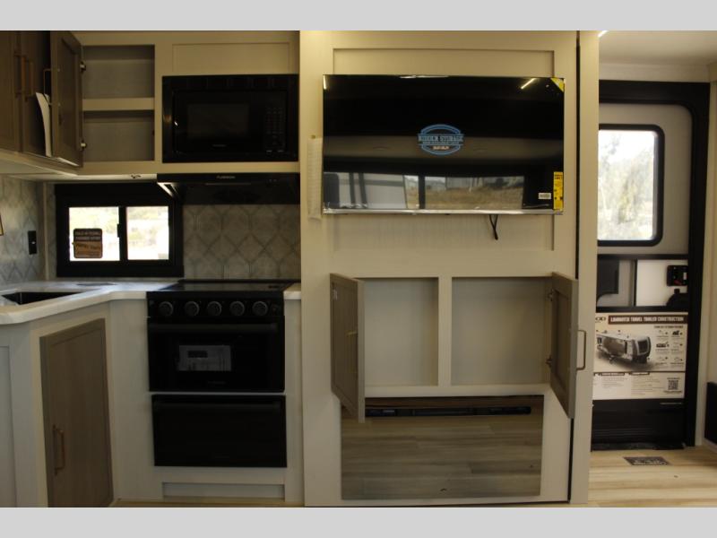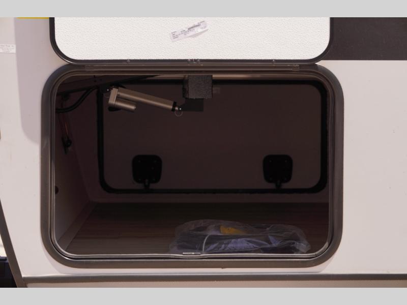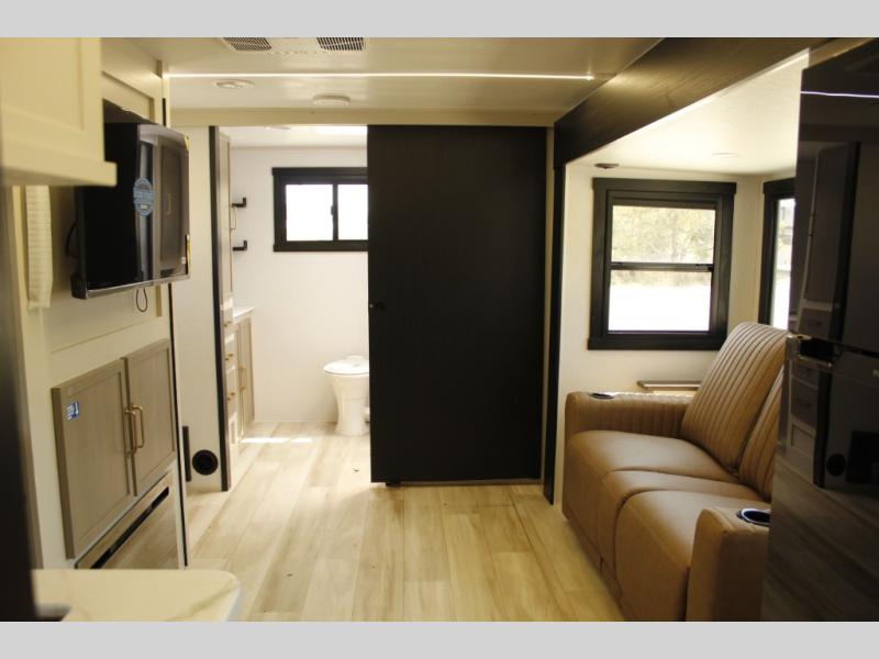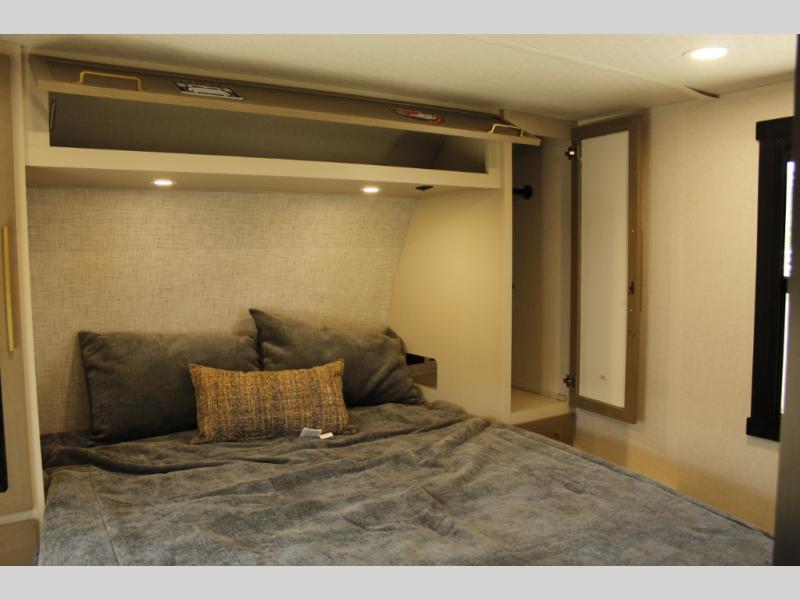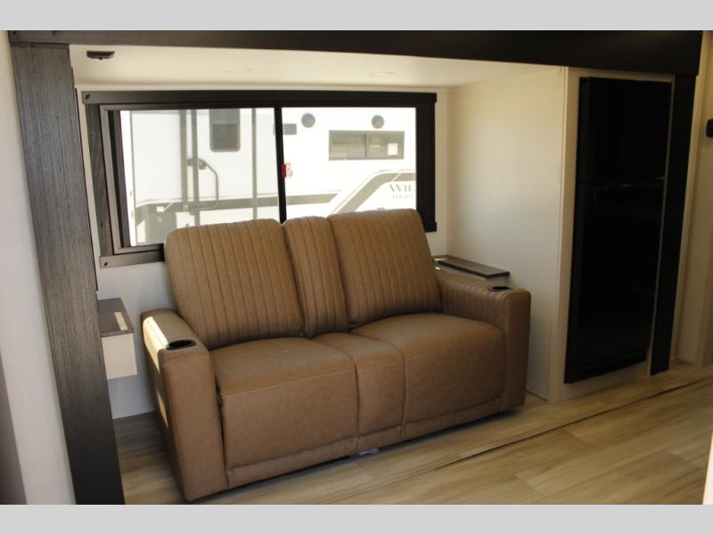 If you like to be different, this couples trailer offers theater seating and a removable table that you can relax on and dine at. There is also a swing-open entertainment center and a fireplace right across from the seats for perfect viewing. The kitchen has full amenities including a 12V black refrigerator and hidden storage behind the TV. The rear bath offers a walk-in shower with a skylight for more natural lighting, a large linen cabinet for all your essentials, a wardrobe and everything else you need to stay refreshed and clean without having to use the public facilities. The front bedroom offers a space savings door, a queen bed with Versa Tilt and dual wardrobes. You will also find a Texas-sized pass-through compartment outside for the outdoor gear such as camping chairs, charcoal, and such.