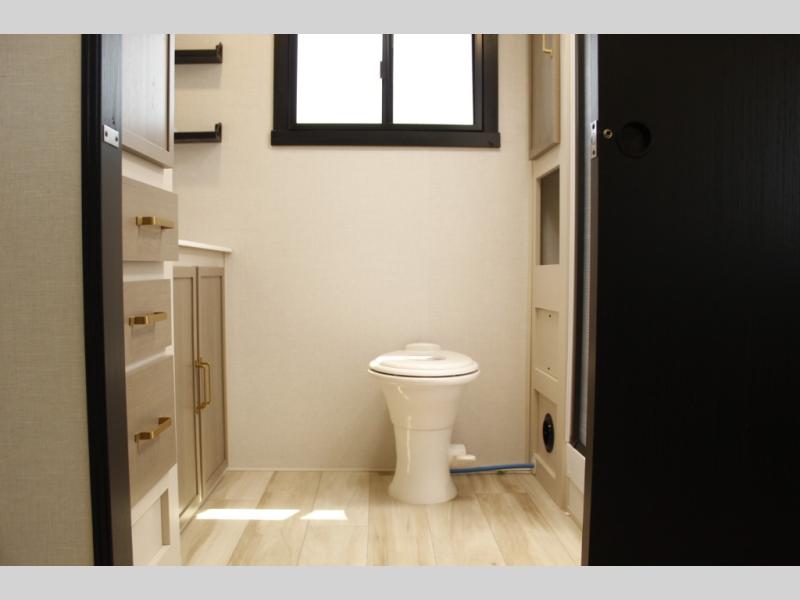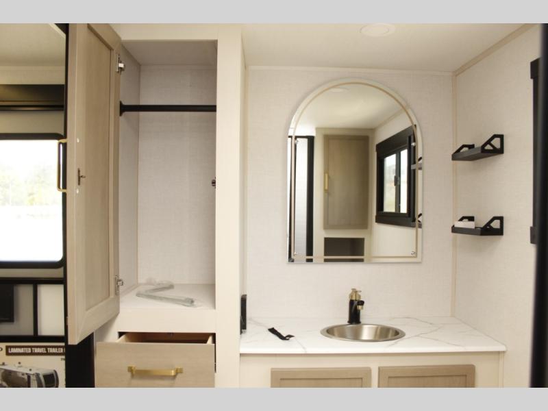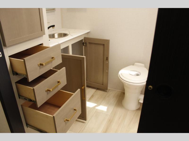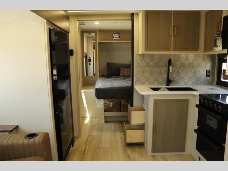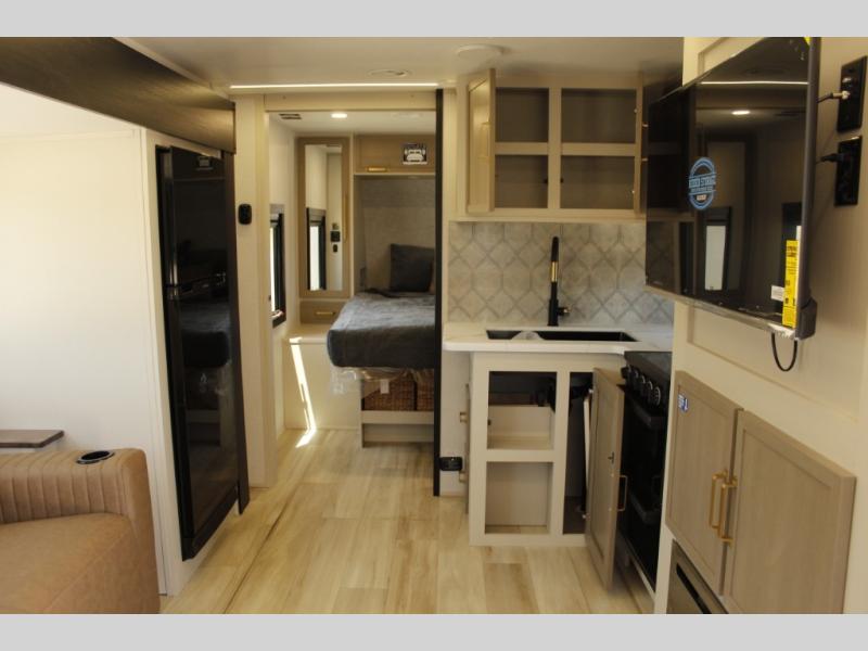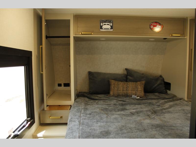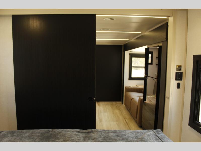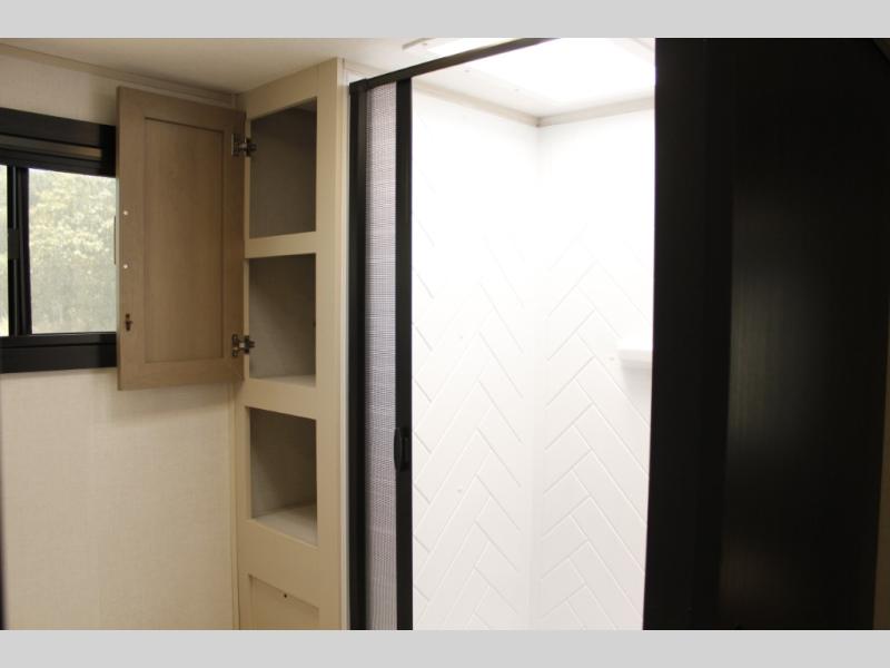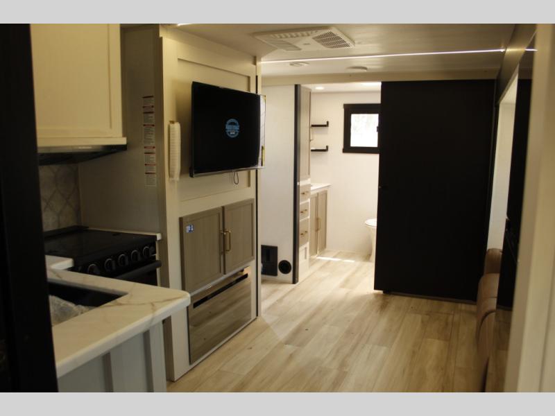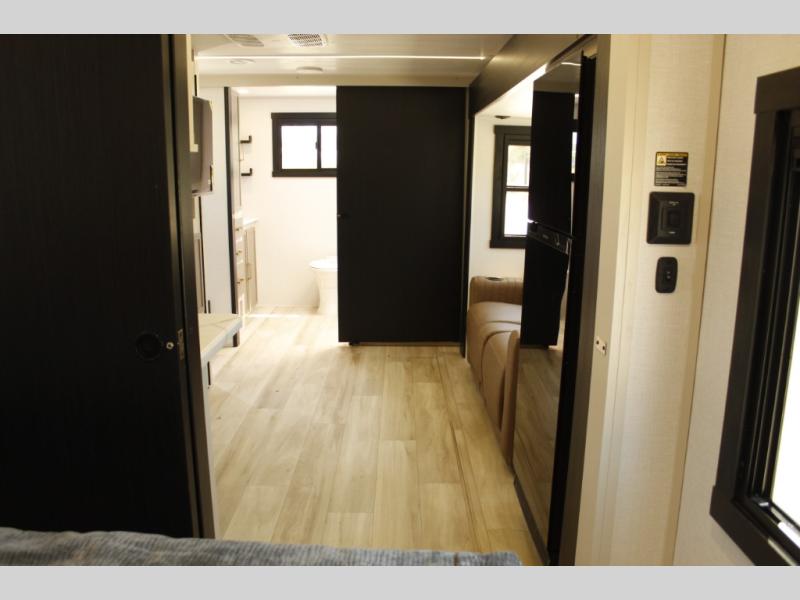 If you like to be different, this couples trailer offers theater seating and a removable table that you can relax on and dine at. There is also a swing-open entertainment center and a fireplace right across from the seats for perfect viewing. The kitchen has full amenities including a 12V black refrigerator and hidden storage behind the TV. The rear bath offers a walk-in shower with a skylight for more natural lighting, a large linen cabinet for all your essentials, a wardrobe and everything else you need to stay refreshed and clean without having to use the public facilities. The front bedroom offers a space savings door, a queen bed with Versa Tilt and dual wardrobes. You will also find a Texas-sized pass-through compartment outside for the outdoor gear such as camping chairs, charcoal, and such.