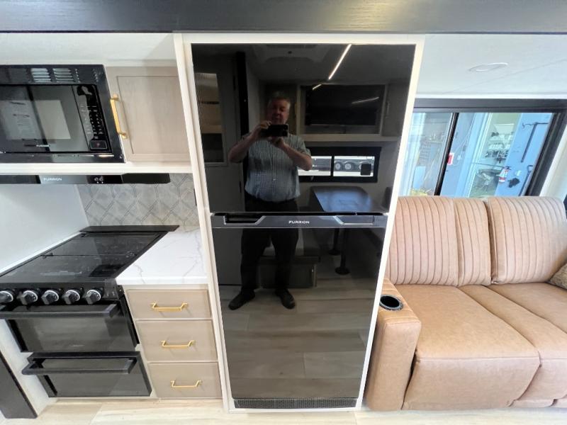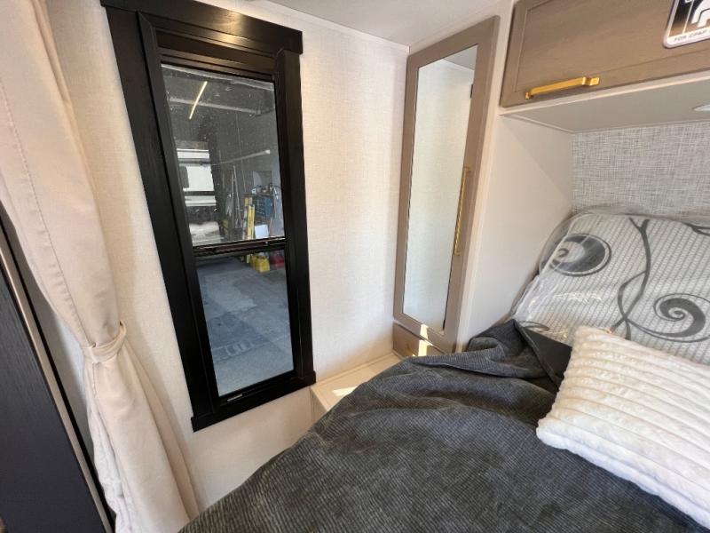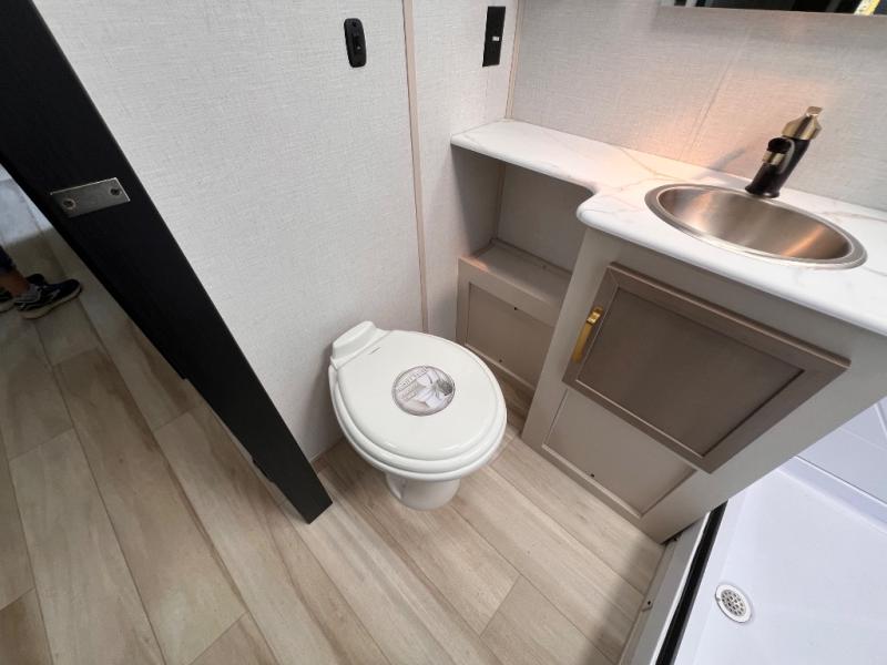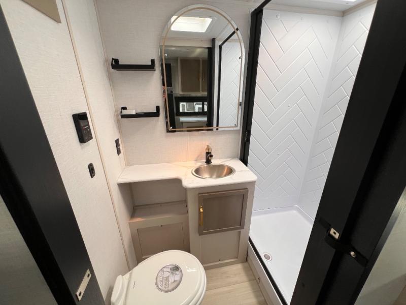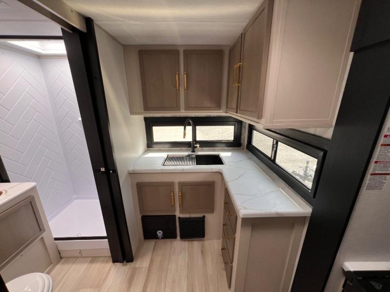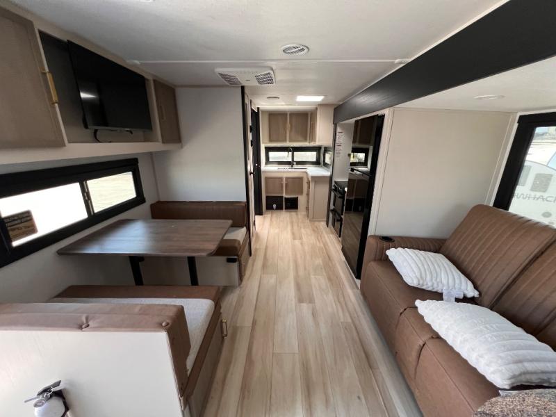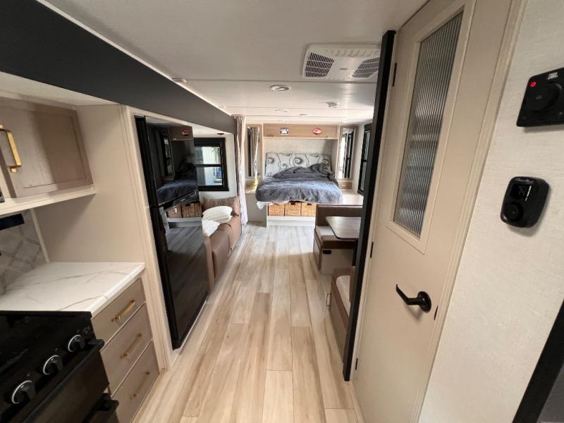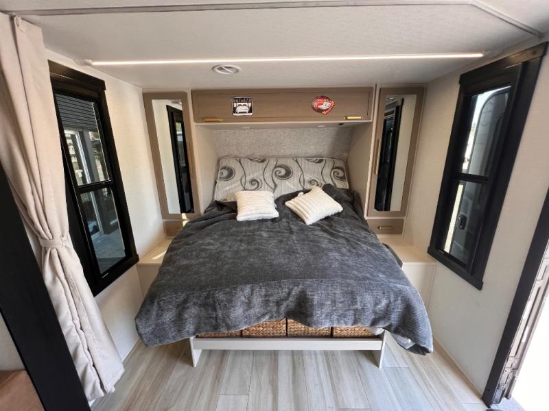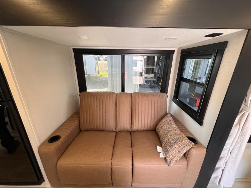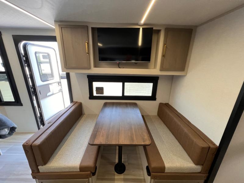 You're going to fall in love with this cozy travel trailer for three. There is a rear corner kitchen with plenty of counter space to prep meals each day, and the full bath on board will let everyone clean up each day. The theater seating is right across the TV for easy viewing and there is a booth dinette where you can dine, play card games, and even sleep one to two guests. When it's time to call it a night, you'll have a front queen bed with dual wardrobes for your things, plus overhead cabinets for special belongings. This model also includes an outdoor kitchen with a griddle, refrigerator, and an exterior spray port so you can enjoy breakfast outdoors!