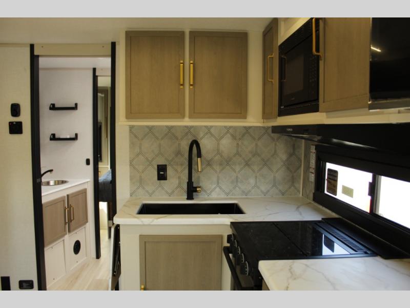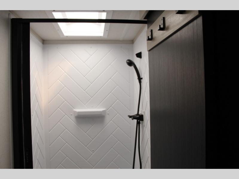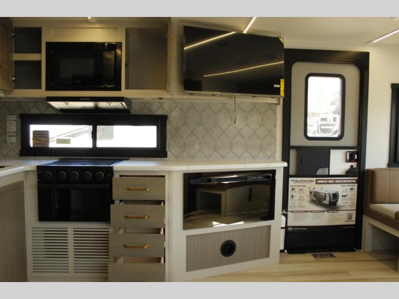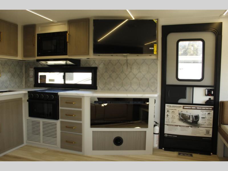 The Wildwood Heritage Glen Hyper-Lyte travel trailer by Forest River offers stability with a wide stance axle system, easy setup with a power tongue jack with an LED docking light, and safe entry with the Step Above aluminum entry steps. The interior includes Temple Cherry cabinetry with matte gold hardware, hidden hinges on the cabinet doors, and a residential single bowl undermount sink. You will also find a back-up camera prep and solar prep, an outdoor shower, Maxxis radial tires, and many more exterior conveniences.