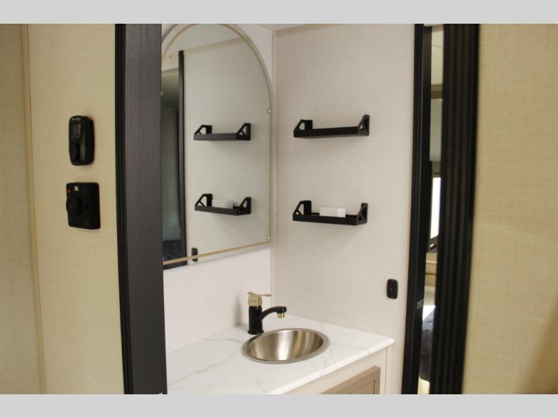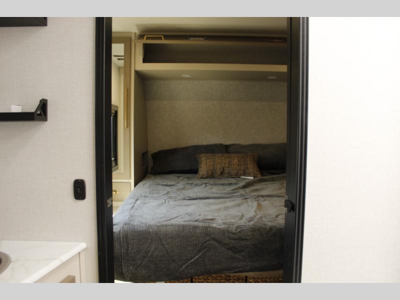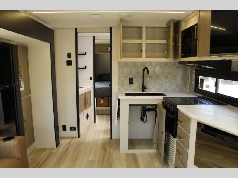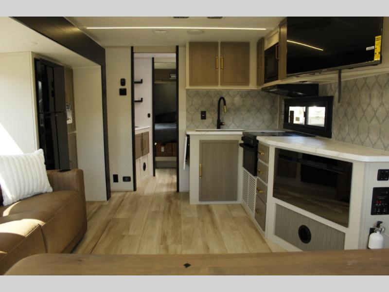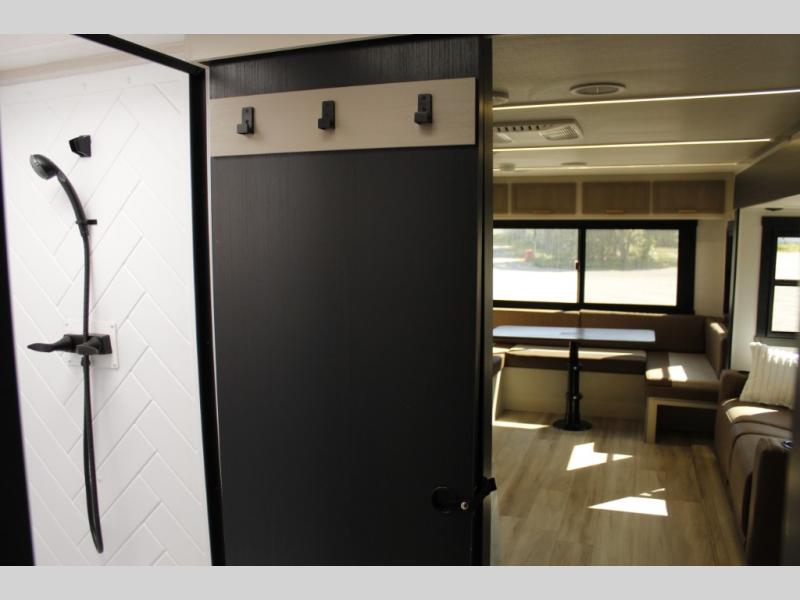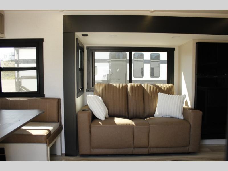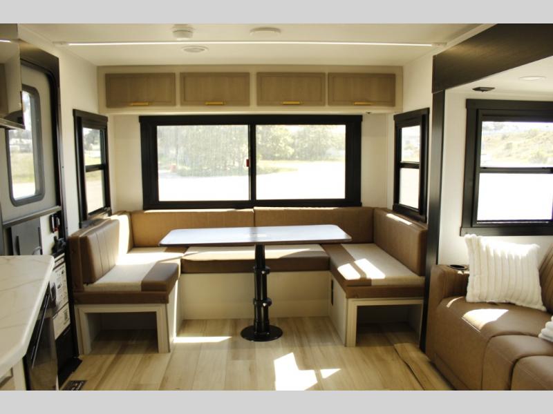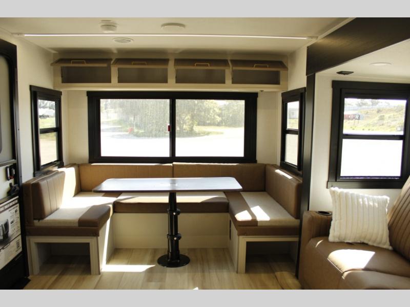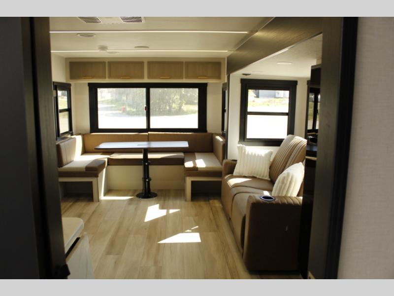 If you've been looking to upgrade your RV, the time is now and the this travel trailer is the one! You will love being able to cook indoors on the three burner cooktop or outdoors on the exterior griddle, plus there is a 19' awning with LED lights for an inviting space. Inside, you can dine around the U-shaped dinette, and this area can become sleeping space for one to two guests. Kick up your feet on the theater seating across from the 40" LED TV and fireplace, then clean up in the walk-through bath before bed. Speaking of bed, you'll love the walk-around queen bed with Versa-Tilt in the master bedroom, and you'll find the second entry door here as well for convenience!