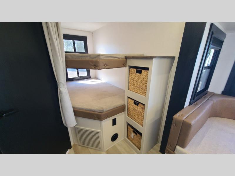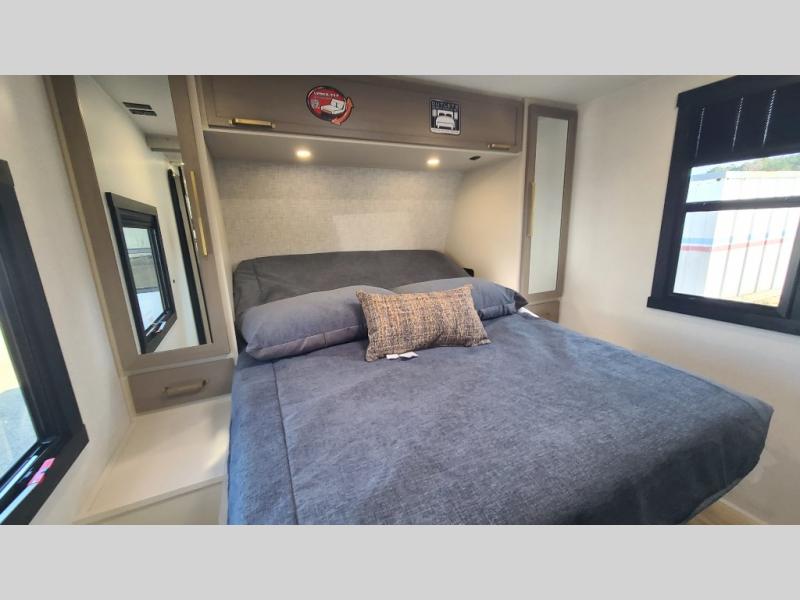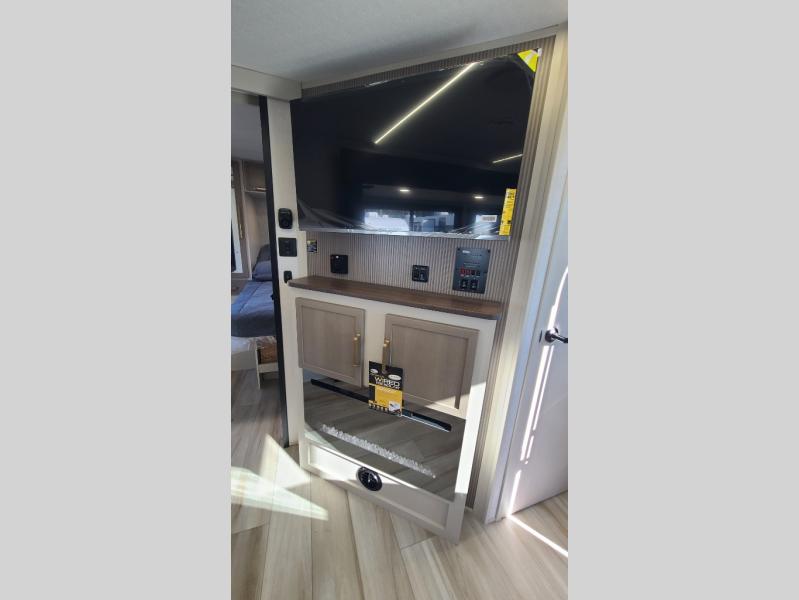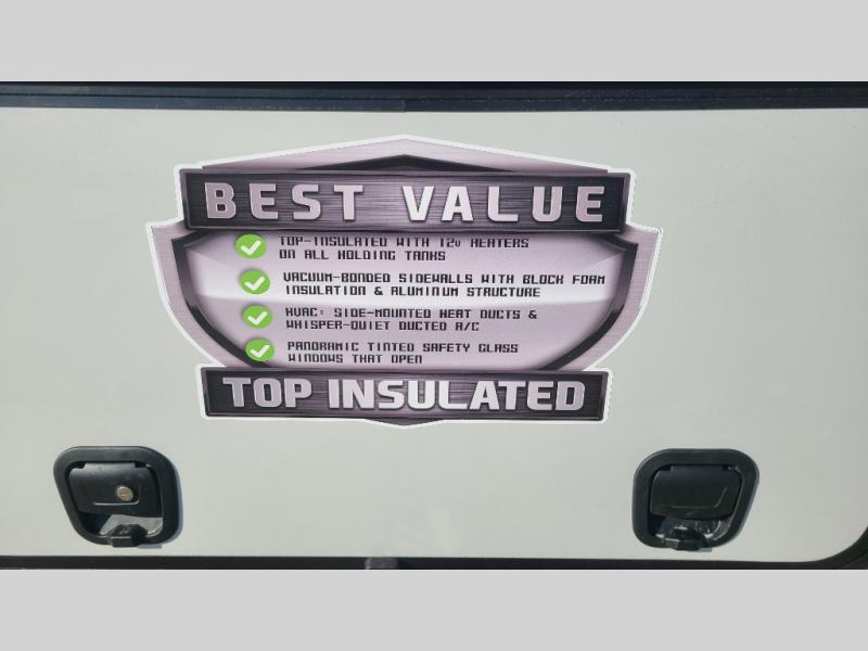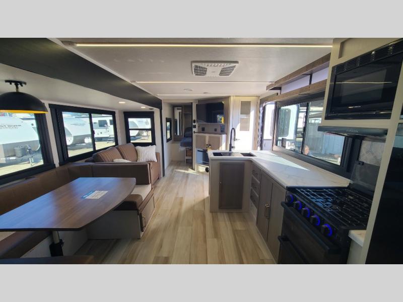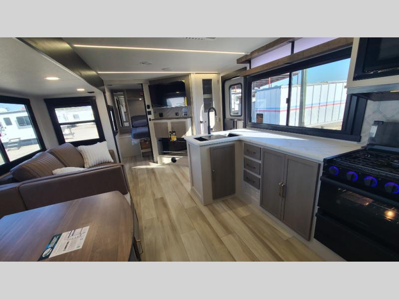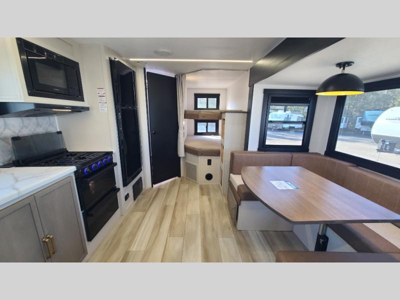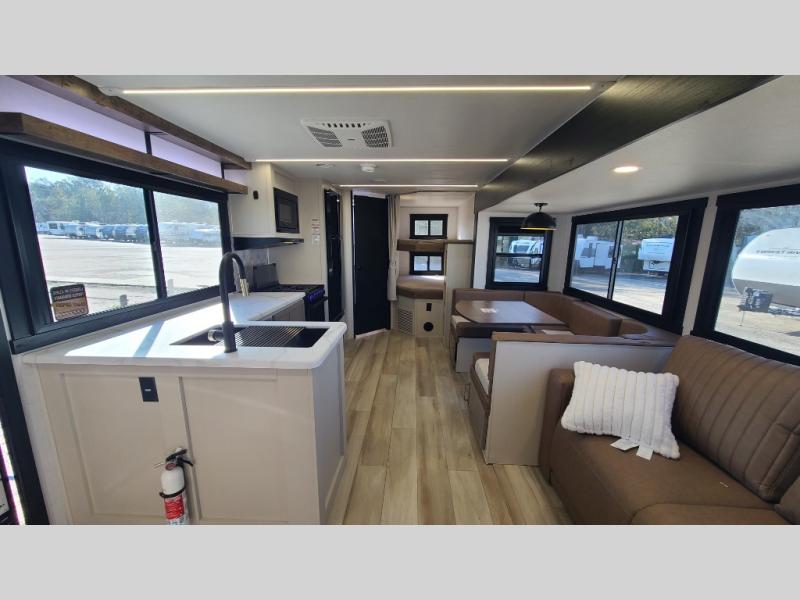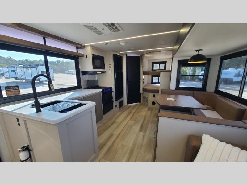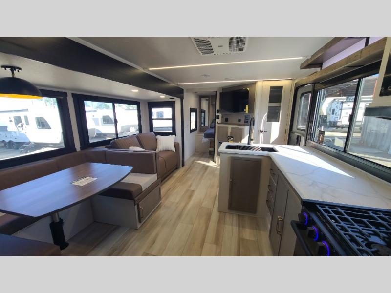 This dual entry travel trailer is the perfect unit to travel with a larger group since there is sleeping for ten! There are double-size bunks in the rear corner, a queen bed with Versa Tilt in the front private bedroom, plus a U-shaped dinette and tri-fold sofa in the main living area. The rear corner bath includes a walk-in shower with a skylight, a spacious linen closet, and one of the dual entry doors for added convenience. The chef of your group will love the camp kitchen window with shelves above for spices, and there is an exterior griddle and mount if they enjoy cooking outdoors. This unit also includes an entertainment center with a 40" LED Smart TV and a fireplace for a cozy evening indoors, and the entry pantry will be perfect to keep snacks stocked!