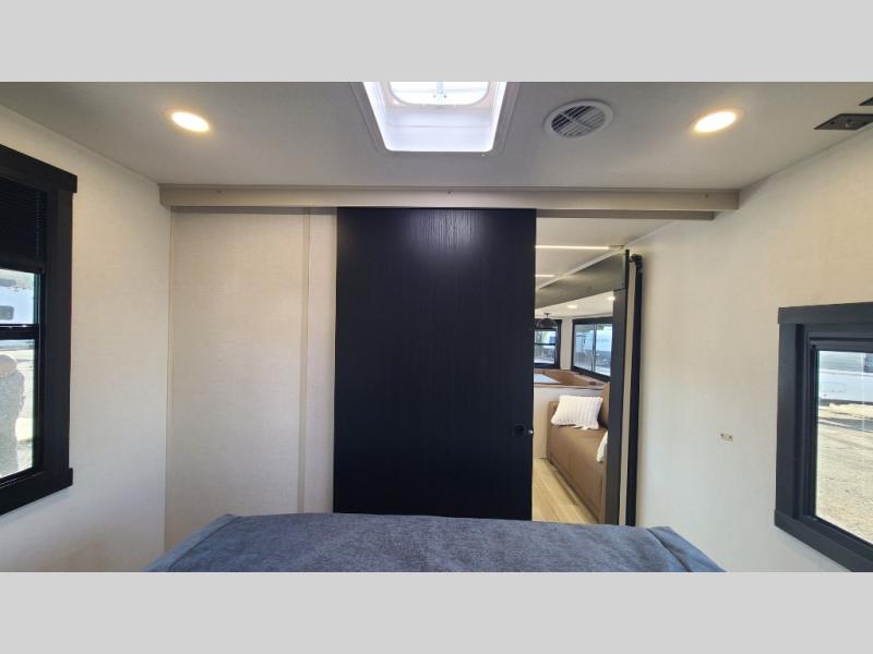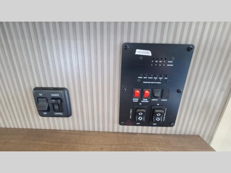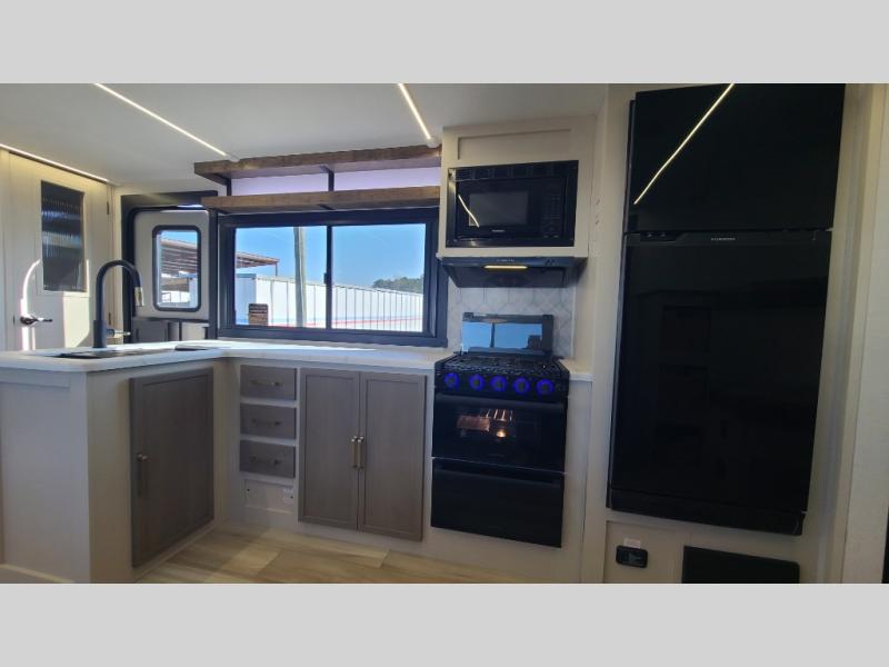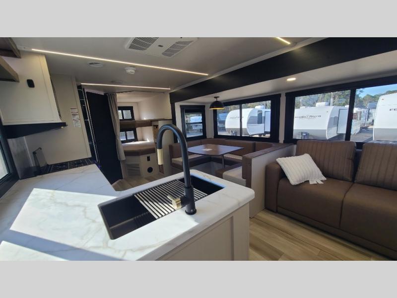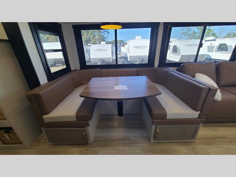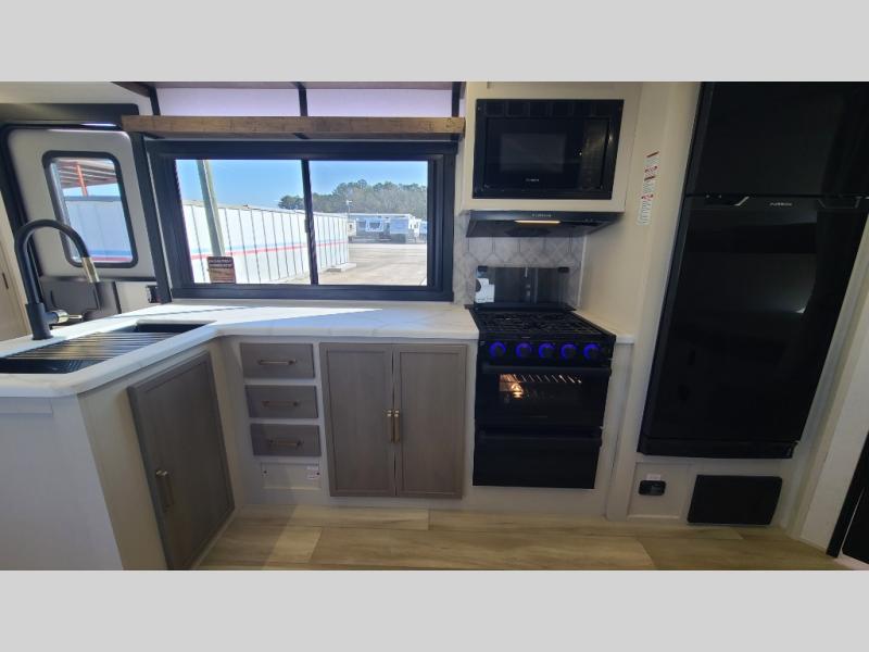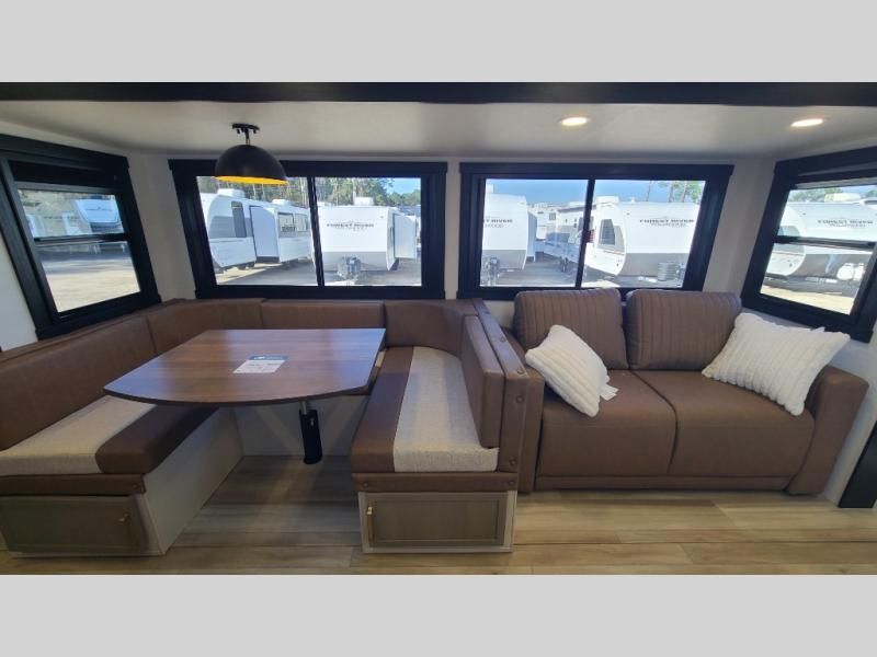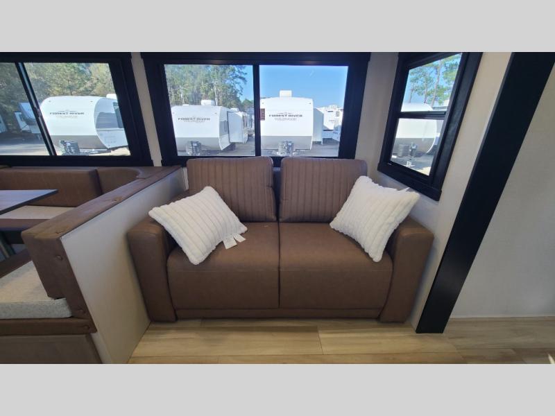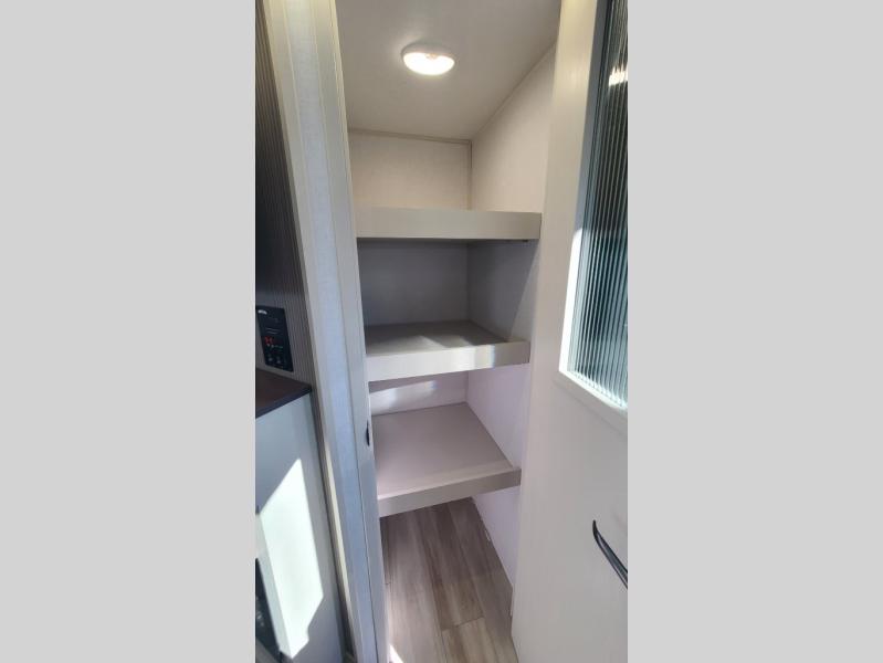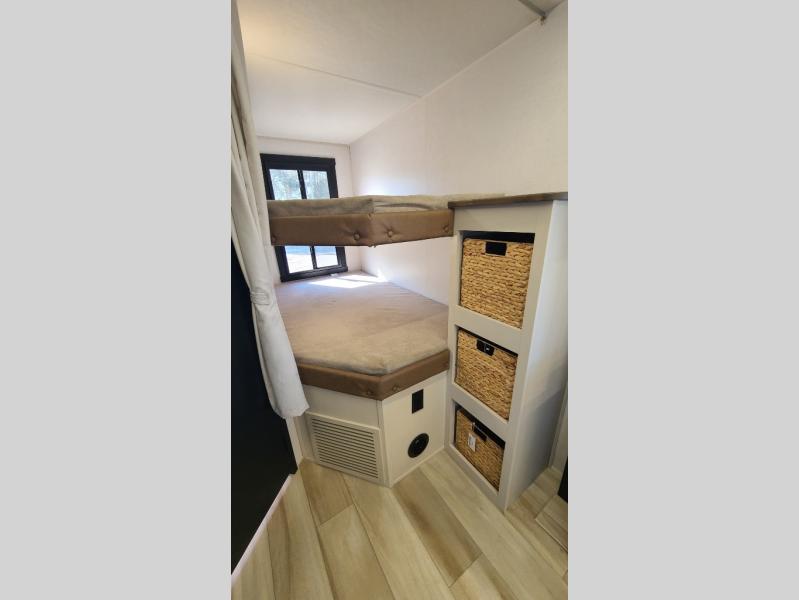 This dual entry travel trailer is the perfect unit to travel with a larger group since there is sleeping for ten! There are double-size bunks in the rear corner, a queen bed with Versa Tilt in the front private bedroom, plus a U-shaped dinette and tri-fold sofa in the main living area. The rear corner bath includes a walk-in shower with a skylight, a spacious linen closet, and one of the dual entry doors for added convenience. The chef of your group will love the camp kitchen window with shelves above for spices, and there is an exterior griddle and mount if they enjoy cooking outdoors. This unit also includes an entertainment center with a 40" LED Smart TV and a fireplace for a cozy evening indoors, and the entry pantry will be perfect to keep snacks stocked!