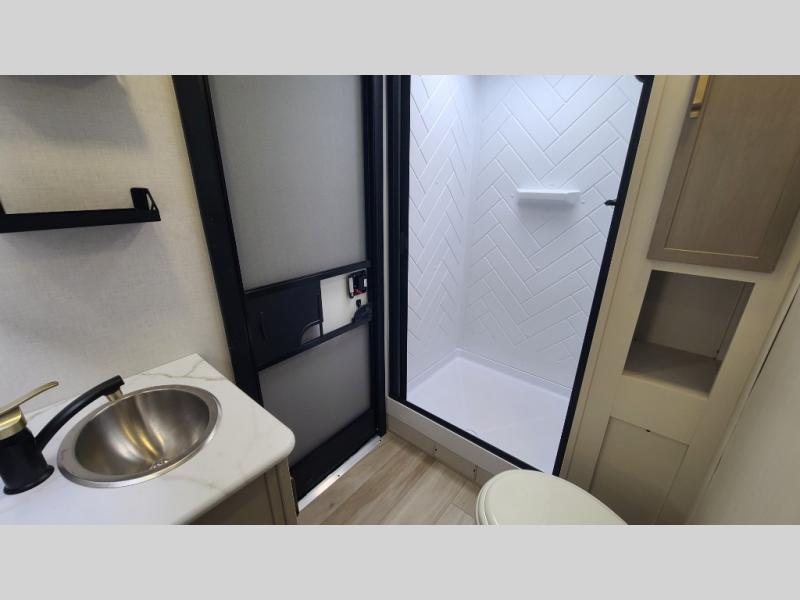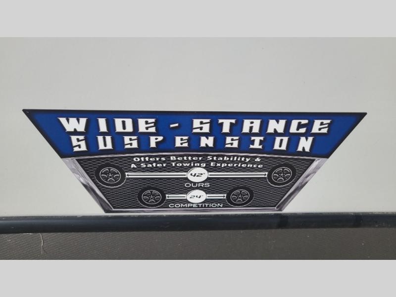 The Wildwood Heritage Glen Hyper-Lyte travel trailer by Forest River offers stability with a wide stance axle system, easy setup with a power tongue jack with an LED docking light, and safe entry with the Step Above aluminum entry steps. The interior includes Temple Cherry cabinetry with matte gold hardware, hidden hinges on the cabinet doors, and a residential single bowl undermount sink. You will also find a back-up camera prep and solar prep, an outdoor shower, Maxxis radial tires, and many more exterior conveniences.