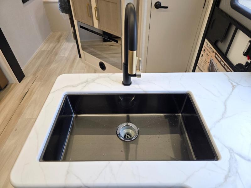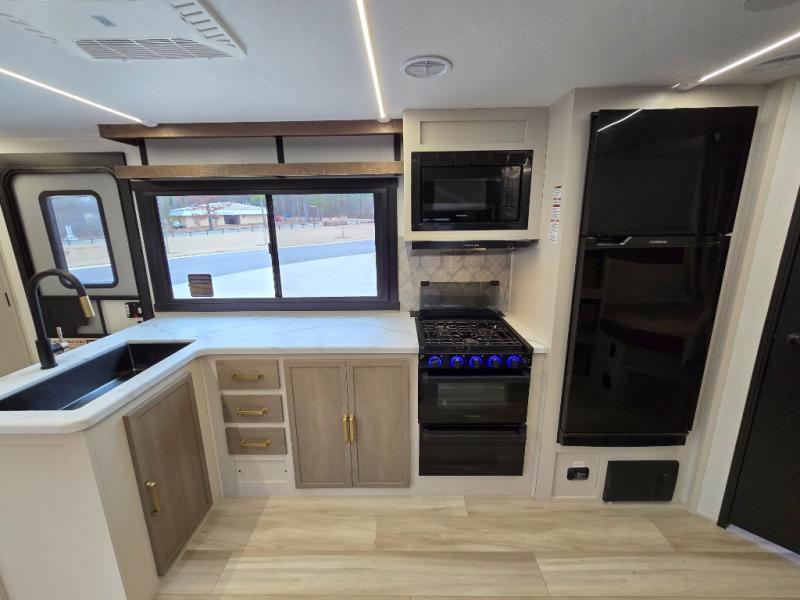 The Wildwood Heritage Glen Hyper-Lyte travel trailer by Forest River offers stability with a wide stance axle system, easy setup with a power tongue jack with an LED docking light, and safe entry with the Step Above aluminum entry steps. The interior includes Temple Cherry cabinetry with matte gold hardware, hidden hinges on the cabinet doors, and a residential single bowl undermount sink. You will also find a back-up camera prep and solar prep, an outdoor shower, Maxxis radial tires, and many more exterior conveniences.