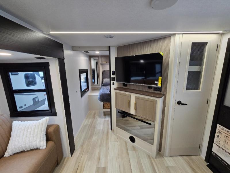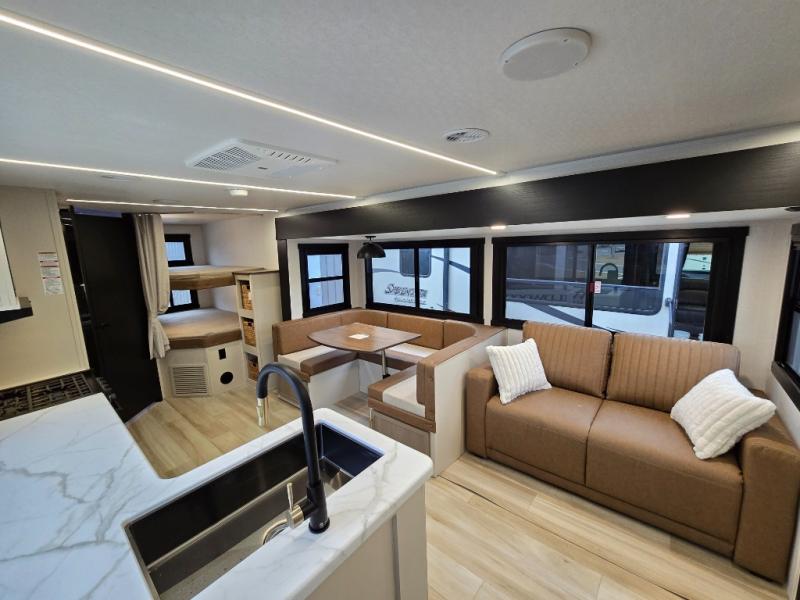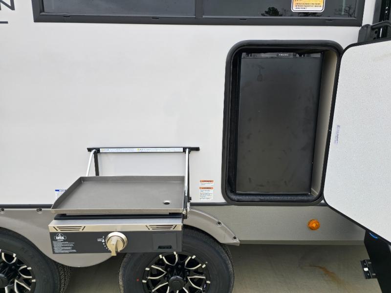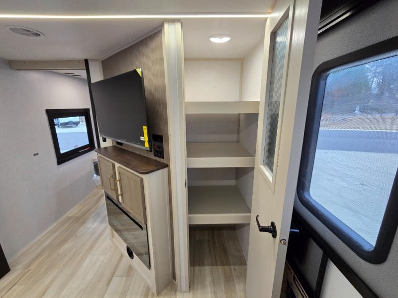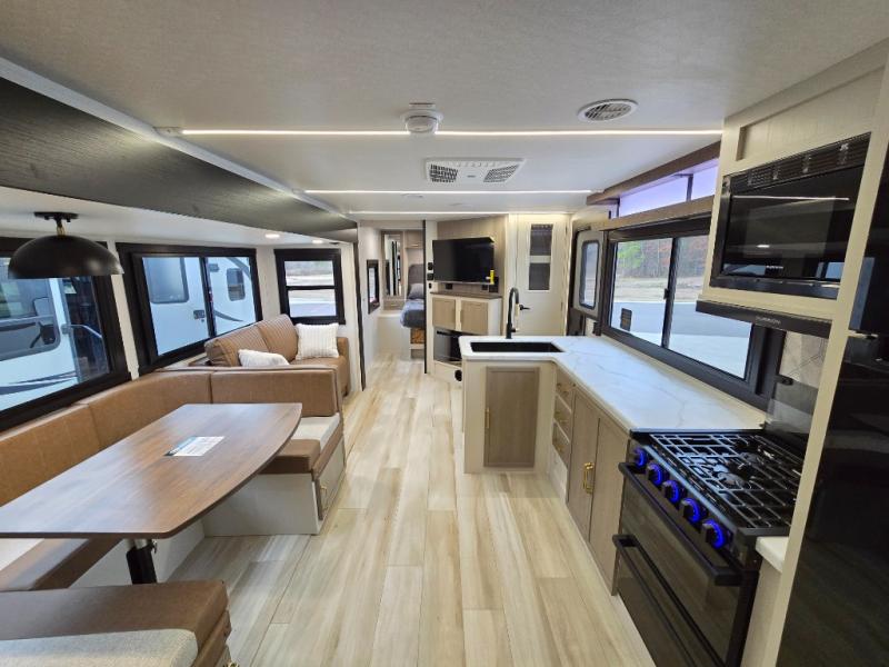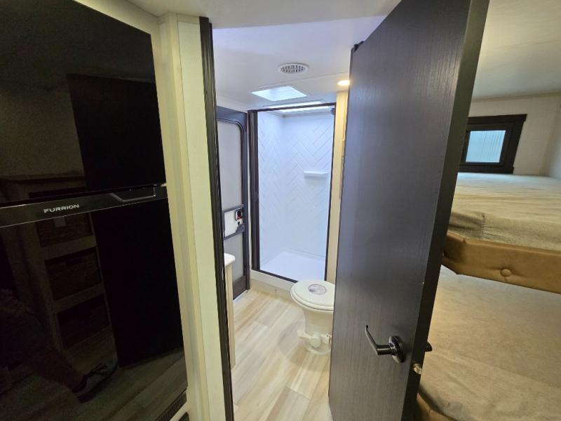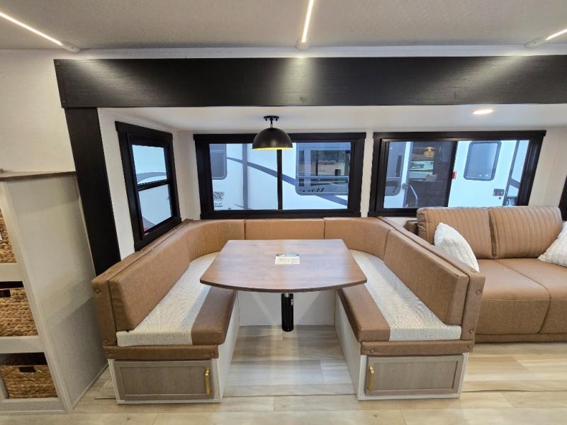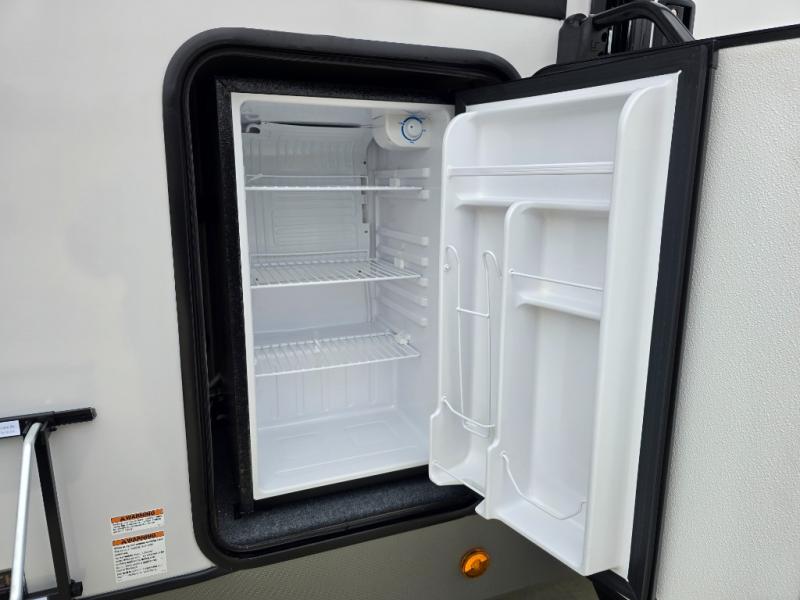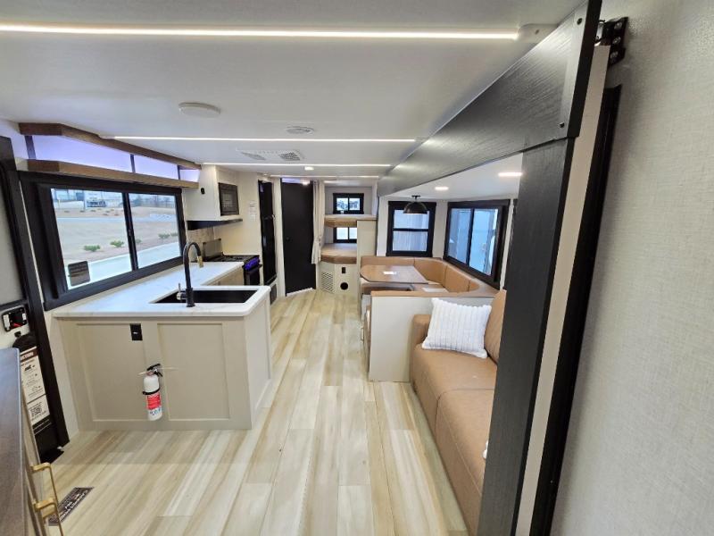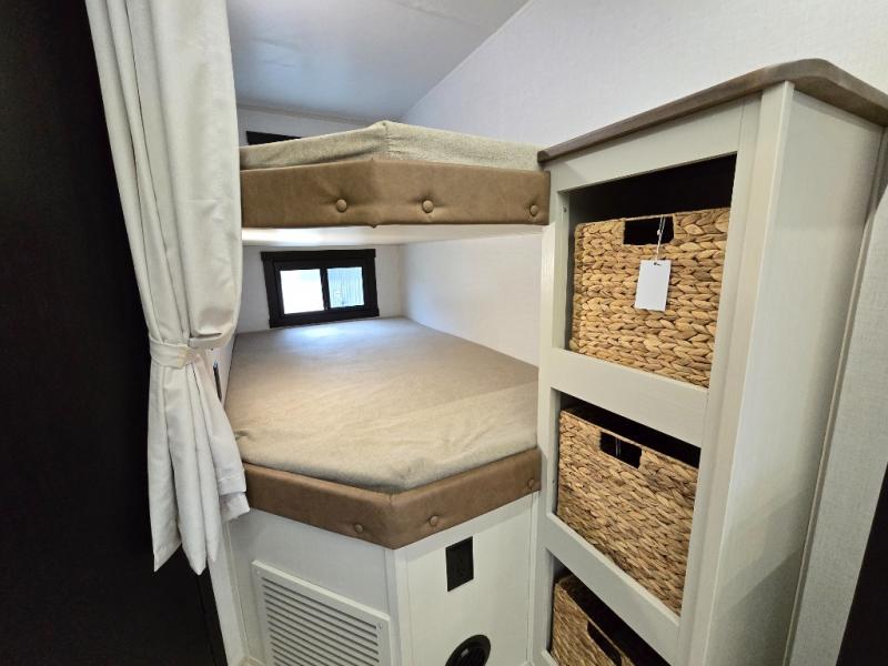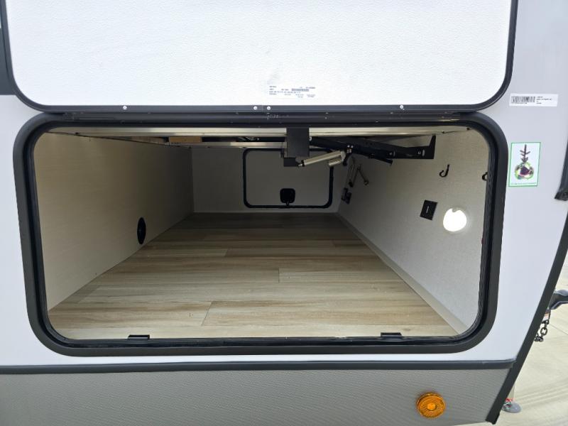 This dual entry travel trailer is the perfect unit to travel with a larger group since there is sleeping for ten! There are double-size bunks in the rear corner, a queen bed with Versa Tilt in the front private bedroom, plus a U-shaped dinette and tri-fold sofa in the main living area. The rear corner bath includes a walk-in shower with a skylight, a spacious linen closet, and one of the dual entry doors for added convenience. The chef of your group will love the camp kitchen window with shelves above for spices, and there is an exterior griddle and mount if they enjoy cooking outdoors. This unit also includes an entertainment center with a 40" LED Smart TV and a fireplace for a cozy evening indoors, and the entry pantry will be perfect to keep snacks stocked!