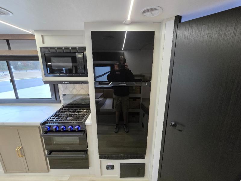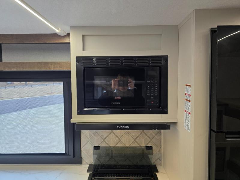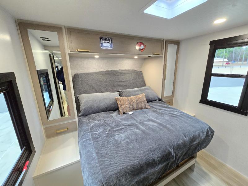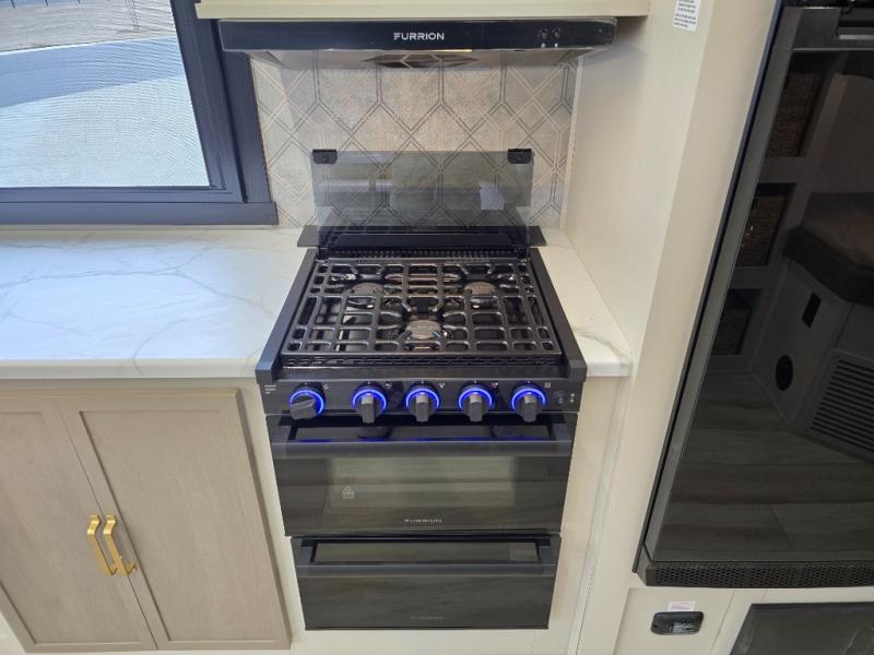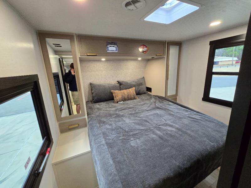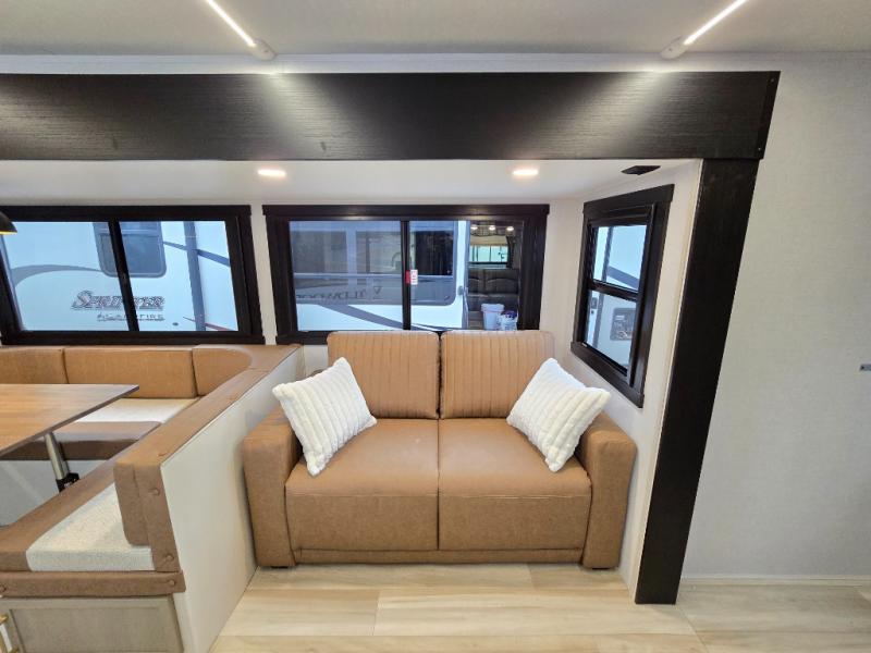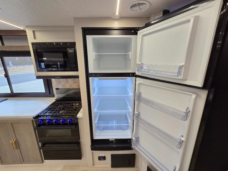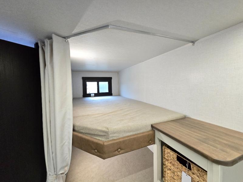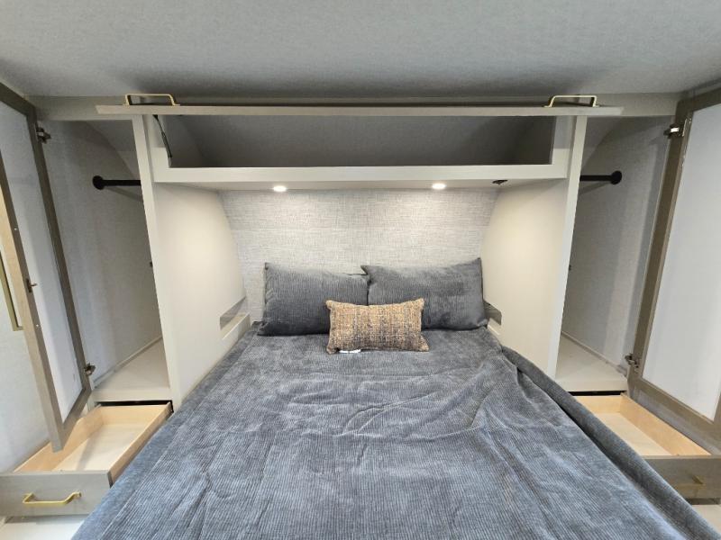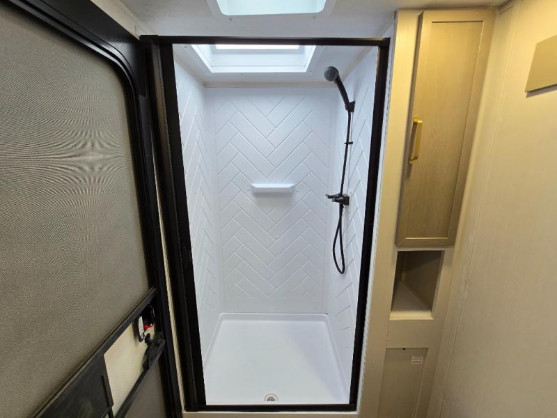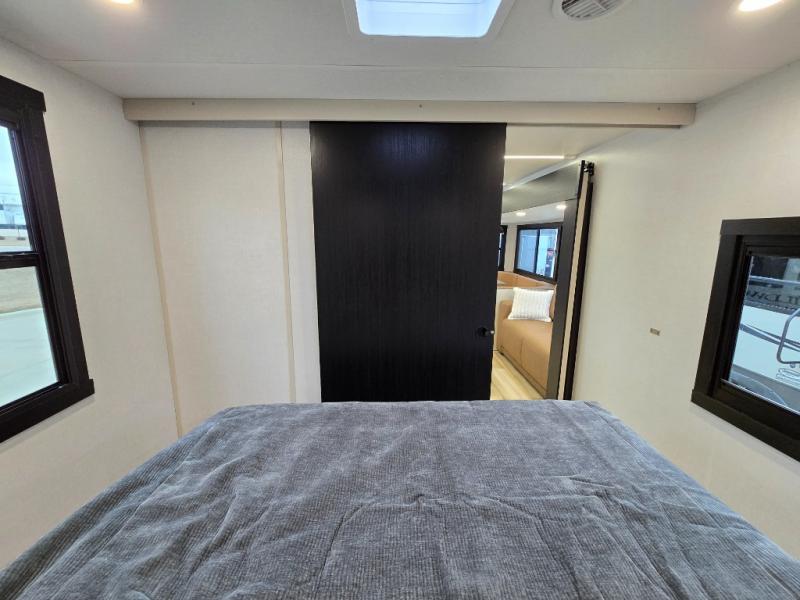 This dual entry travel trailer is the perfect unit to travel with a larger group since there is sleeping for ten! There are double-size bunks in the rear corner, a queen bed with Versa Tilt in the front private bedroom, plus a U-shaped dinette and tri-fold sofa in the main living area. The rear corner bath includes a walk-in shower with a skylight, a spacious linen closet, and one of the dual entry doors for added convenience. The chef of your group will love the camp kitchen window with shelves above for spices, and there is an exterior griddle and mount if they enjoy cooking outdoors. This unit also includes an entertainment center with a 40" LED Smart TV and a fireplace for a cozy evening indoors, and the entry pantry will be perfect to keep snacks stocked!