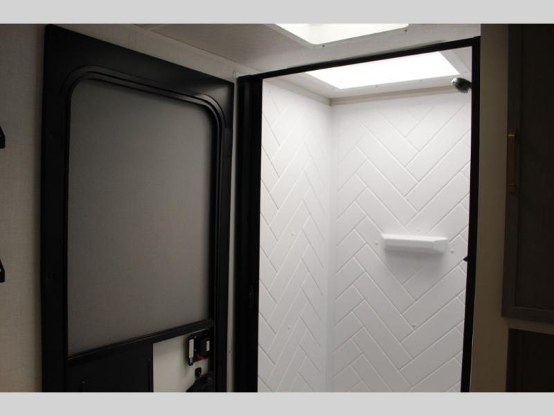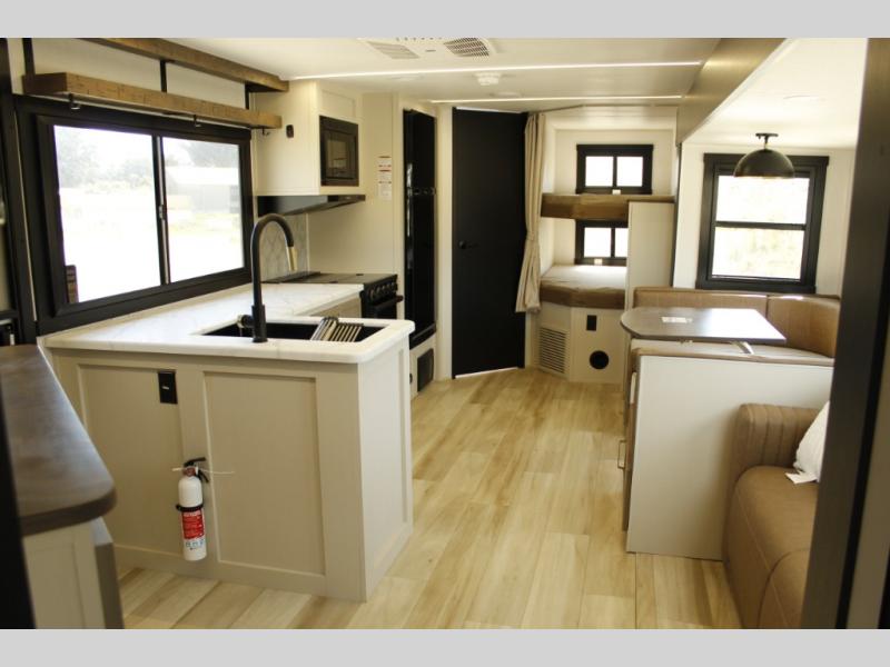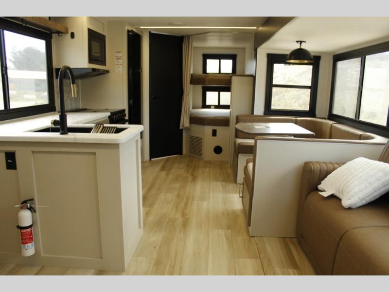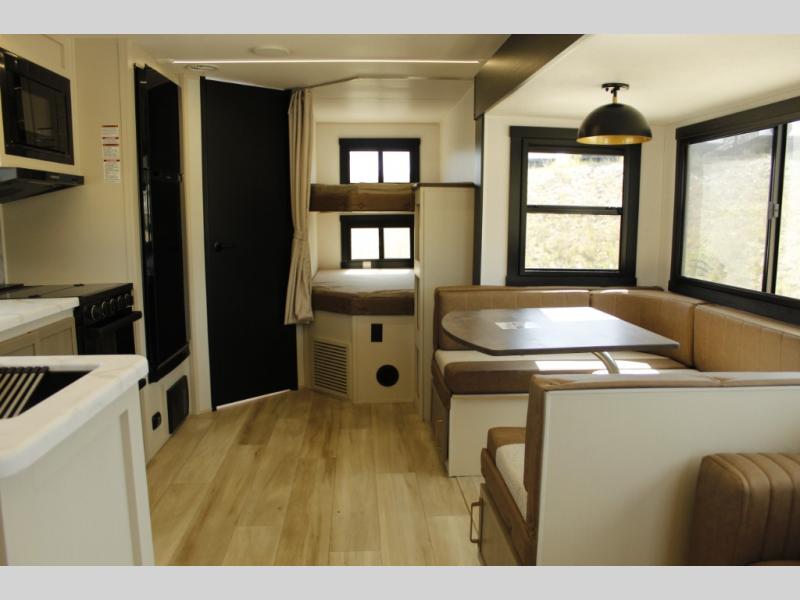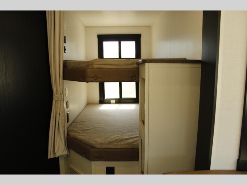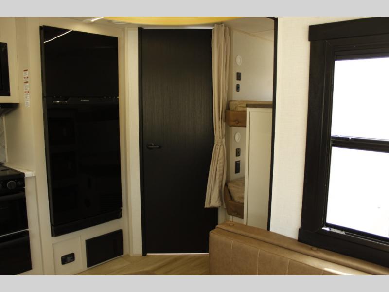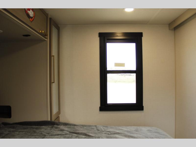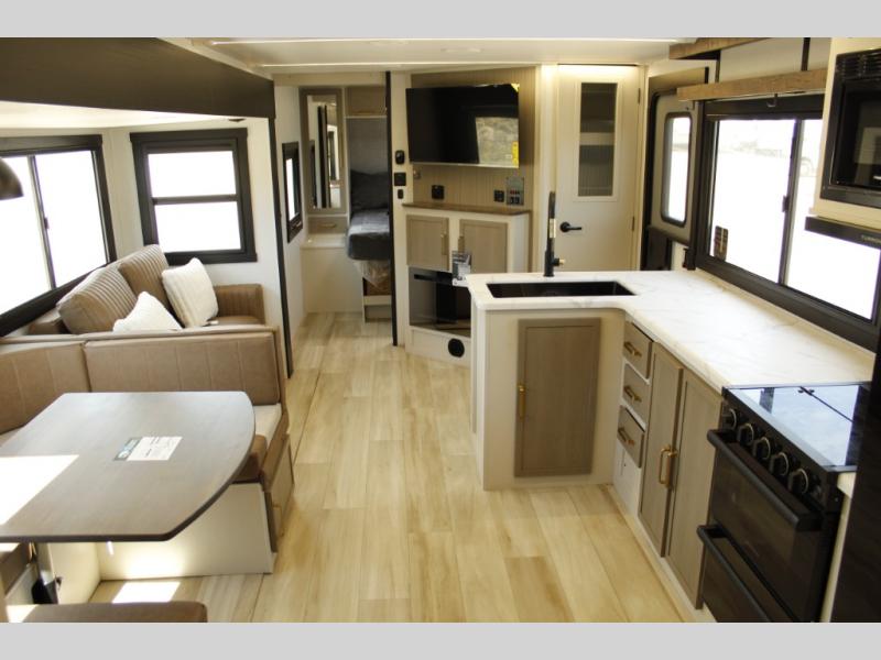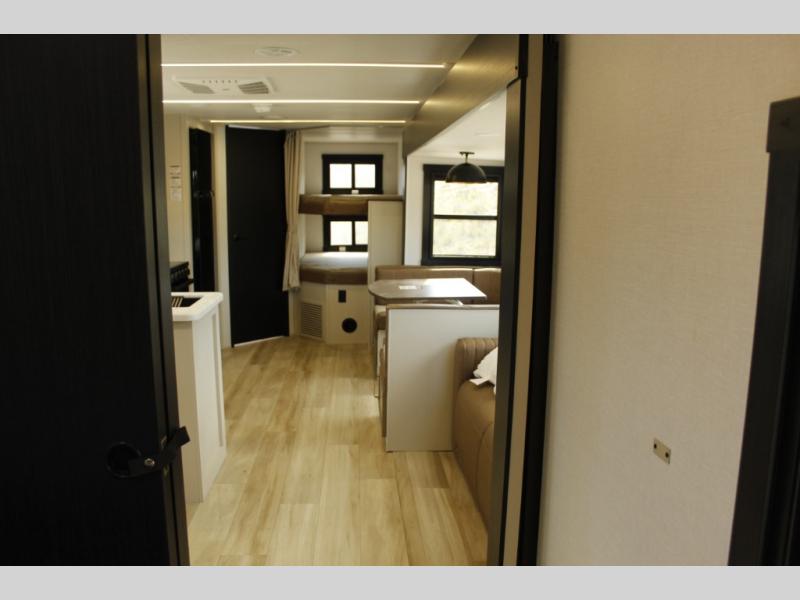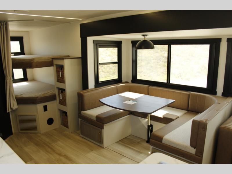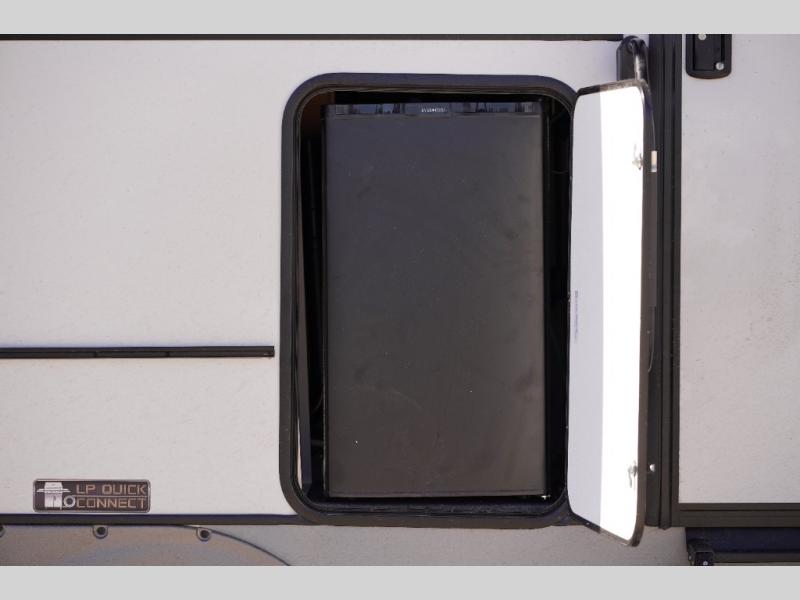 This dual entry travel trailer is the perfect unit to travel with a larger group since there is sleeping for ten! There are double-size bunks in the rear corner, a queen bed with Versa Tilt in the front private bedroom, plus a U-shaped dinette and tri-fold sofa in the main living area. The rear corner bath includes a walk-in shower with a skylight, a spacious linen closet, and one of the dual entry doors for added convenience. The chef of your group will love the camp kitchen window with shelves above for spices, and there is an exterior griddle and mount if they enjoy cooking outdoors. This unit also includes an entertainment center with a 40" LED Smart TV and a fireplace for a cozy evening indoors, and the entry pantry will be perfect to keep snacks stocked!
