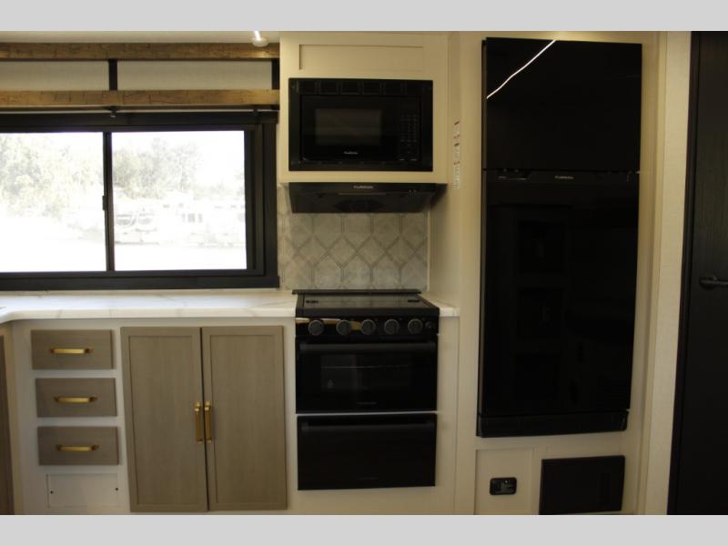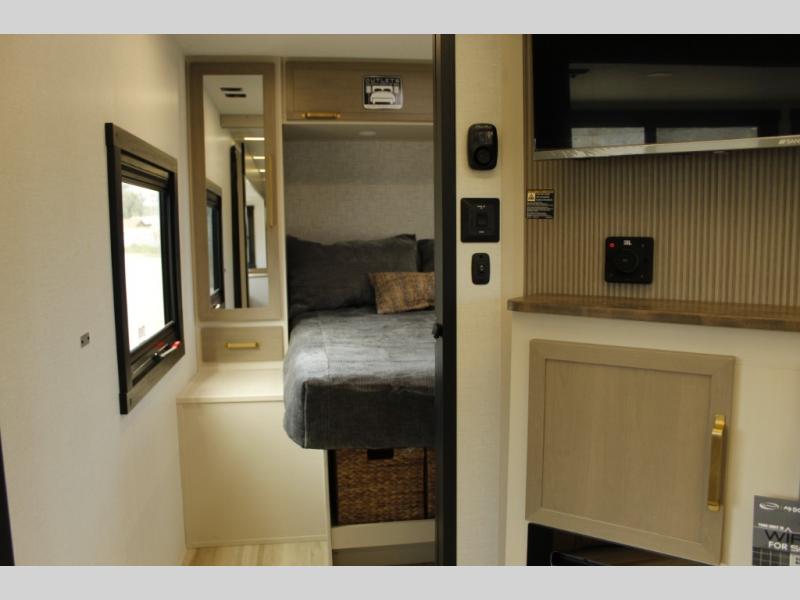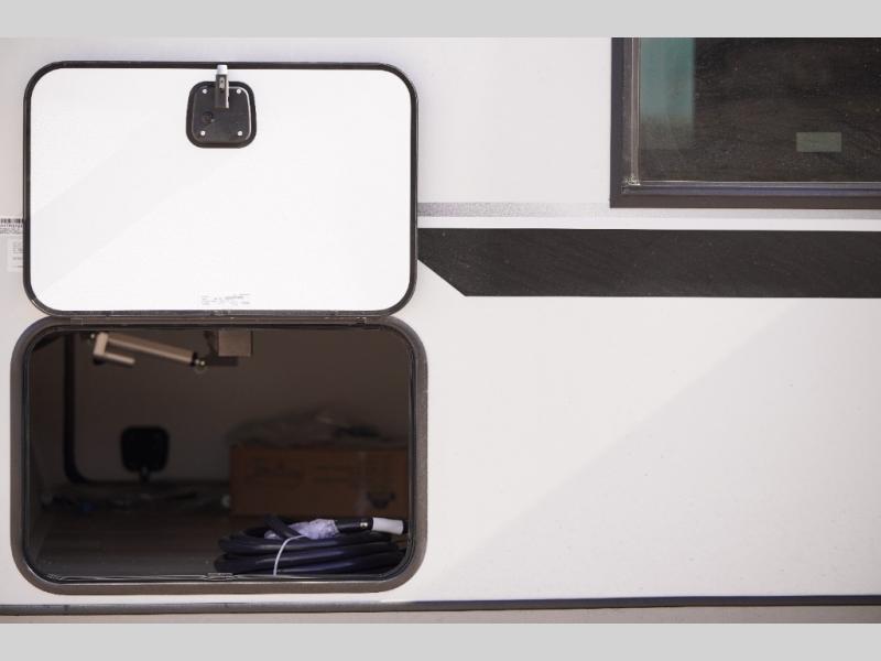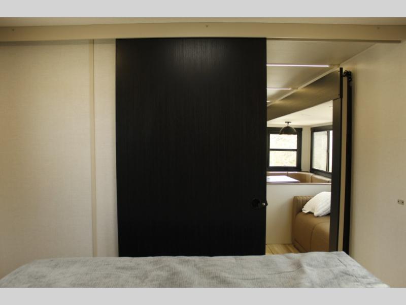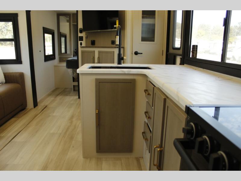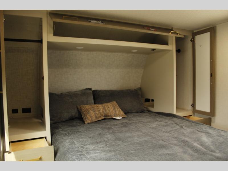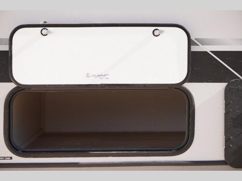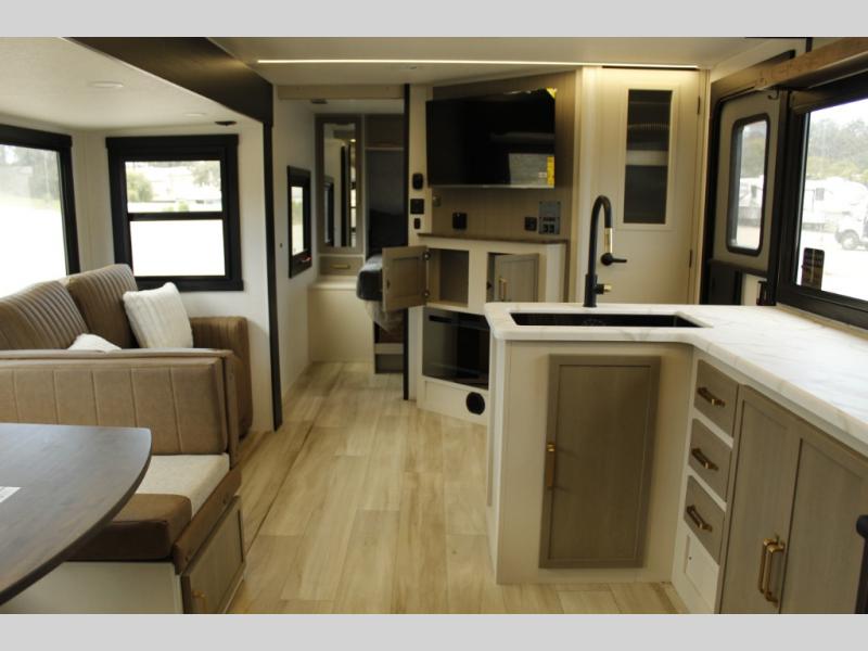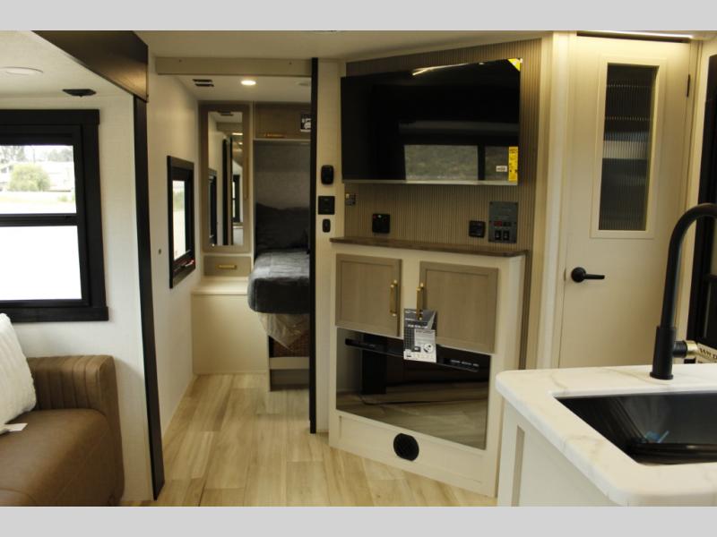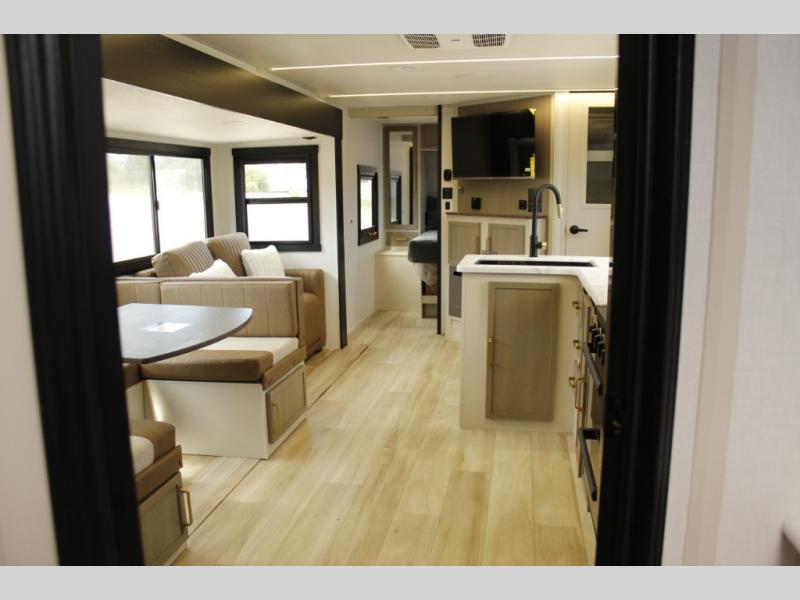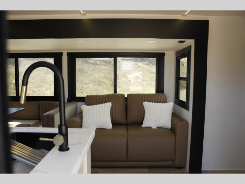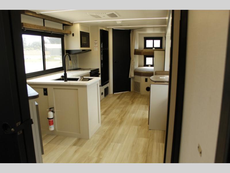 This dual entry travel trailer is the perfect unit to travel with a larger group since there is sleeping for ten! There are double-size bunks in the rear corner, a queen bed with Versa Tilt in the front private bedroom, plus a U-shaped dinette and tri-fold sofa in the main living area. The rear corner bath includes a walk-in shower with a skylight, a spacious linen closet, and one of the dual entry doors for added convenience. The chef of your group will love the camp kitchen window with shelves above for spices, and there is an exterior griddle and mount if they enjoy cooking outdoors. This unit also includes an entertainment center with a 40" LED Smart TV and a fireplace for a cozy evening indoors, and the entry pantry will be perfect to keep snacks stocked!