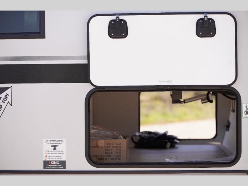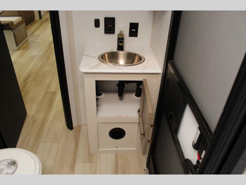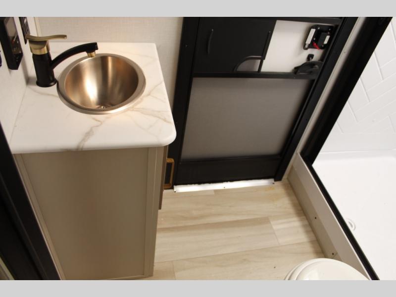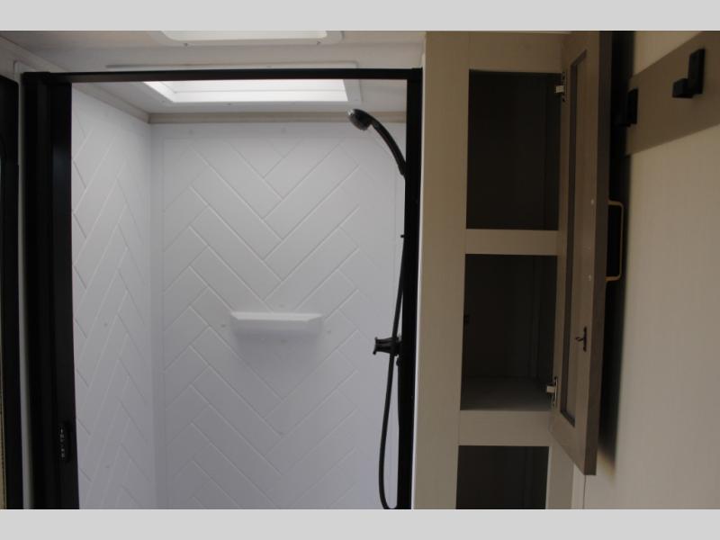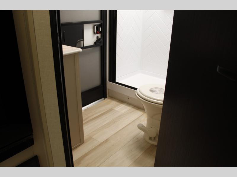 The Wildwood Heritage Glen Hyper-Lyte travel trailer by Forest River offers stability with a wide stance axle system, easy setup with a power tongue jack with an LED docking light, and safe entry with the Step Above aluminum entry steps. The interior includes Temple Cherry cabinetry with matte gold hardware, hidden hinges on the cabinet doors, and a residential single bowl undermount sink. You will also find a back-up camera prep and solar prep, an outdoor shower, Maxxis radial tires, and many more exterior conveniences.