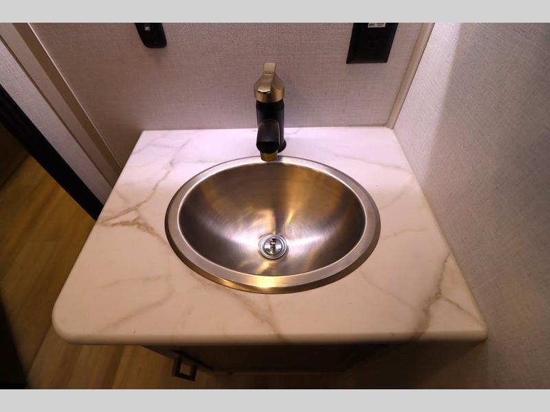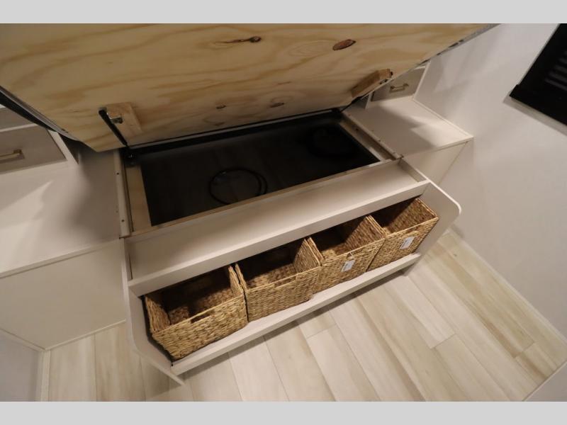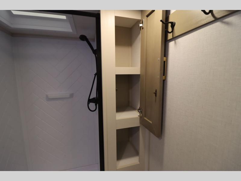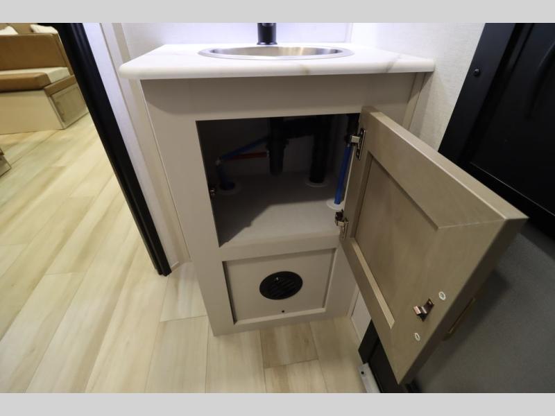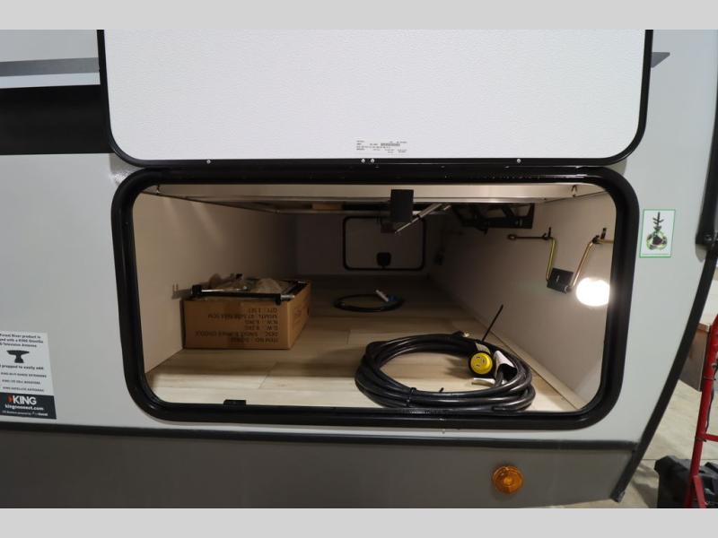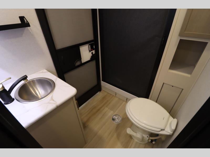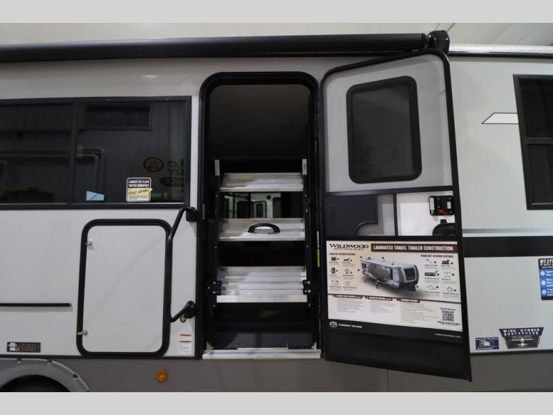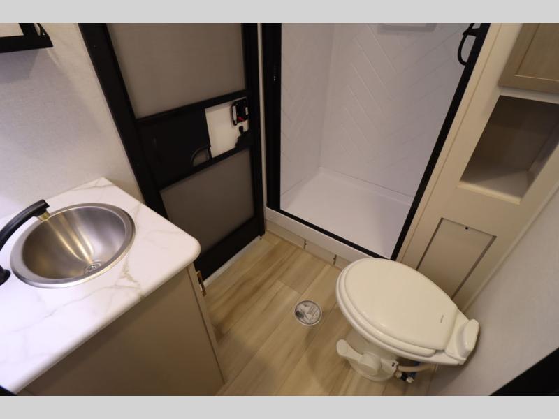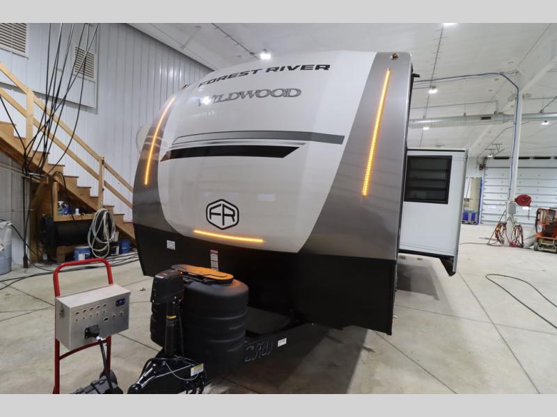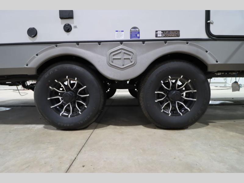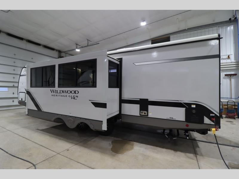 The Wildwood Heritage Glen Hyper-Lyte travel trailer by Forest River offers stability with a wide stance axle system, easy setup with a power tongue jack with an LED docking light, and safe entry with the Step Above aluminum entry steps. The interior includes Temple Cherry cabinetry with matte gold hardware, hidden hinges on the cabinet doors, and a residential single bowl undermount sink. You will also find a back-up camera prep and solar prep, an outdoor shower, Maxxis radial tires, and many more exterior conveniences.