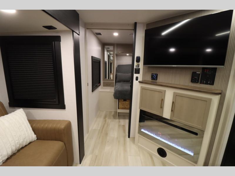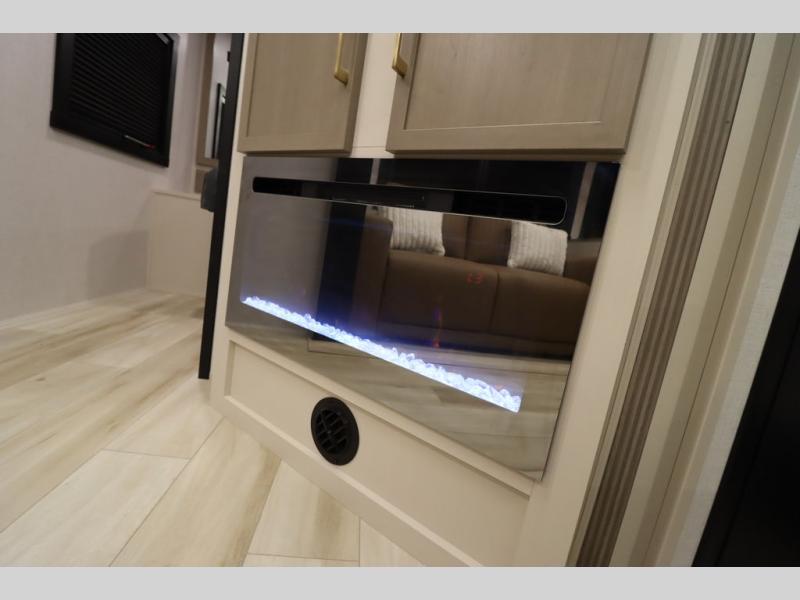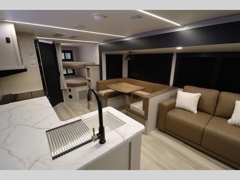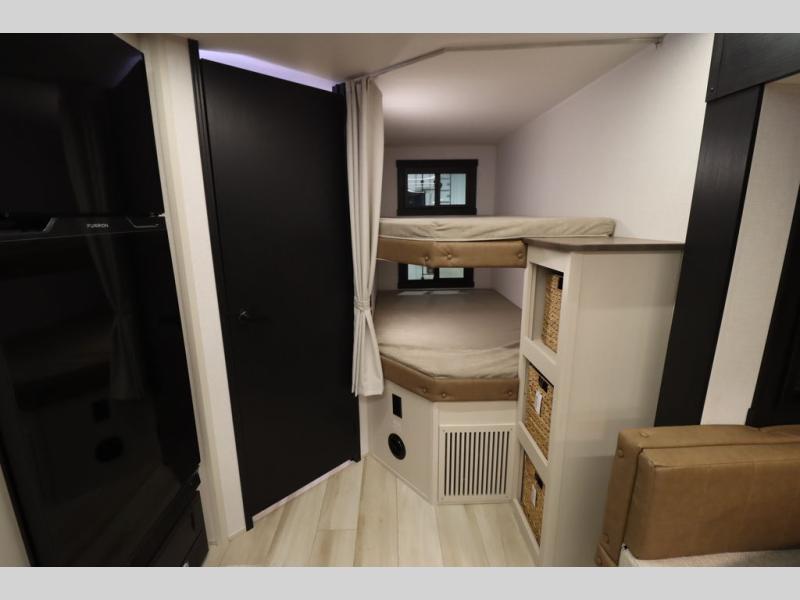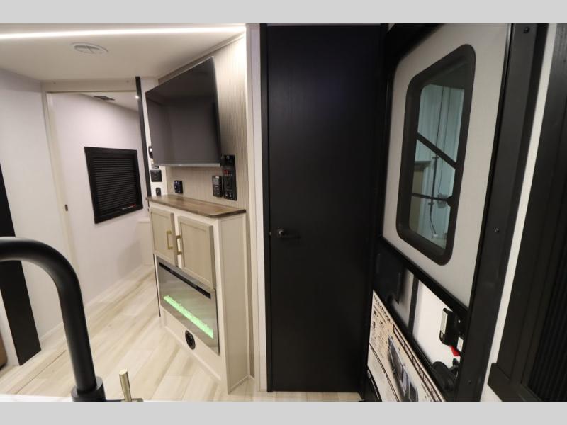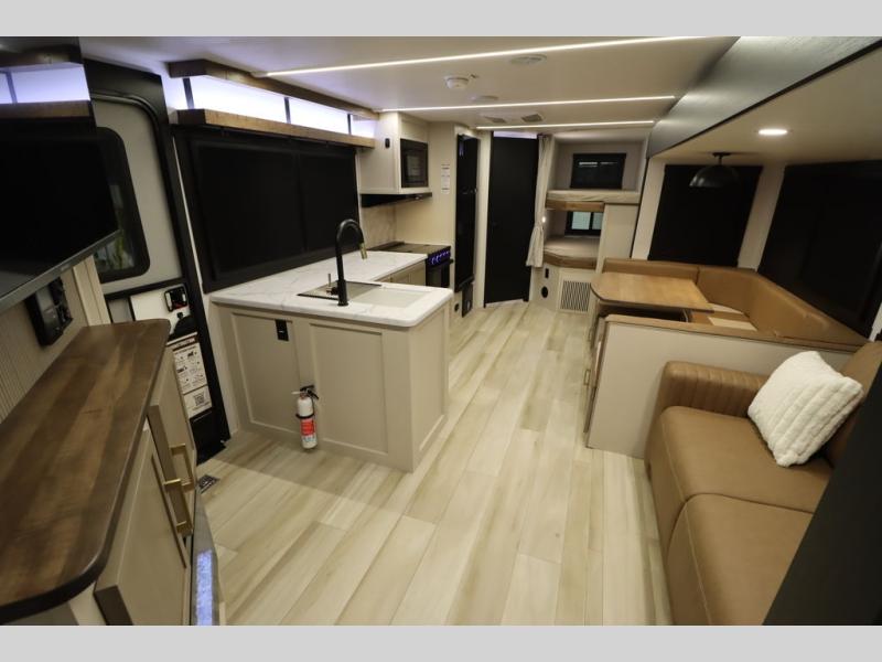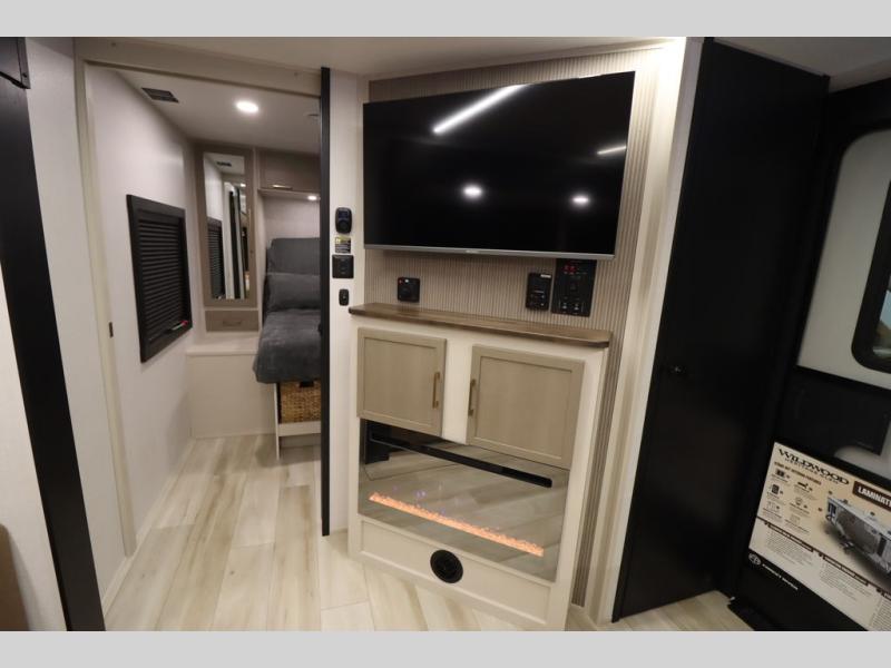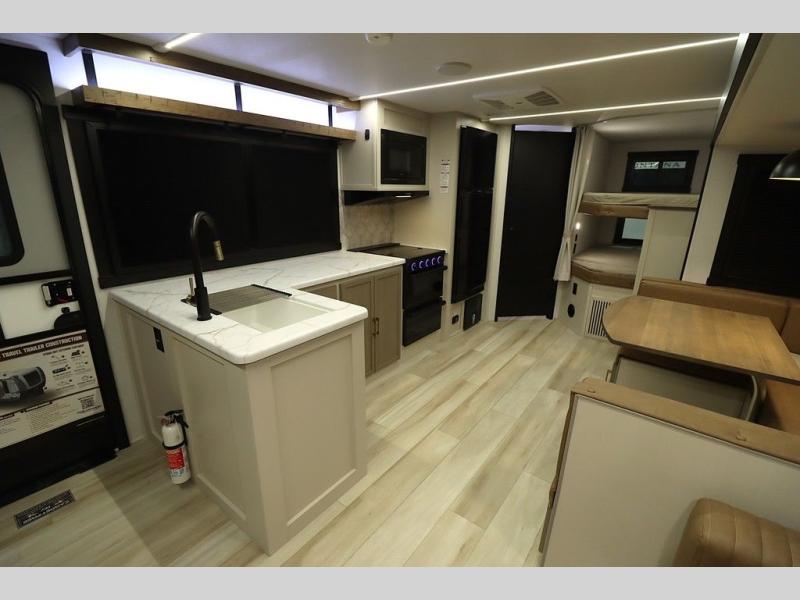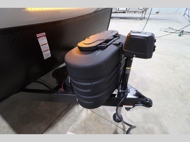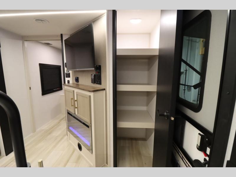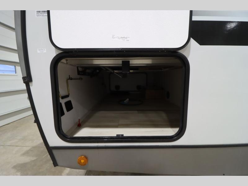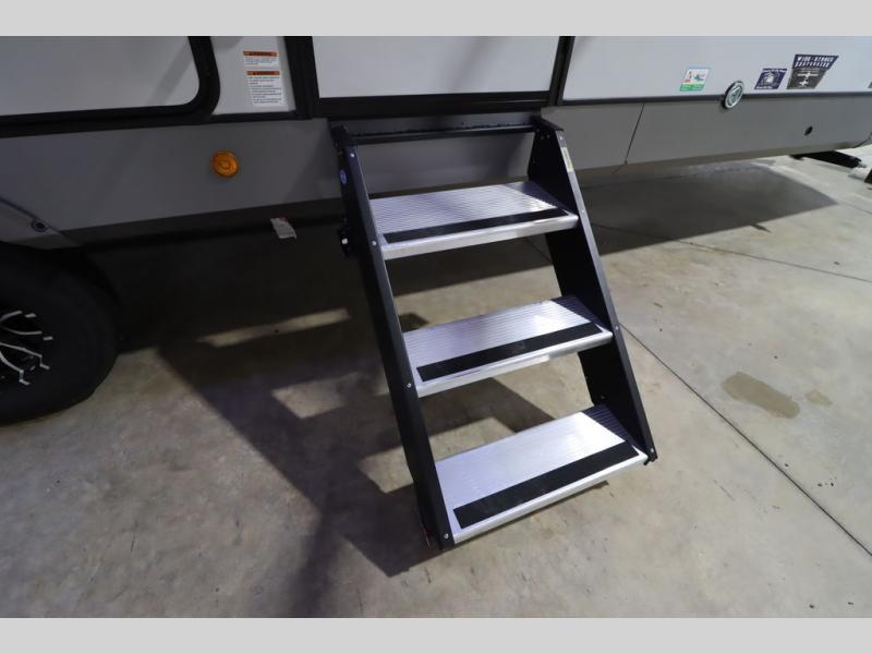 This dual entry travel trailer is the perfect unit to travel with a larger group since there is sleeping for ten! There are double-size bunks in the rear corner, a queen bed with Versa Tilt in the front private bedroom, plus a U-shaped dinette and tri-fold sofa in the main living area. The rear corner bath includes a walk-in shower with a skylight, a spacious linen closet, and one of the dual entry doors for added convenience. The chef of your group will love the camp kitchen window with shelves above for spices, and there is an exterior griddle and mount if they enjoy cooking outdoors. This unit also includes an entertainment center with a 40" LED Smart TV and a fireplace for a cozy evening indoors, and the entry pantry will be perfect to keep snacks stocked!