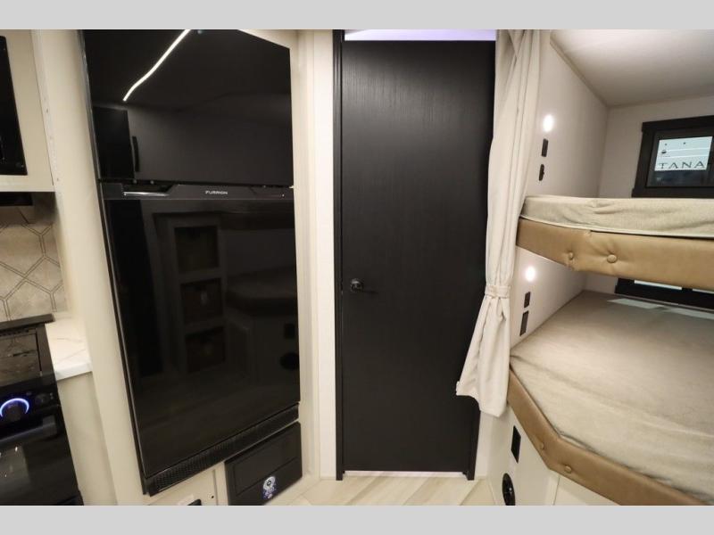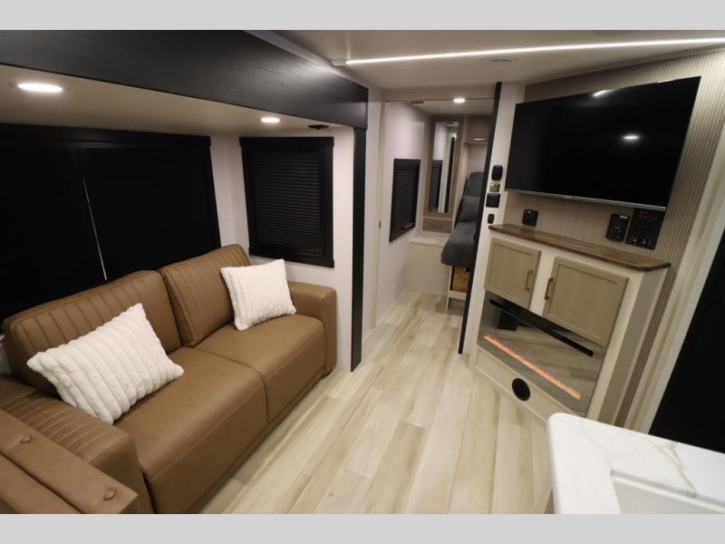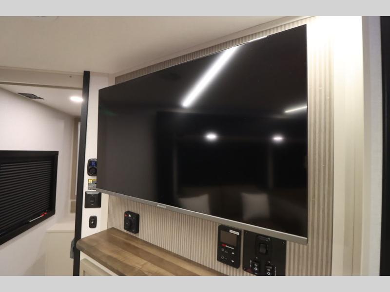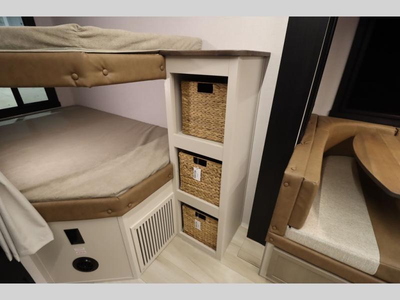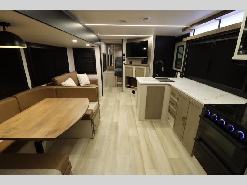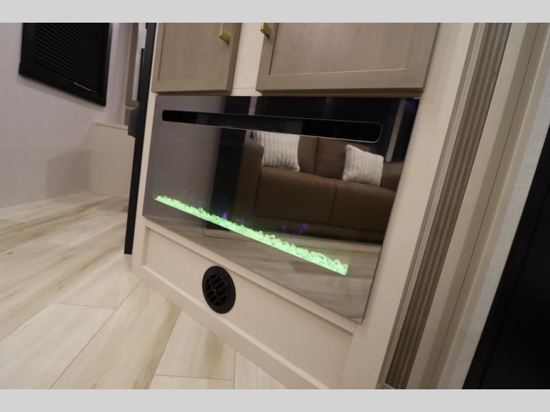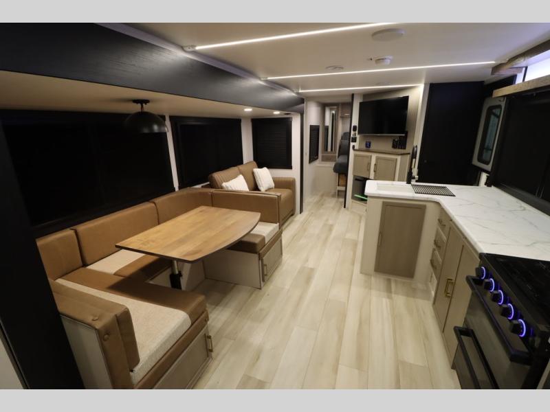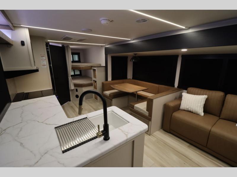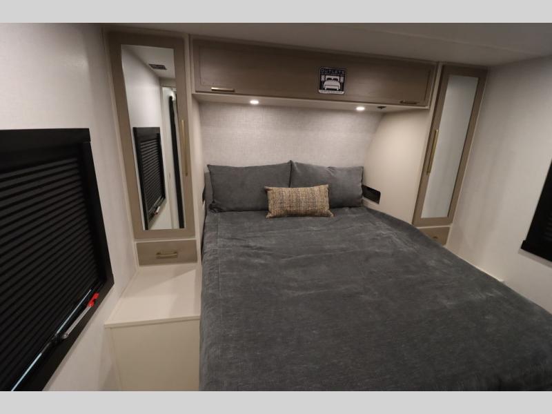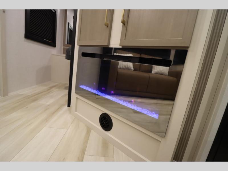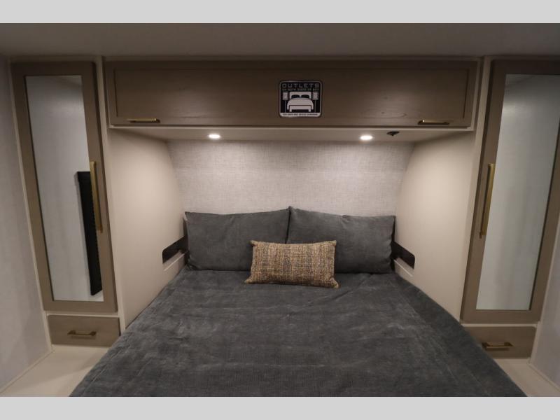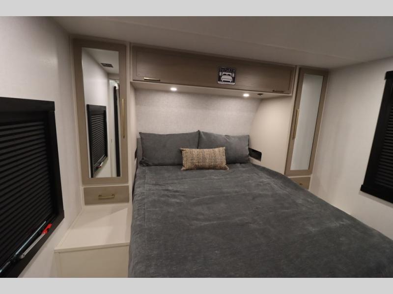 This dual entry travel trailer is the perfect unit to travel with a larger group since there is sleeping for ten! There are double-size bunks in the rear corner, a queen bed with Versa Tilt in the front private bedroom, plus a U-shaped dinette and tri-fold sofa in the main living area. The rear corner bath includes a walk-in shower with a skylight, a spacious linen closet, and one of the dual entry doors for added convenience. The chef of your group will love the camp kitchen window with shelves above for spices, and there is an exterior griddle and mount if they enjoy cooking outdoors. This unit also includes an entertainment center with a 40" LED Smart TV and a fireplace for a cozy evening indoors, and the entry pantry will be perfect to keep snacks stocked!