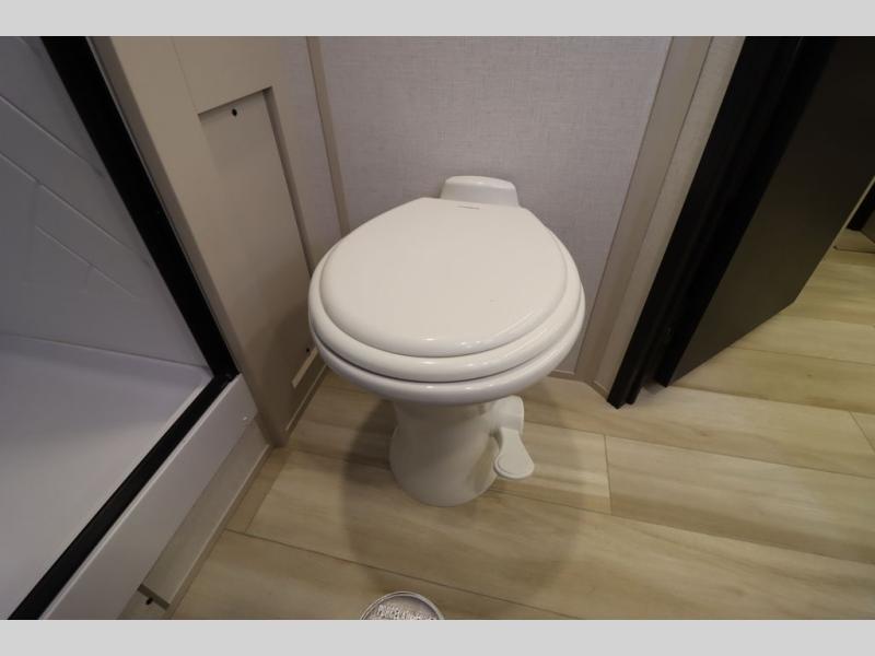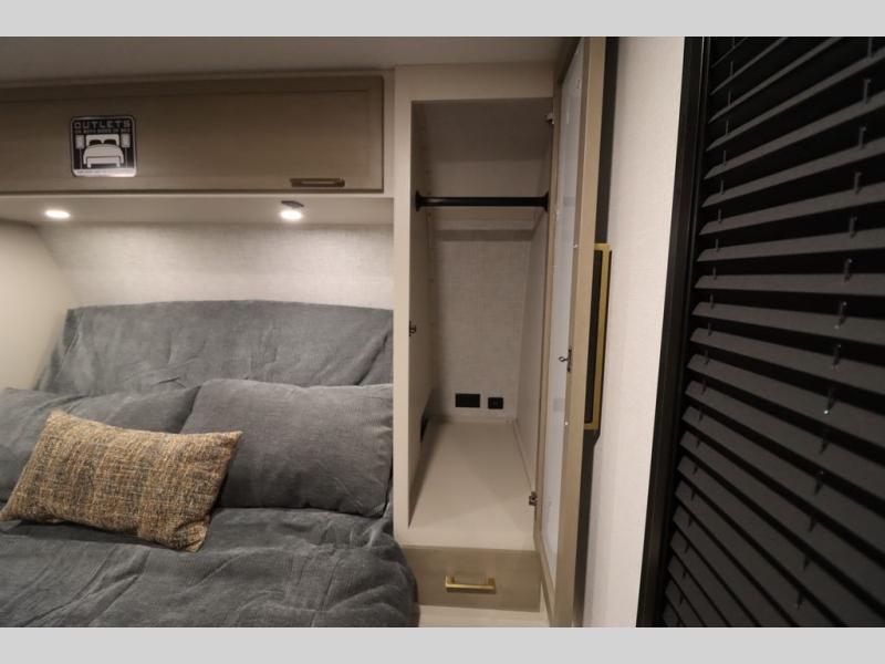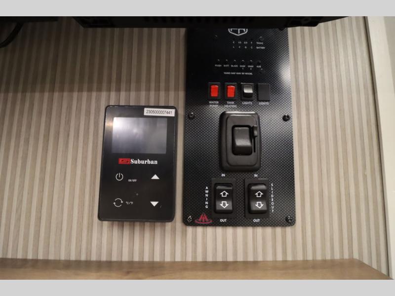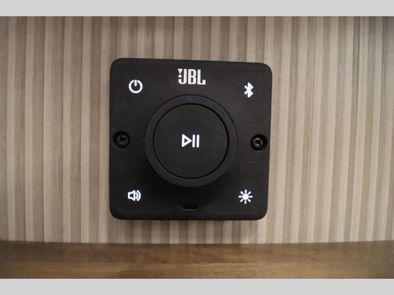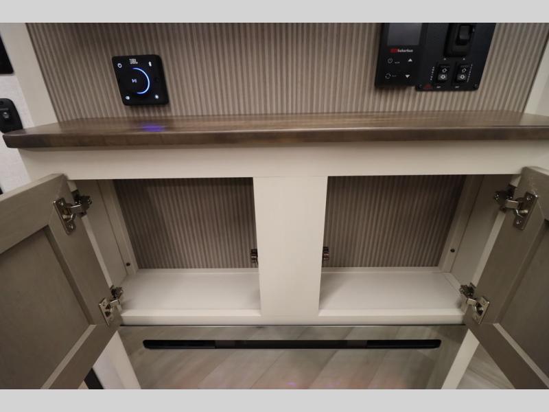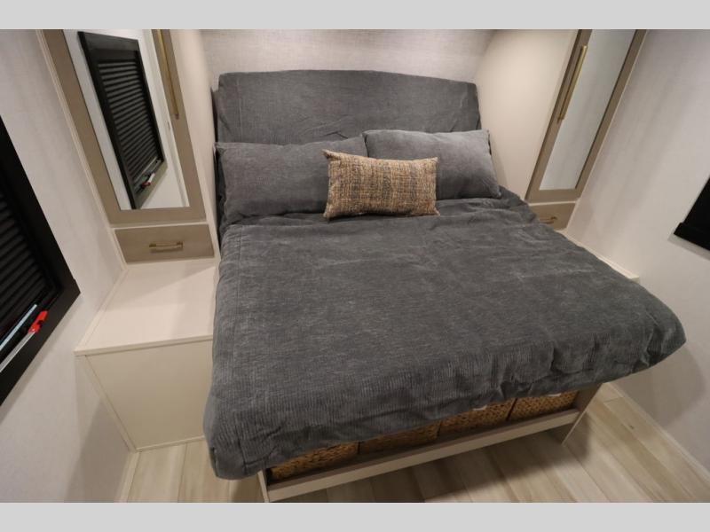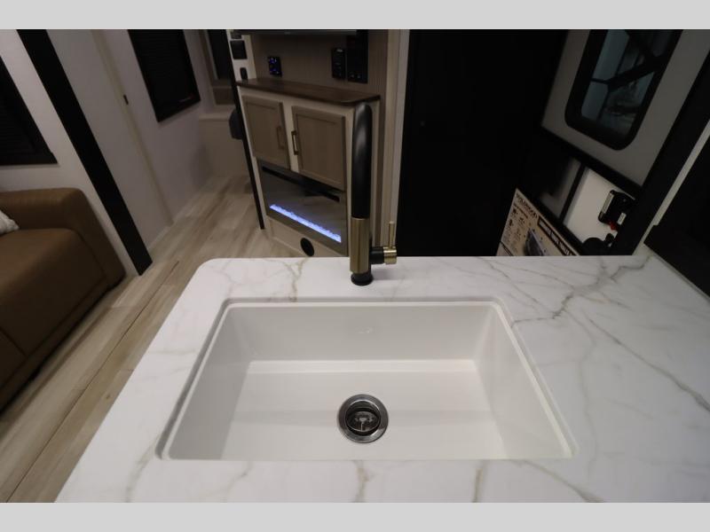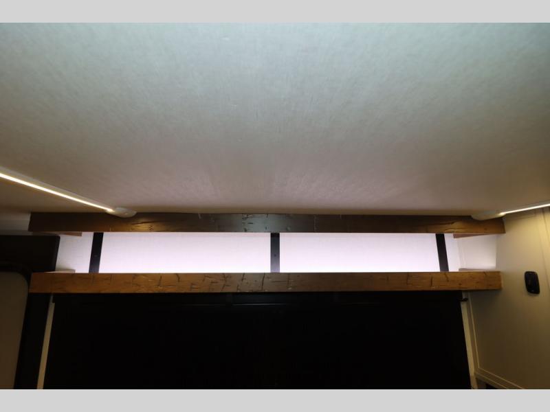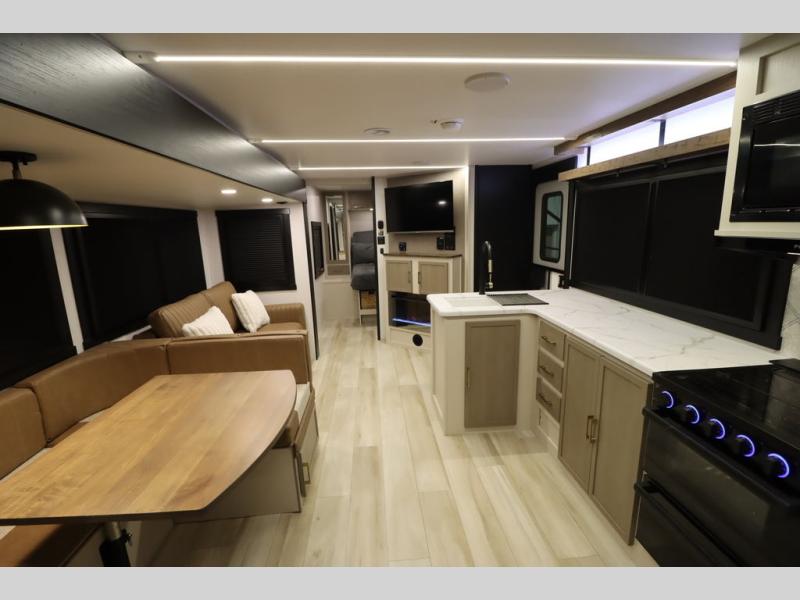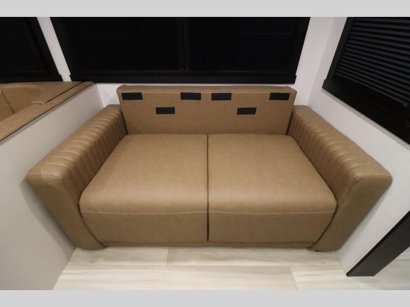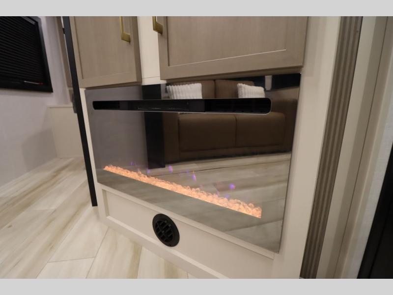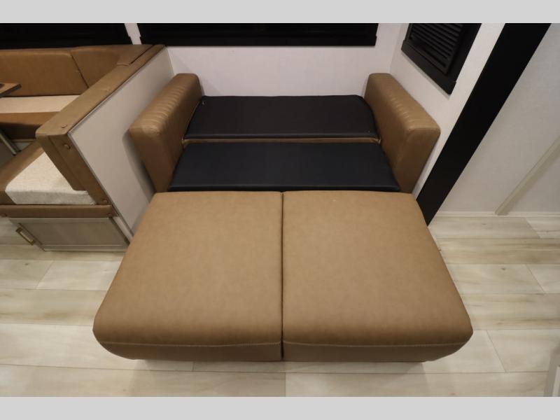 This dual entry travel trailer is the perfect unit to travel with a larger group since there is sleeping for ten! There are double-size bunks in the rear corner, a queen bed with Versa Tilt in the front private bedroom, plus a U-shaped dinette and tri-fold sofa in the main living area. The rear corner bath includes a walk-in shower with a skylight, a spacious linen closet, and one of the dual entry doors for added convenience. The chef of your group will love the camp kitchen window with shelves above for spices, and there is an exterior griddle and mount if they enjoy cooking outdoors. This unit also includes an entertainment center with a 40" LED Smart TV and a fireplace for a cozy evening indoors, and the entry pantry will be perfect to keep snacks stocked!