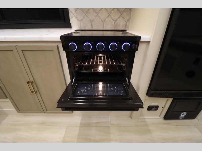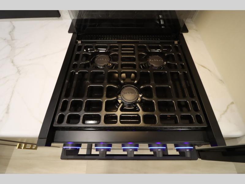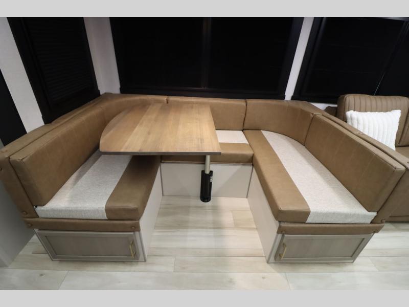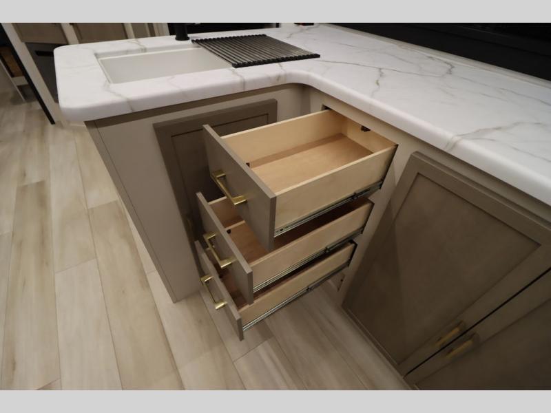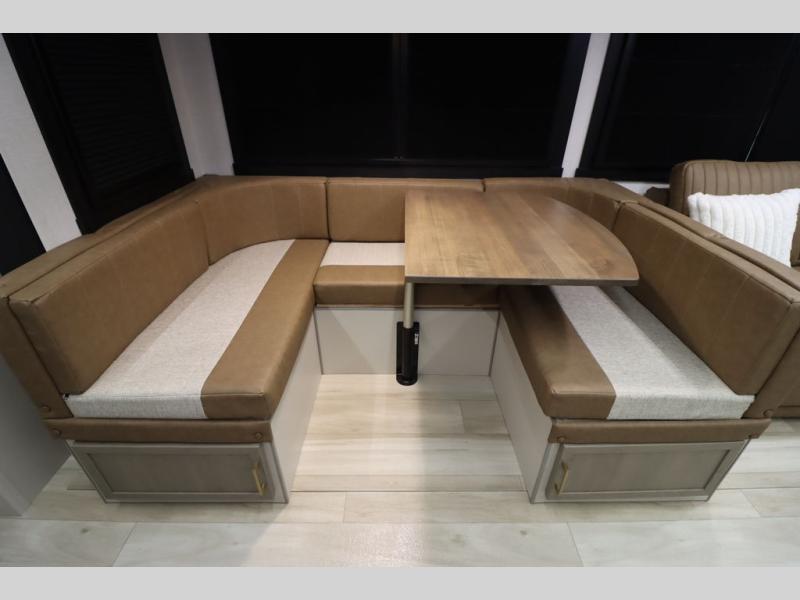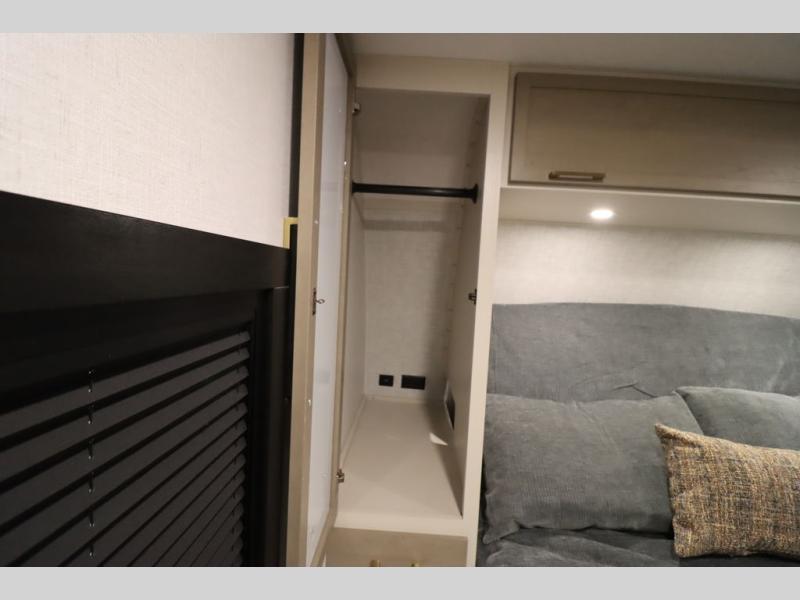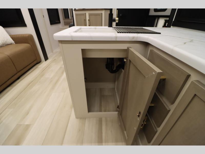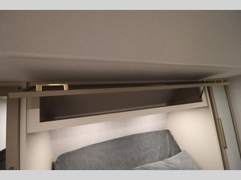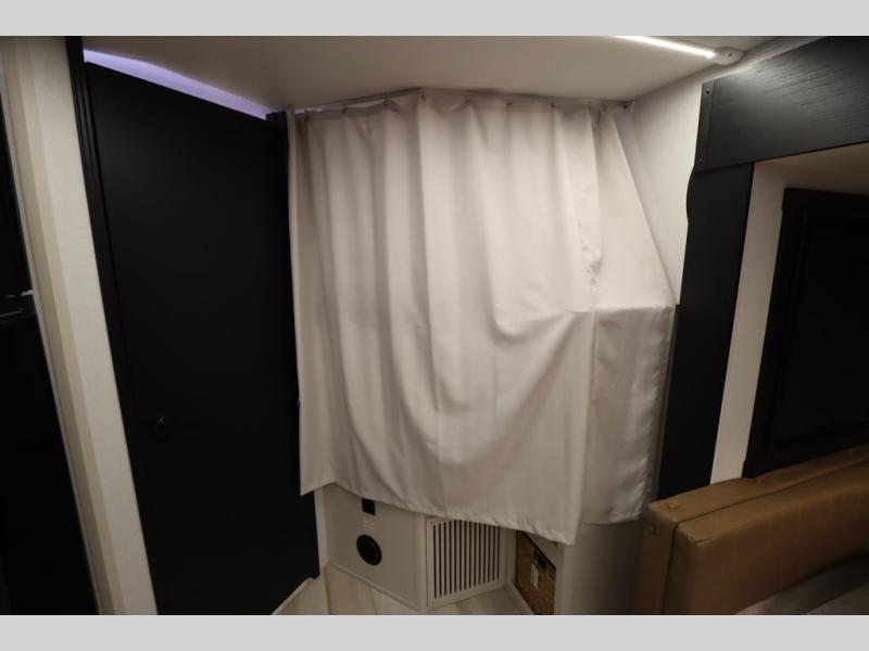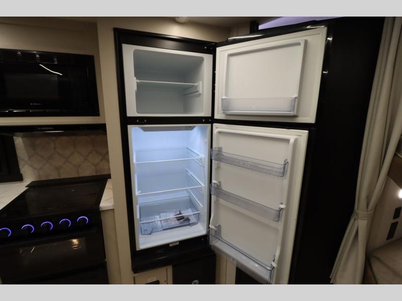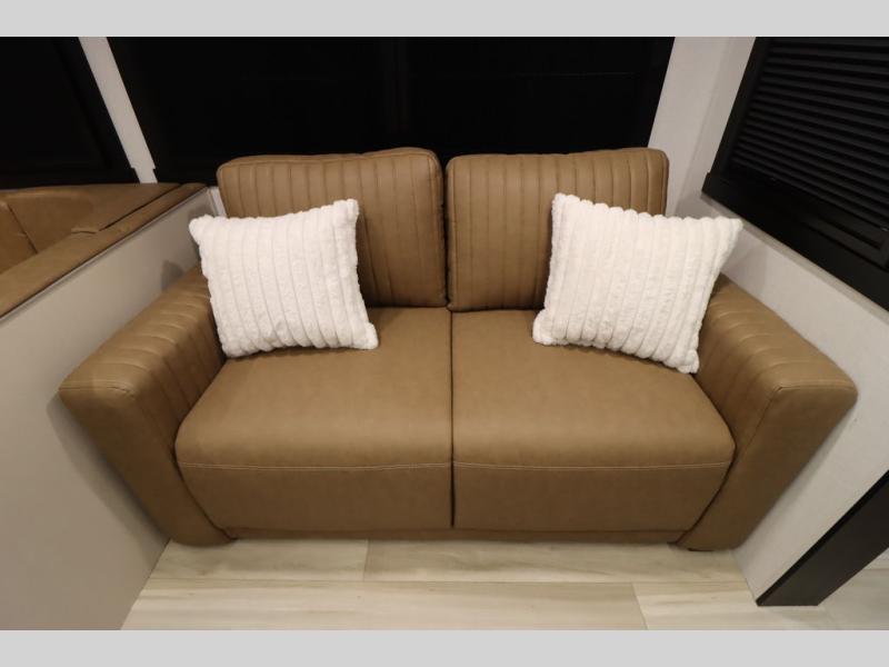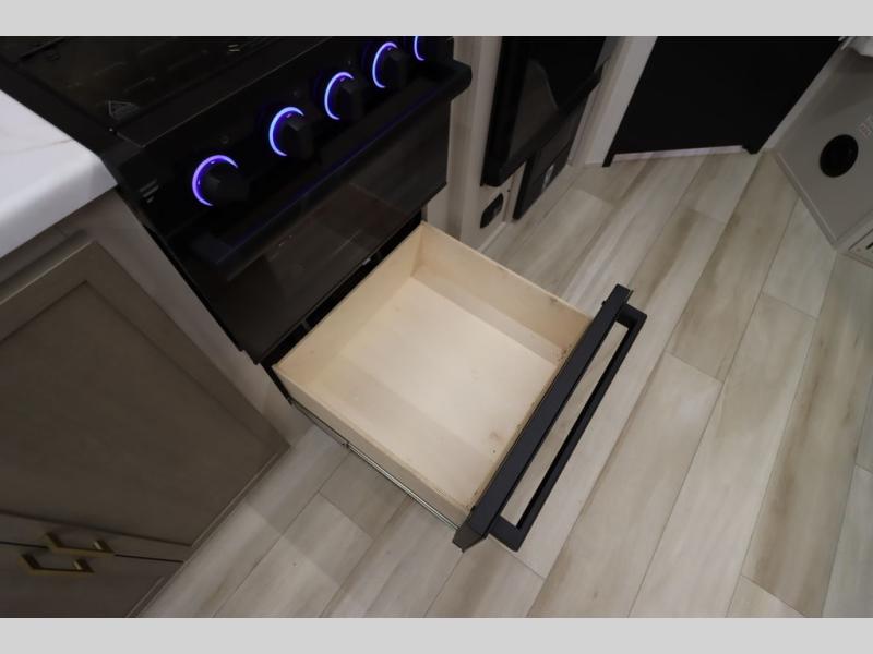 This dual entry travel trailer is the perfect unit to travel with a larger group since there is sleeping for ten! There are double-size bunks in the rear corner, a queen bed with Versa Tilt in the front private bedroom, plus a U-shaped dinette and tri-fold sofa in the main living area. The rear corner bath includes a walk-in shower with a skylight, a spacious linen closet, and one of the dual entry doors for added convenience. The chef of your group will love the camp kitchen window with shelves above for spices, and there is an exterior griddle and mount if they enjoy cooking outdoors. This unit also includes an entertainment center with a 40" LED Smart TV and a fireplace for a cozy evening indoors, and the entry pantry will be perfect to keep snacks stocked!