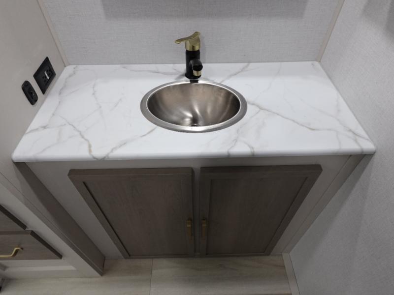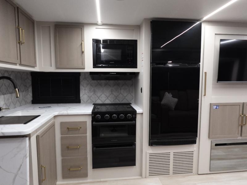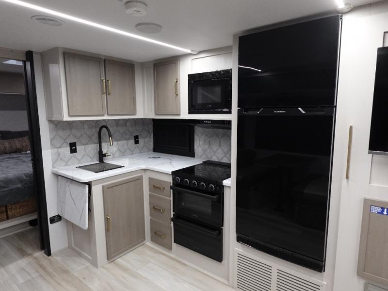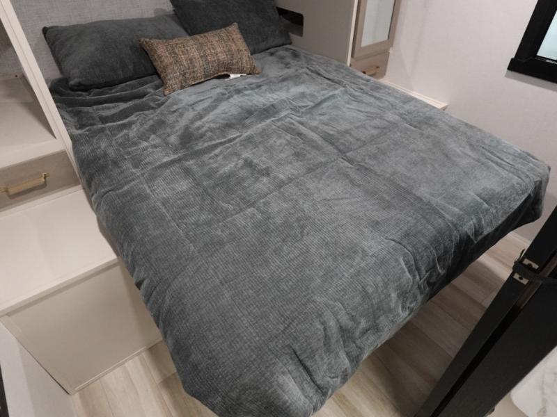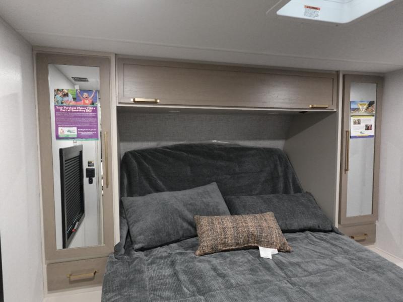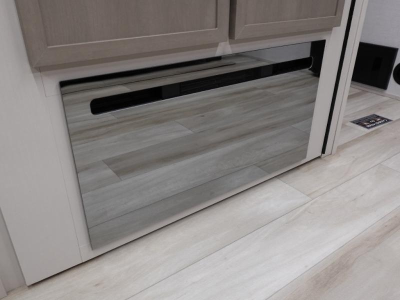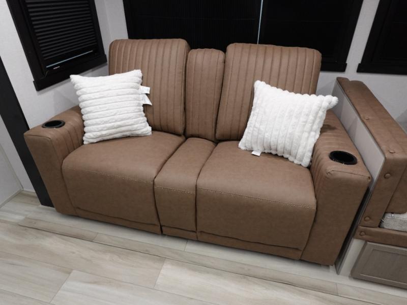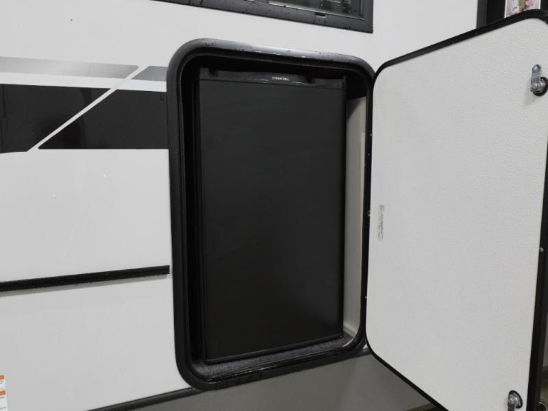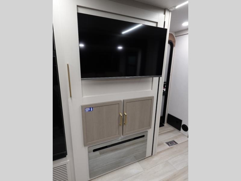 Whether it's a couples night or family night, you can enjoy the spacious living and kitchen area thanks to the large slide out. Grab your favorite snacks from the walk-in pantry/closet and head to the booth dinette and/or the theater seats with cupholders across from the entertainment center which also features a fireplace. You will be able to easily whip up your best meals and clean up even easier with the L-shaped countertop with an extension. The front private bedroom features an RV queen bed for you to get a good night's rest with wardrobes on either side to keep the room tidy, and the rear bathroom is spacious with a sliding door, a wardrobe and linen closet!