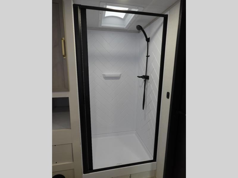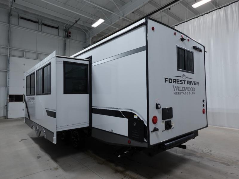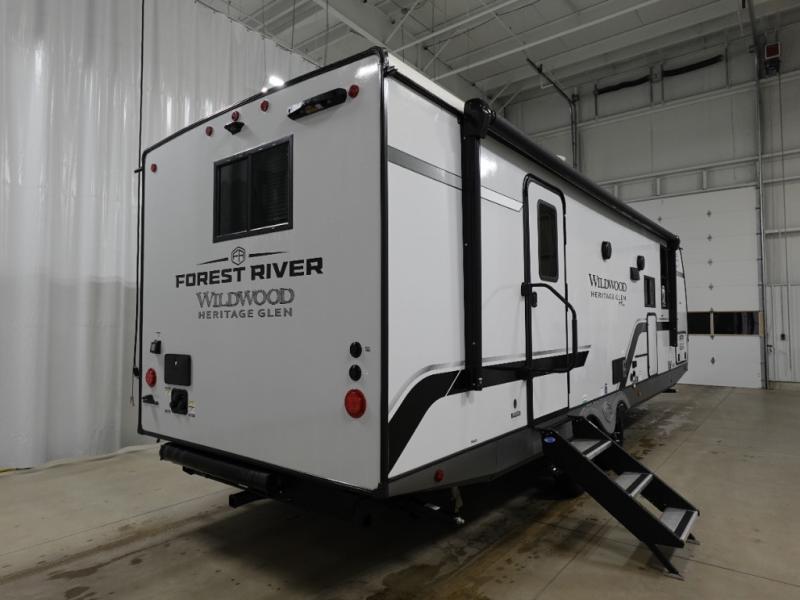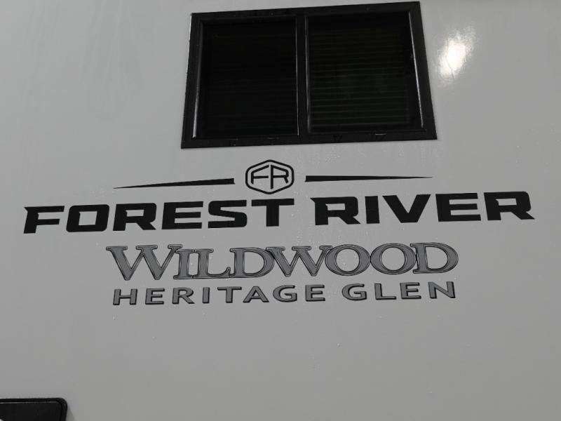 The Wildwood Heritage Glen Hyper-Lyte travel trailer by Forest River offers stability with a wide stance axle system, easy setup with a power tongue jack with an LED docking light, and safe entry with the Step Above aluminum entry steps. The XL Max-Tint panoramic window(s) in the main slide bring the outside inside, plus the kitchen offers a recessed glass stove top cover, a Midnight glass range hood and microwave, plus more. You will also find a back-up camera prep and solar prep, an outdoor shower, black-accented upgraded aluminum wheels, and many more exterior conveniences.