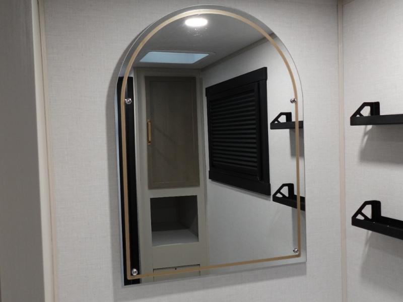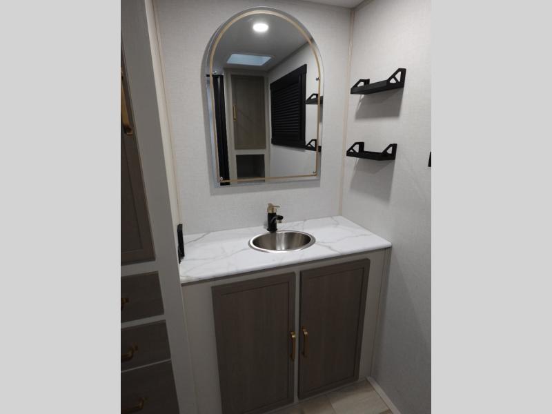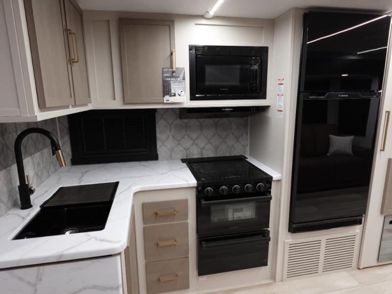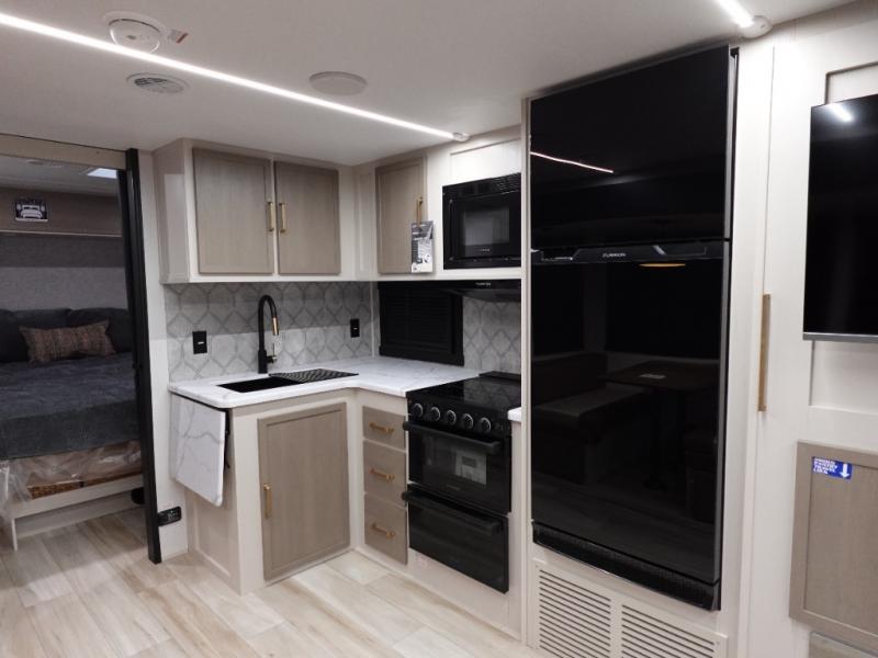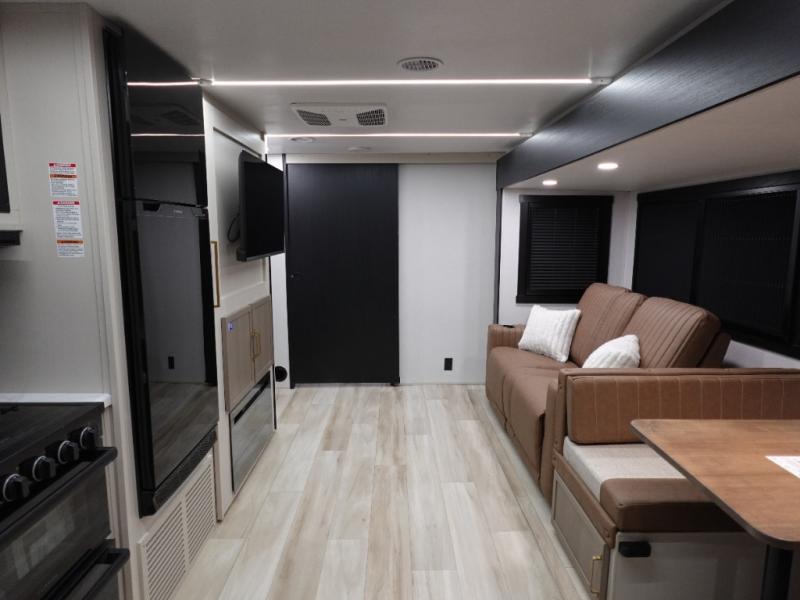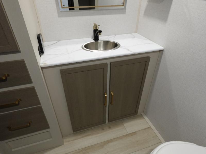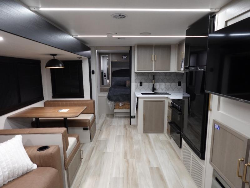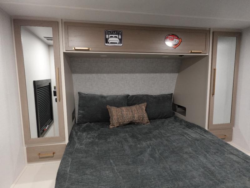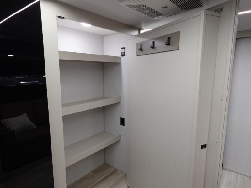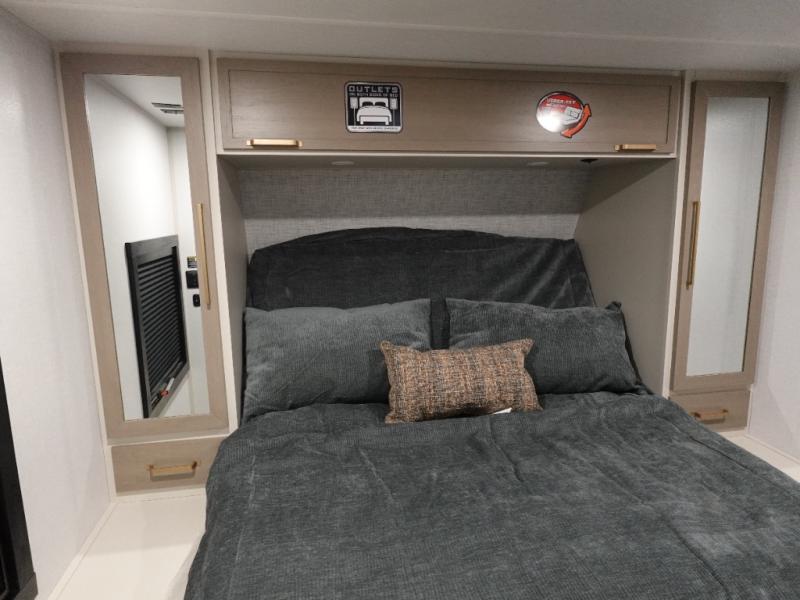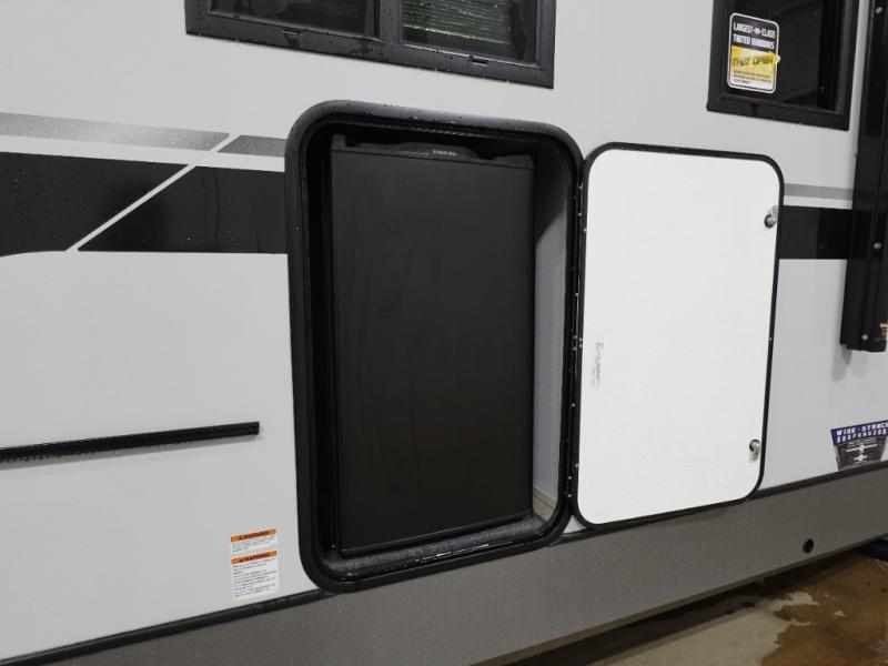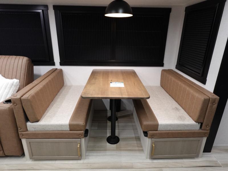 Whether it's a couples night or family night, you can enjoy the spacious living and kitchen area thanks to the large slide out. Grab your favorite snacks from the hidden storage behind the swing-open entertainment center and head to the booth dinette and/or the theater seats with cupholders. You will be able to easily whip up your best meals and clean up even easier with the L-shaped countertop with an extension. The front private bedroom features a queen bed with Versa Tilt to get a good night's rest with wardrobes on either side to keep the room tidy, and the rear bathroom is spacious with a sliding door and two linen closets!