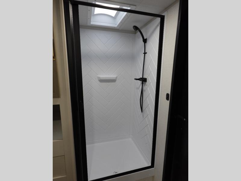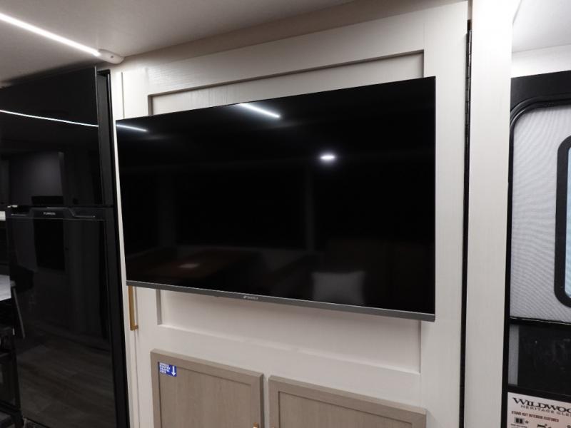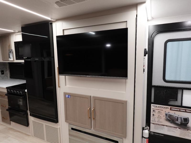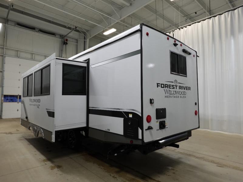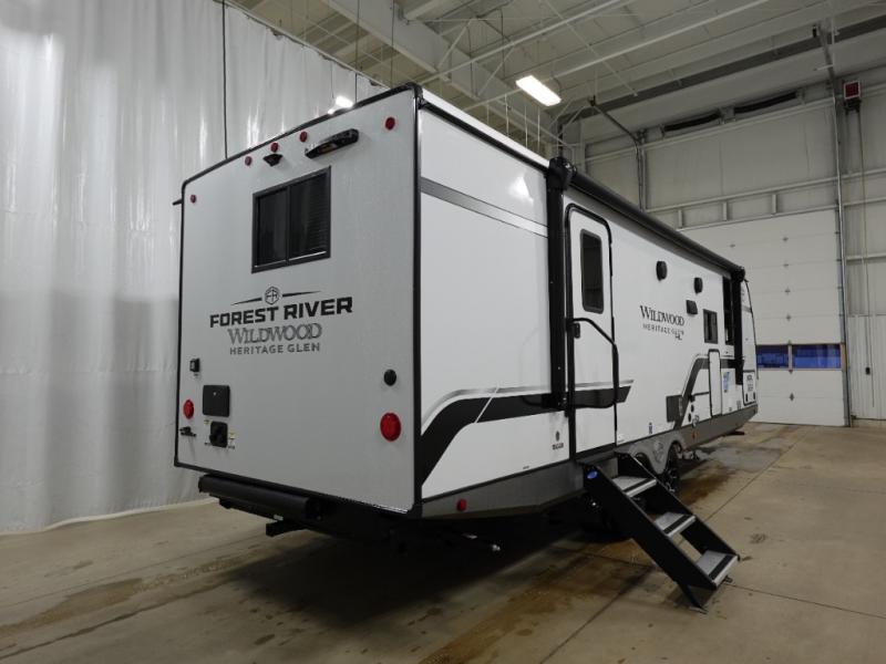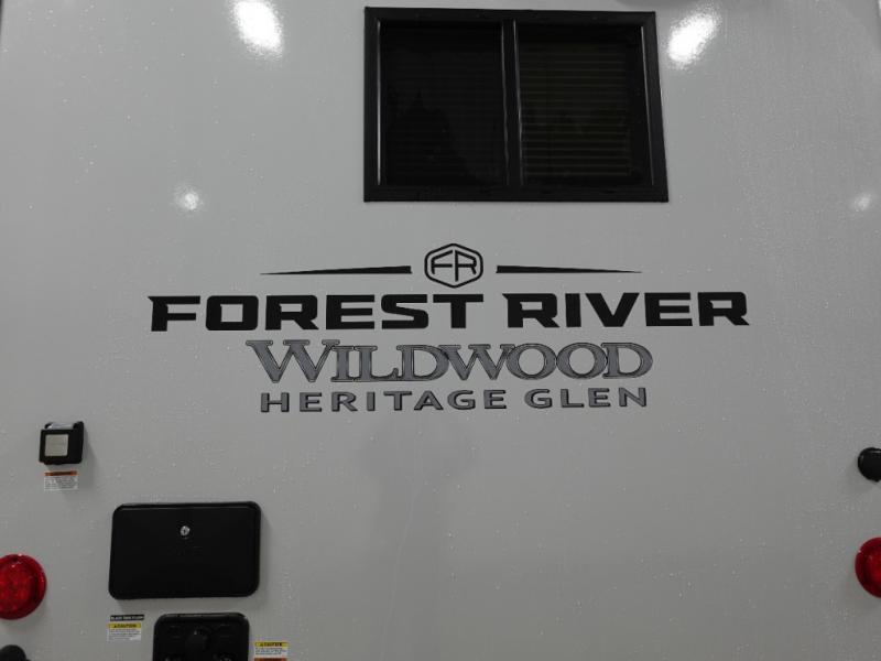The Wildwood Heritage Glen Hyper-Lyte travel trailer by Forest River offers stability with a wide stance axle system, easy setup with a power tongue jack with an LED docking light, and safe entry with the Step Above aluminum entry steps. The interior includes Temple Cherry cabinetry with matte gold hardware, hidden hinges on the cabinet doors, and a residential single bowl undermount sink. You will also find a back-up camera prep and solar prep, an outdoor shower, Maxxis radial tires, and many more exterior conveniences.