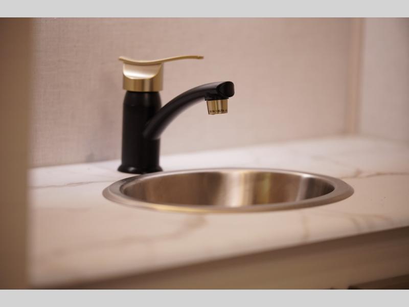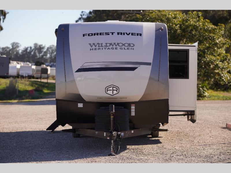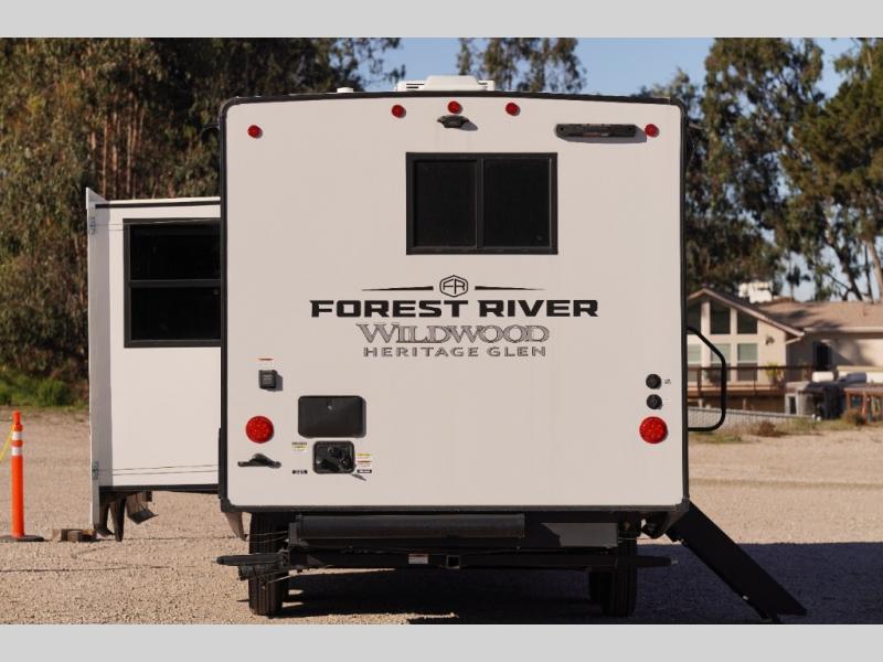 The Wildwood Heritage Glen Hyper-Lyte travel trailer by Forest River offers stability with a wide stance axle system, easy setup with a power tongue jack with an LED docking light, and safe entry with the Step Above aluminum entry steps. The interior includes Temple Cherry cabinetry with matte gold hardware, hidden hinges on the cabinet doors, and a residential single bowl undermount sink. You will also find a back-up camera prep and solar prep, an outdoor shower, Maxxis radial tires, and many more exterior conveniences.