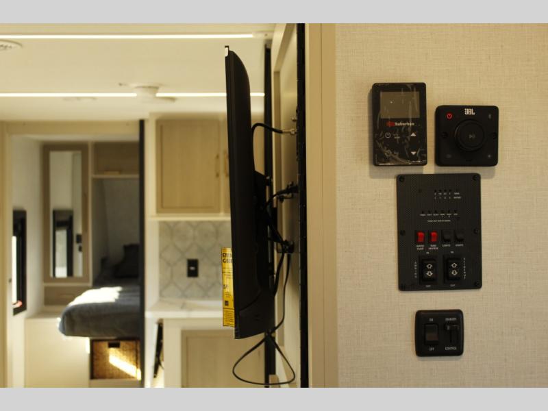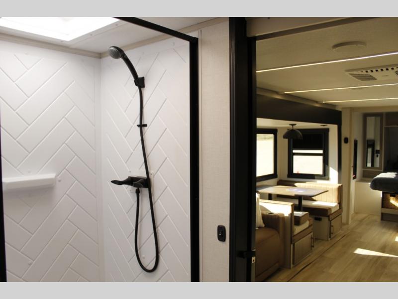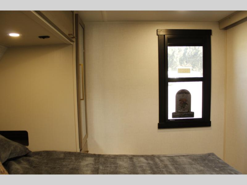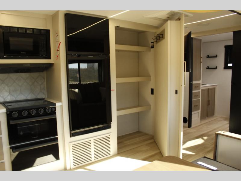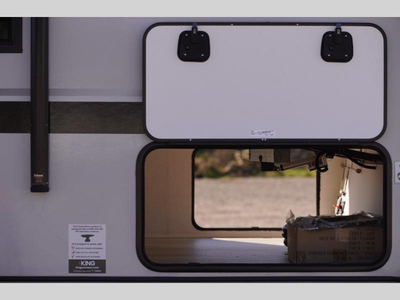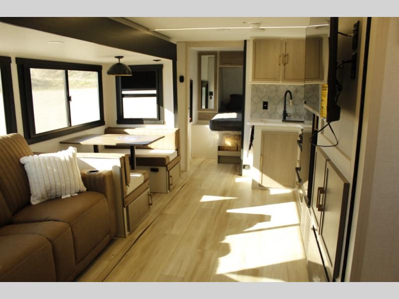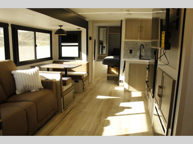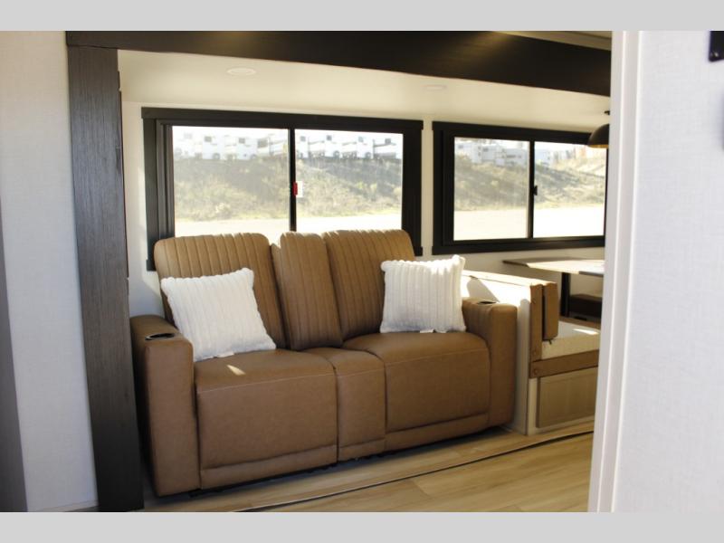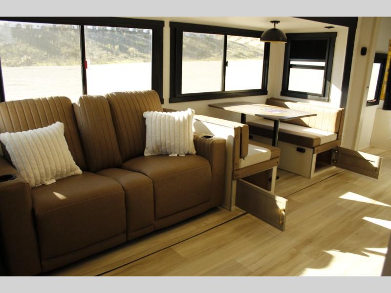 Whether it's a couples night or family night, you can enjoy the spacious living and kitchen area thanks to the large slide out. Grab your favorite snacks from the hidden storage behind the swing-open entertainment center and head to the booth dinette and/or the theater seats with cupholders. You will be able to easily whip up your best meals and clean up even easier with the L-shaped countertop with an extension. The front private bedroom features a queen bed with Versa Tilt to get a good night's rest with wardrobes on either side to keep the room tidy, and the rear bathroom is spacious with a sliding door and two linen closets!